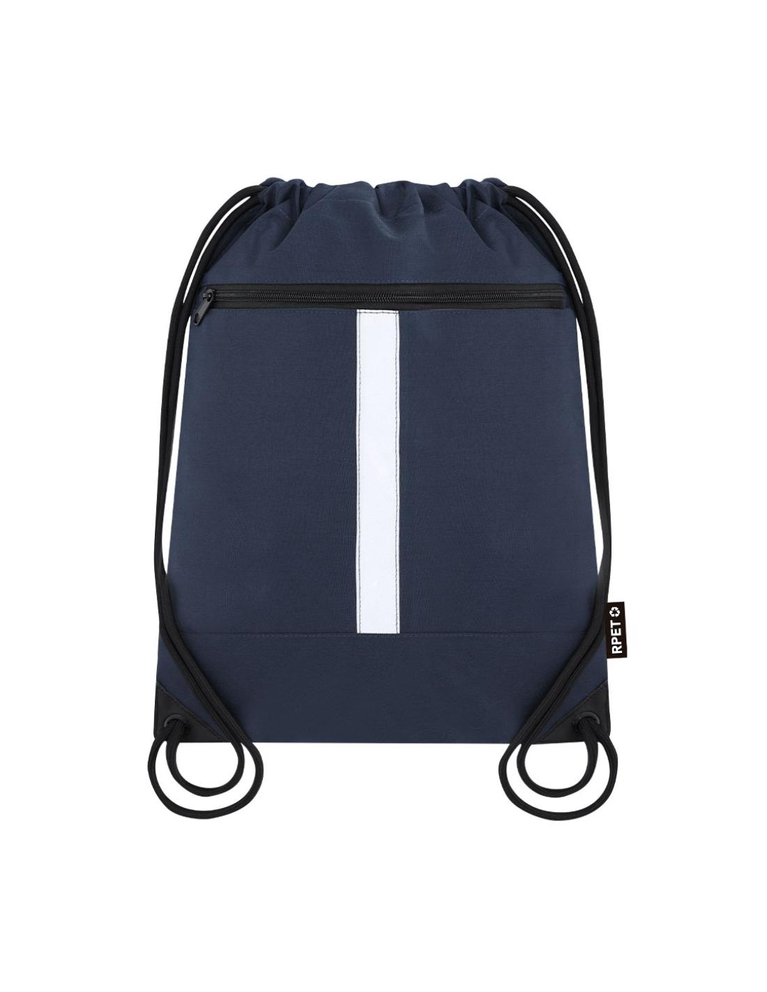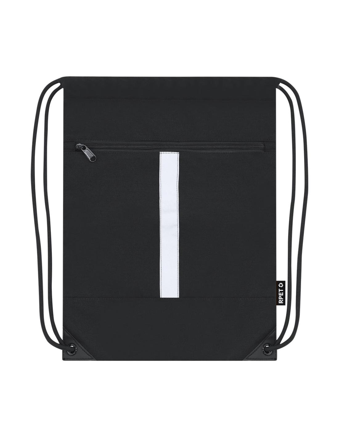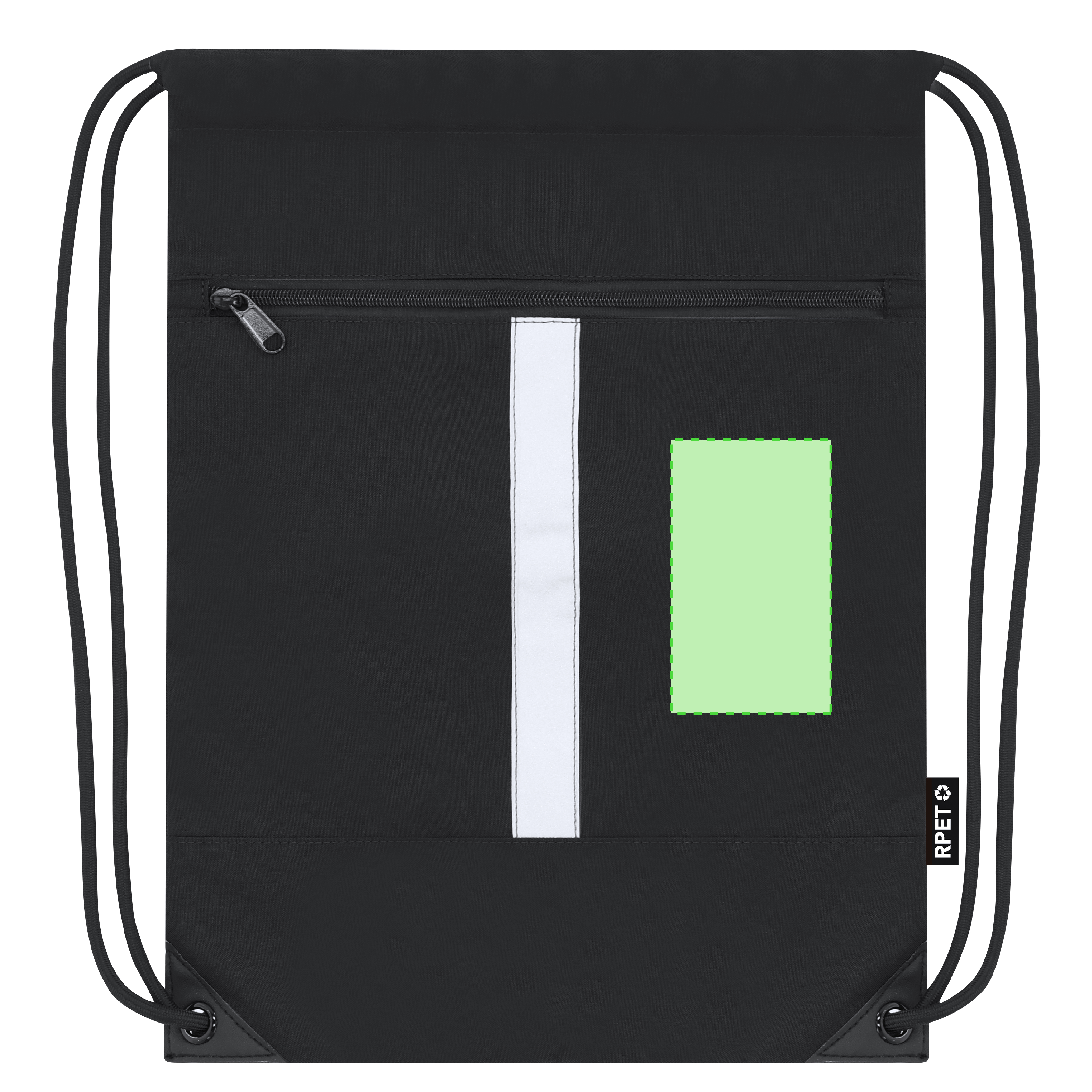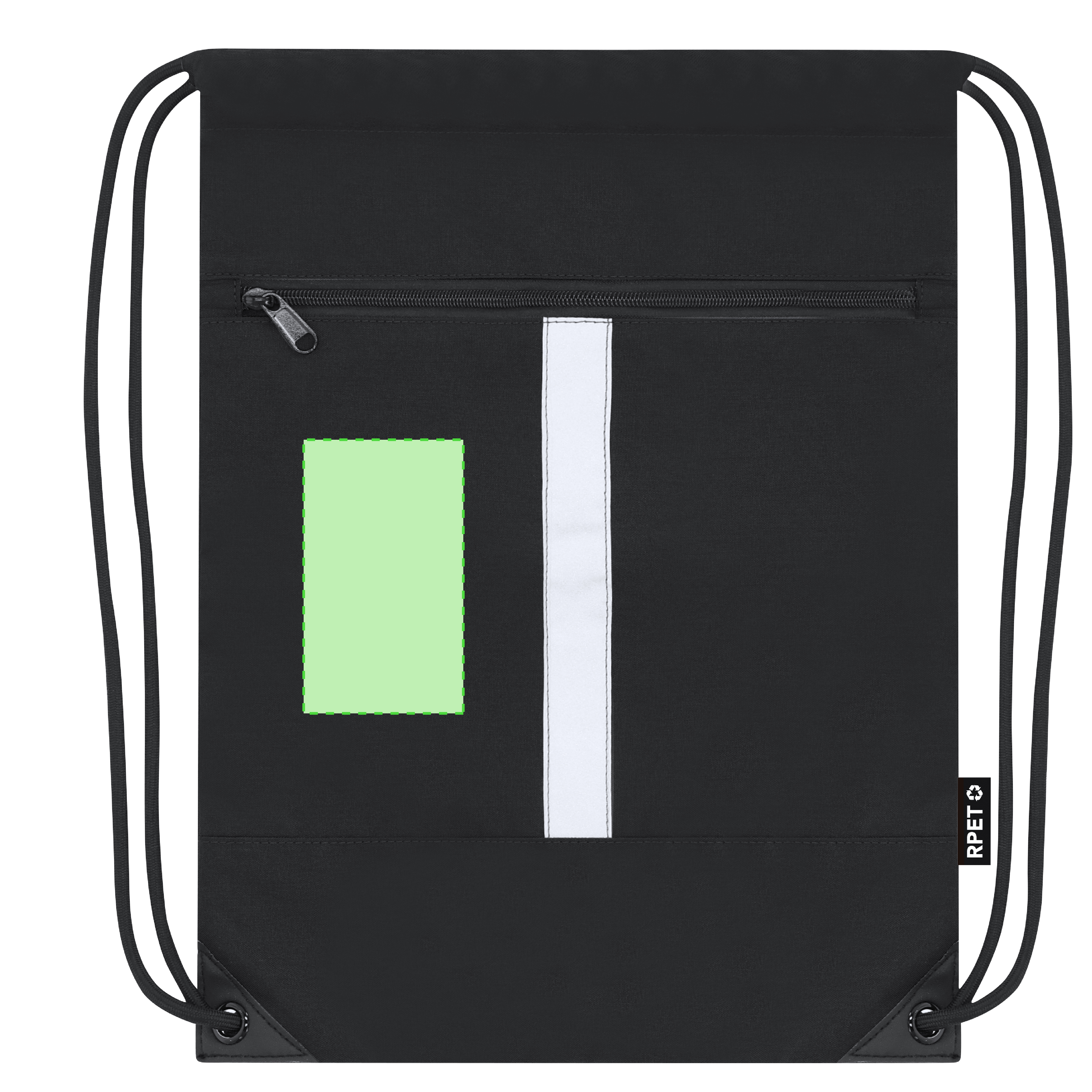 Mochila reflectante en Poliéster 300 RPET, con tira frontal reflectante. Cuenta con bolsillo en parte frontal. Cuerdas autocierre en color negro y esquinas reforzadas con argollas metálicas.