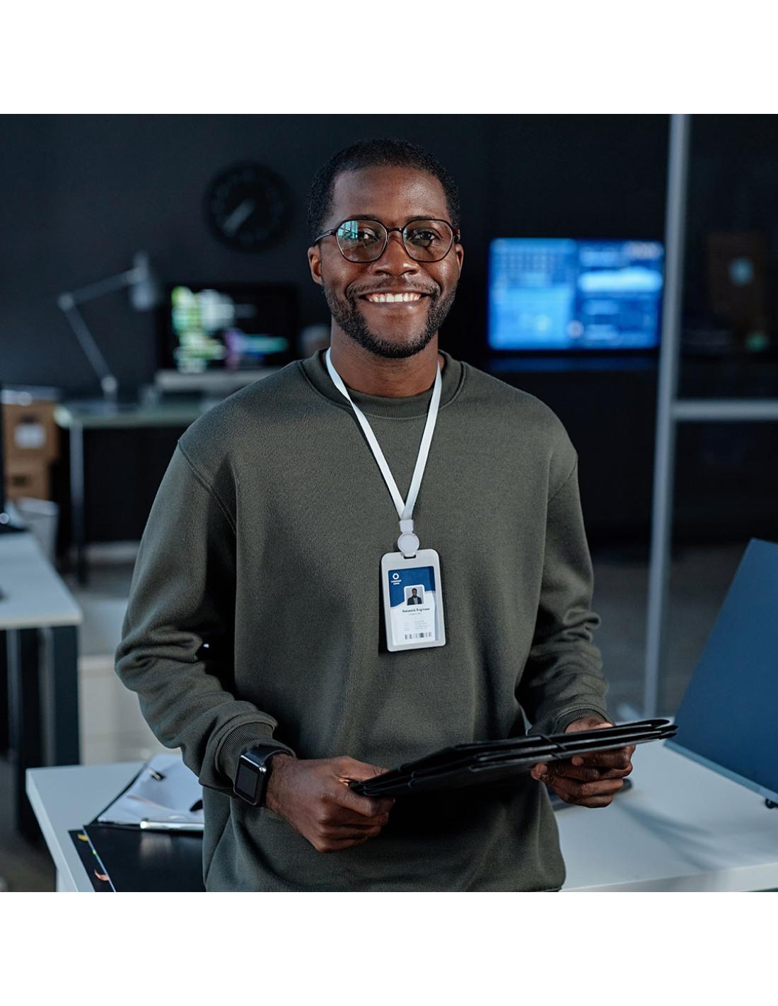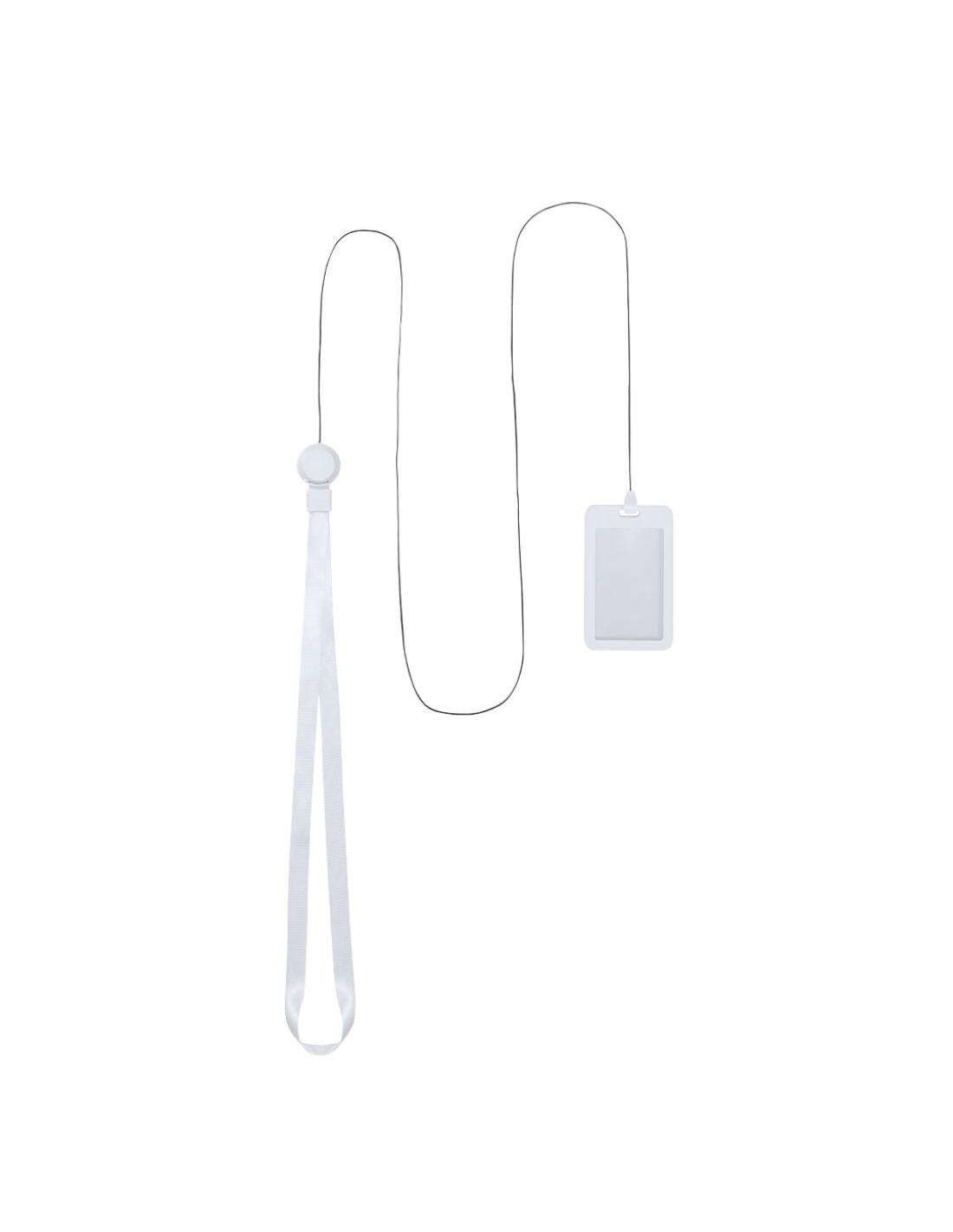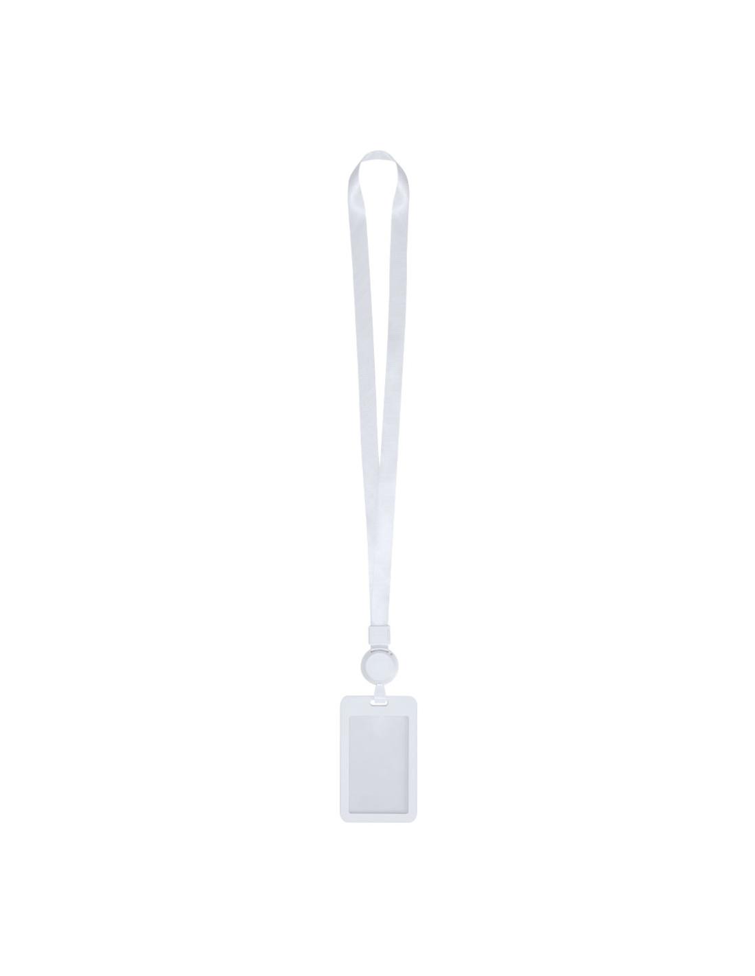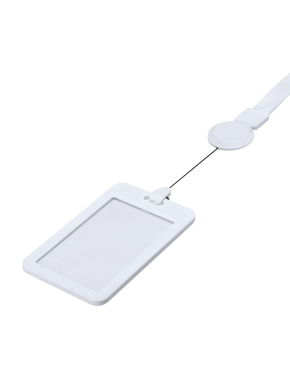 Identificador lanyard extensible. Portatarjetas en ABS desmontable con parte trasera opaca y parte frontal translúcida con enganche en clip. Cuerda extensible de hasta 70 cm y lanyard en poliéster blanco.