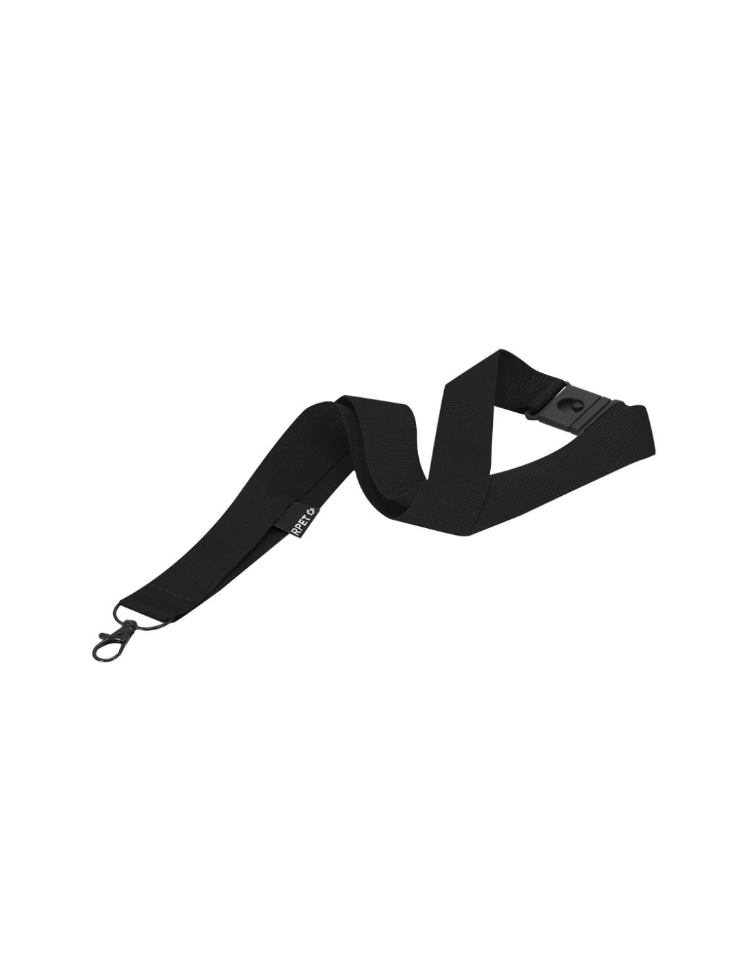 Lanyard en suave poliéster RPET. Mosquetón metálico giratorio en color negro y sistema de cierre de seguridad. Incluye distintiva etiqueta RPET.