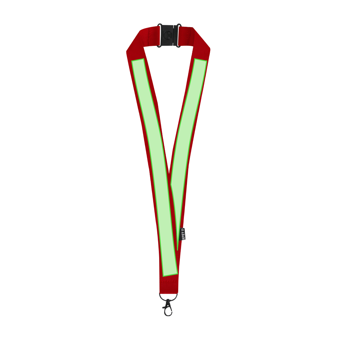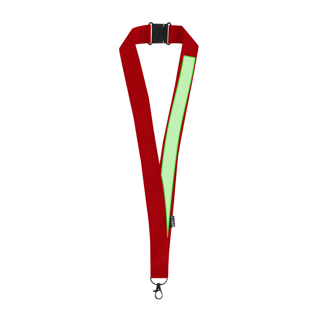 Lanyard en suave poliéster RPET. Mosquetón metálico giratorio en color negro y sistema de cierre de seguridad. Incluye distintiva etiqueta RPET.