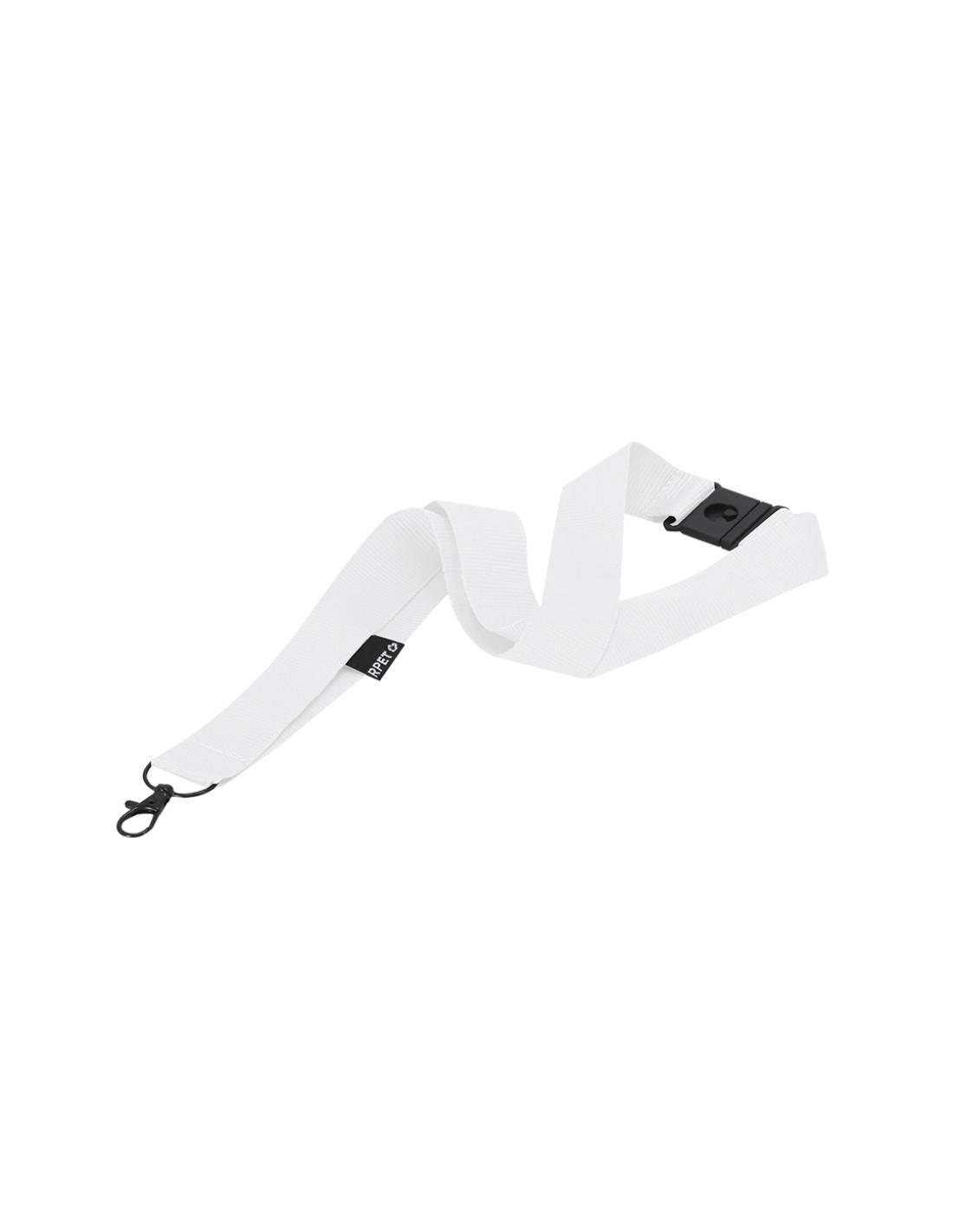 Lanyard en suave poliéster RPET. Mosquetón metálico giratorio en color negro y sistema de cierre de seguridad. Incluye distintiva etiqueta RPET.