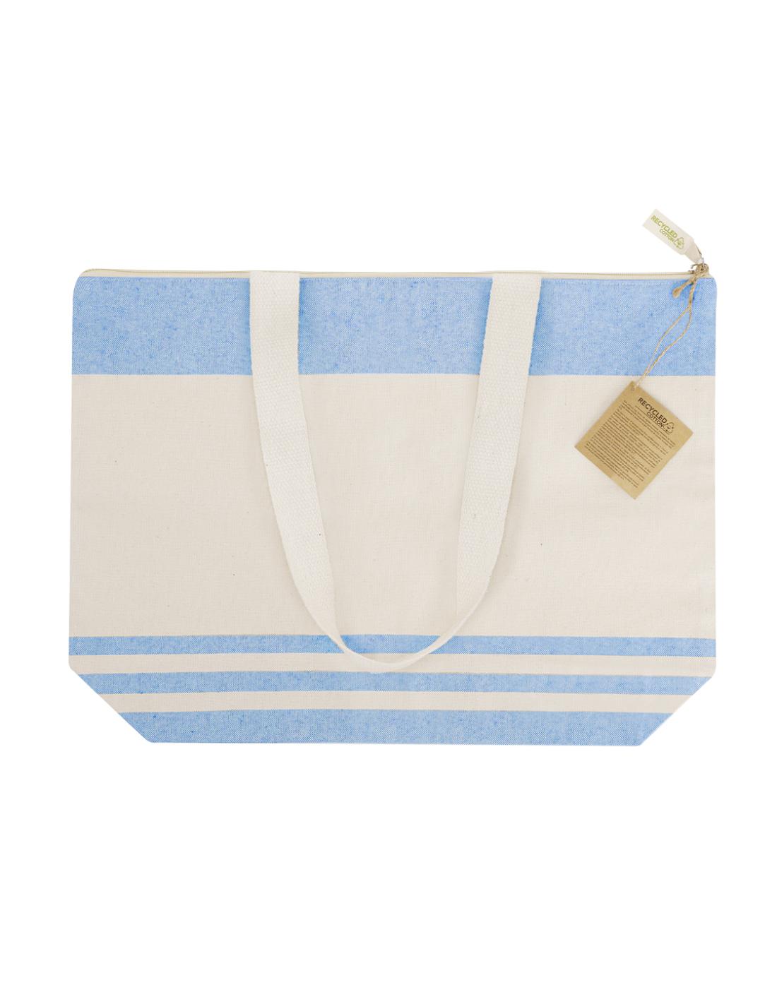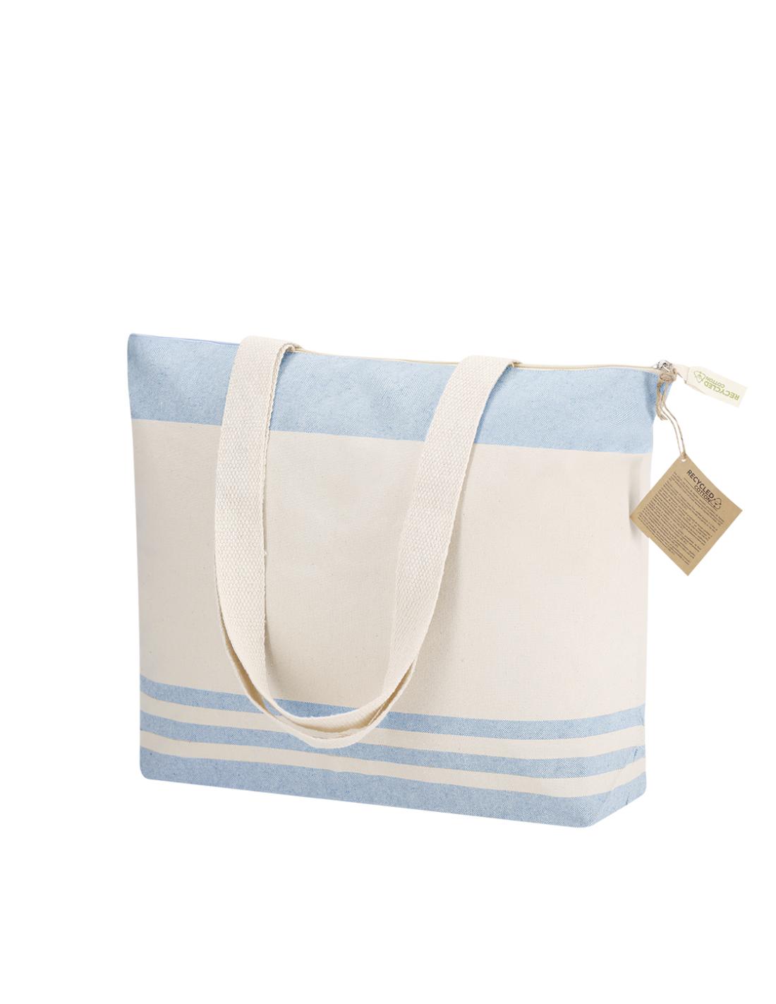 Bolsa confeccionada principalmente en algodón reciclado de 300 g/m2 en elegante tono natural con diseño a rayas horizontales en color. Con fuelle en base y laterales. Asas largas de 70cm con refuerzo, de acabado cosido. Logotipo en etiqueta en cremallera.