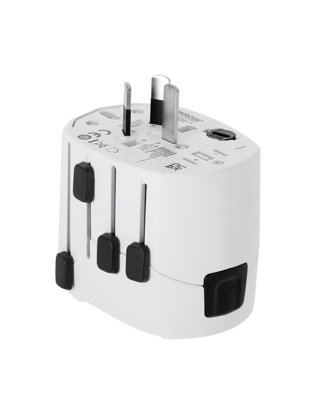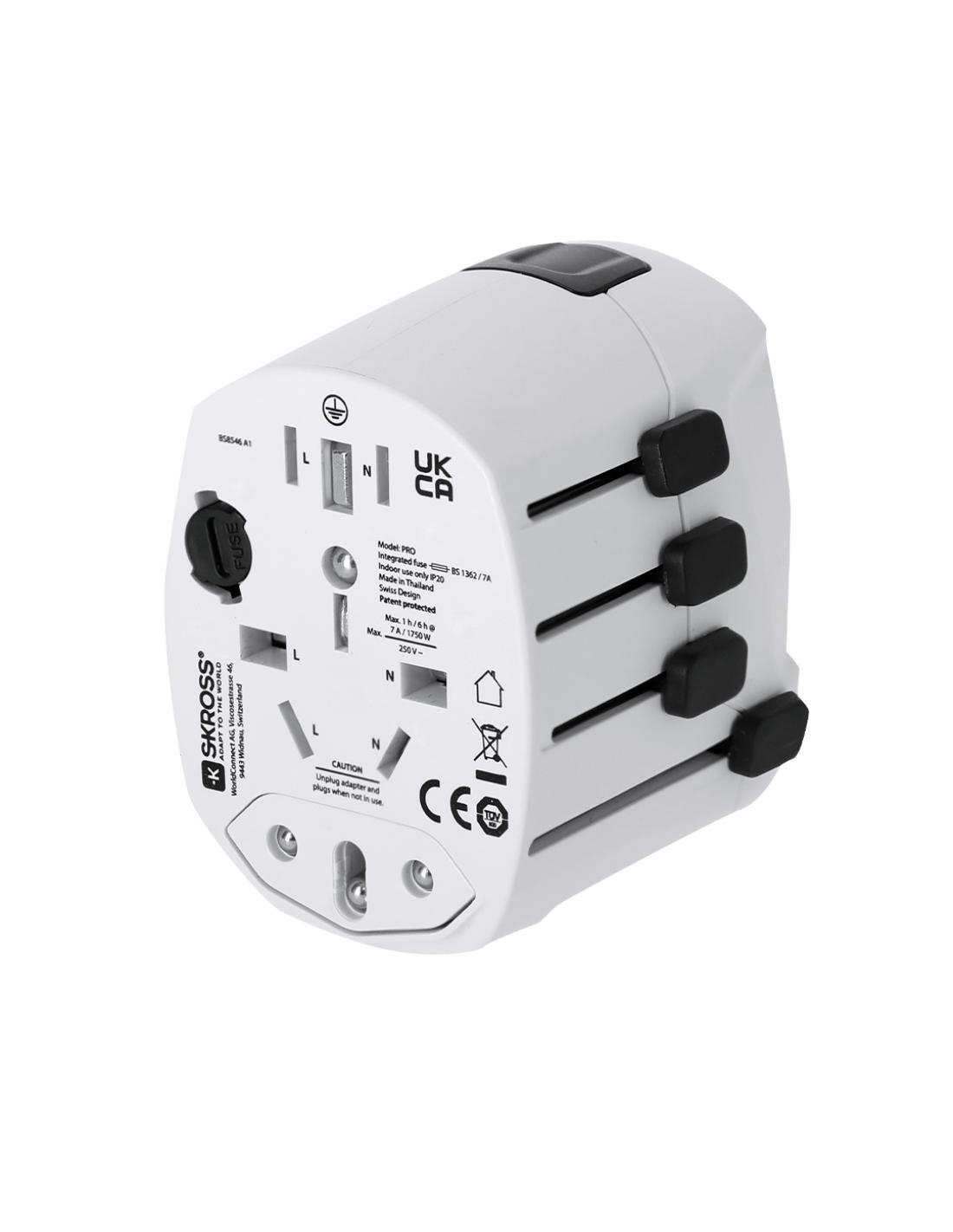 Completo adaptador de viaje universal marca SKROSS de diseño compacto y portable. Especialmente indicado para viajes y con adaptadores multi región. Apto para conectar dispositivos de alta potencia en cualquier lugar