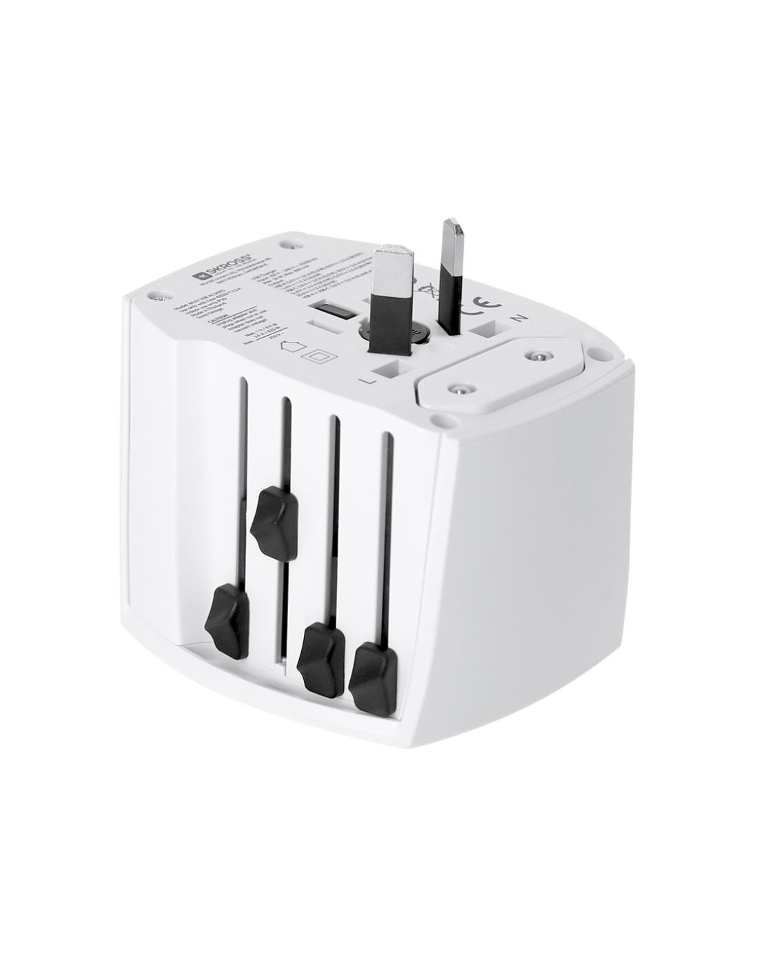 Completo adaptador de viaje universal marca SKROSS de diseño compacto y portable. Con salidas USB y Tipo C, especialmente indicado para viajes y con adaptadores multi región