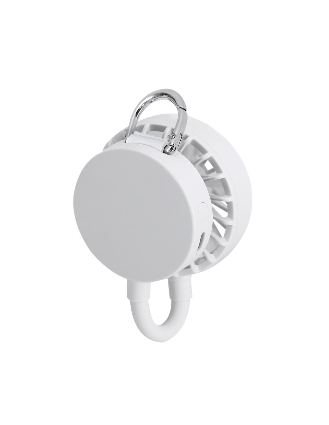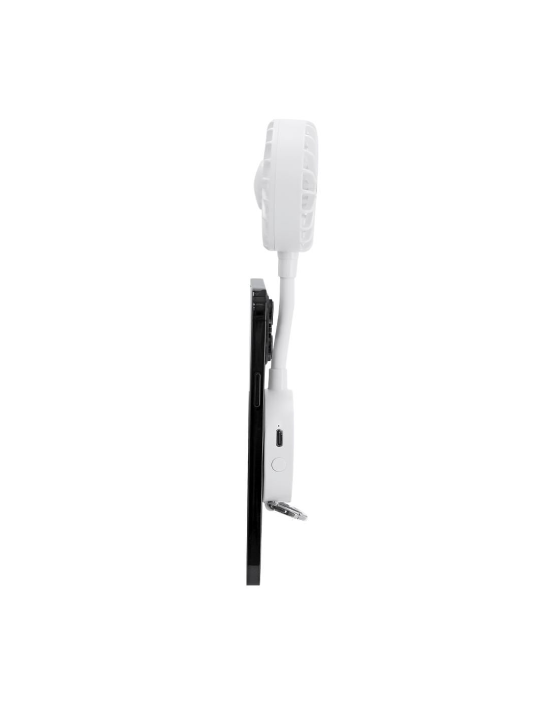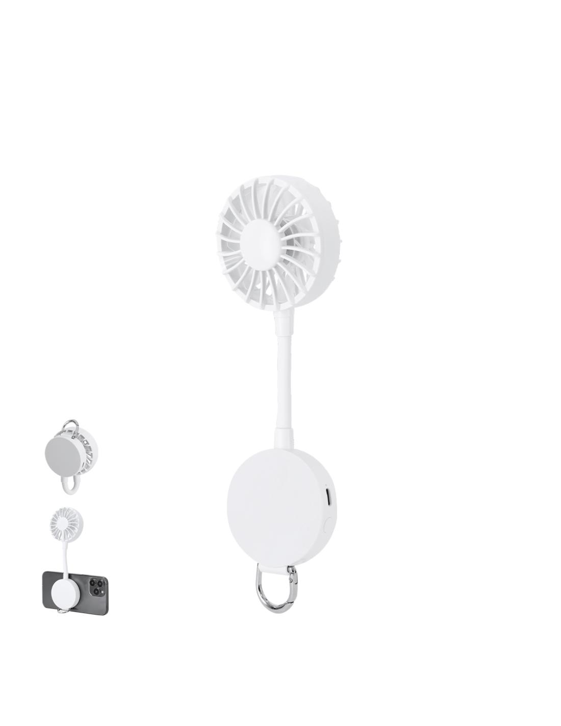 Ventilador multiposición con rotación de 360°, fabricado en ABS de color sólido y equipado con imán magnético para la sujeción con el móvil. Incluye soporte ajustable. En el extremo inferior cuenta con un mosquetón y anilla metálica. Dispone de 3 velocidades regulables mediante botón, e incorpora cable de carga USB A a USB C en el mismo color, junto con una batería de 300 mAh. Diseño compacto, funcional y portátil, ideal para uso personal en exteriores o interiores. Componentes resistentes y ensamblaje magnético para fácil plegado y transporte.