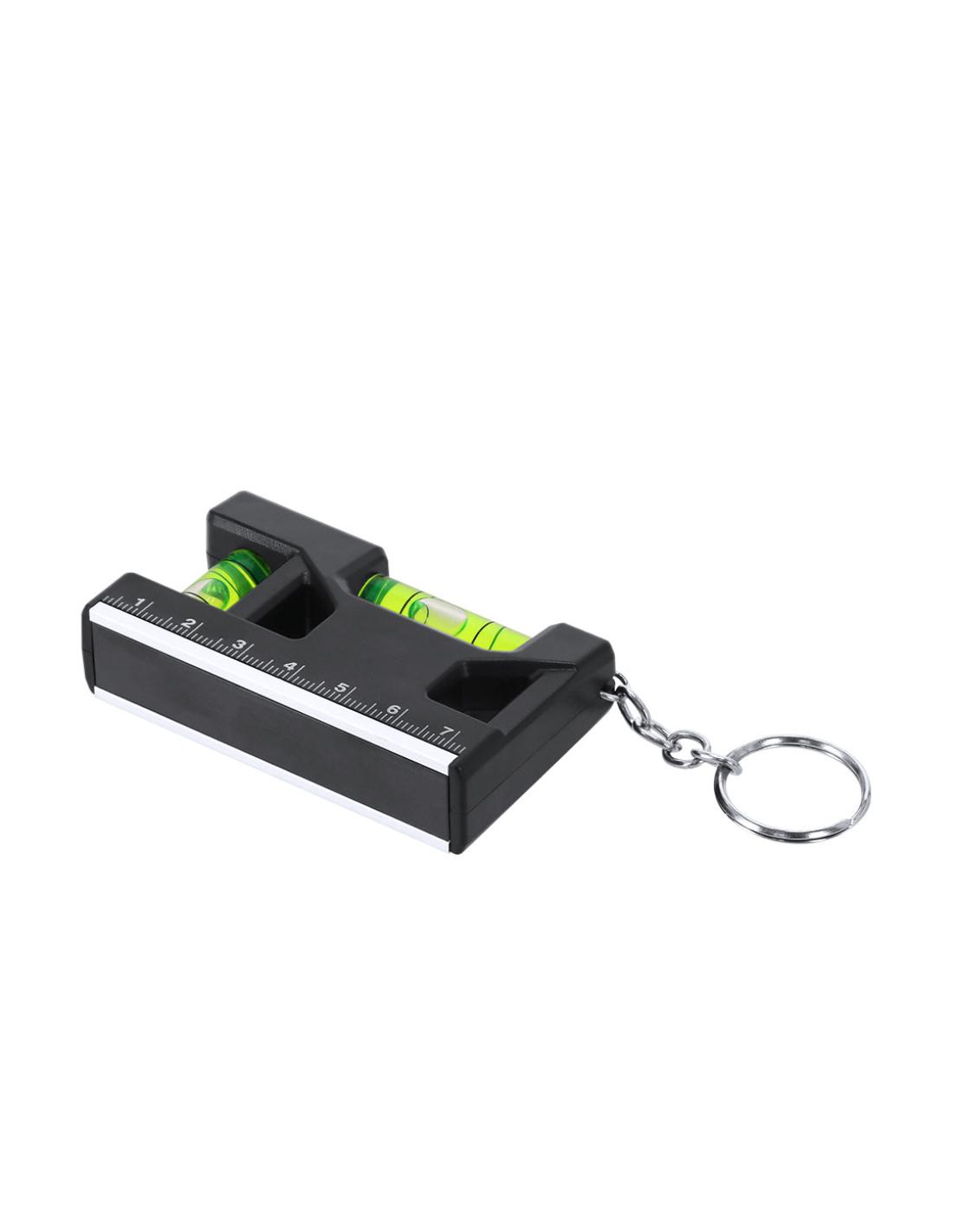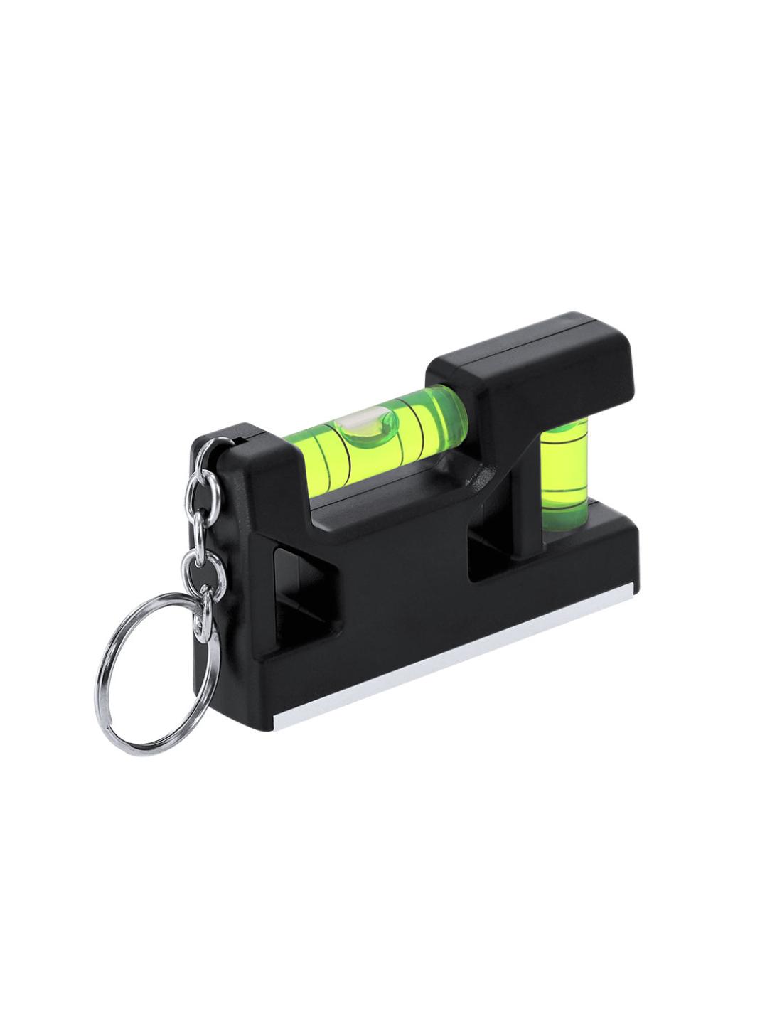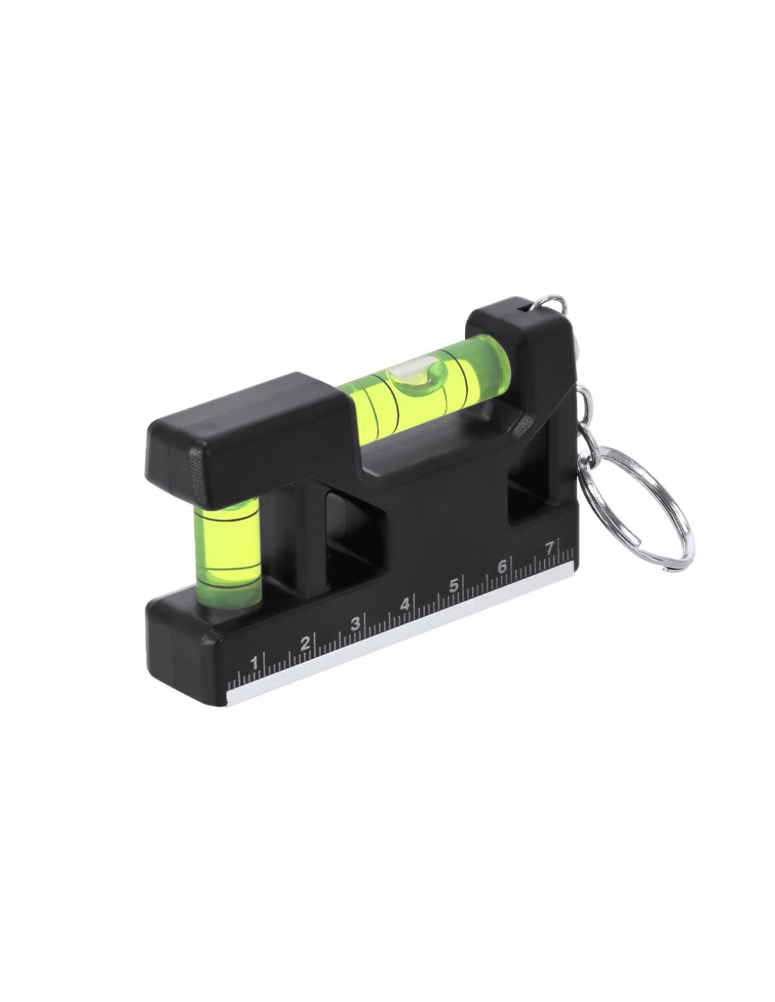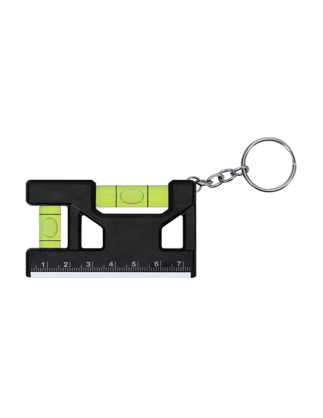 Llavero nivel multifunción magnético en base fabricado en ABS. Con regla de escala en centímetros. Nivel en posición horizontal y vertical. Con anilla metálica cromada. De tamaño compacto.