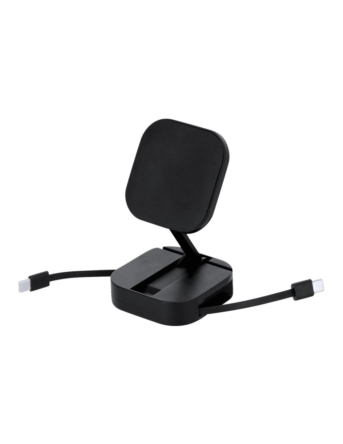 Cable cargador soporte magnético 2 en 1 de 60W, fabricado en ABS reciclado (RABS). Diseñado para la carga simultánea del smartphone a través del soporte magnético y mediante cable. Cuenta con soporte plegable con ajuste de posición. Cable retráctil de 80 cm con función de carga y transferencia de datos compatible con dispositivos que cuenten con entrada USB-C.