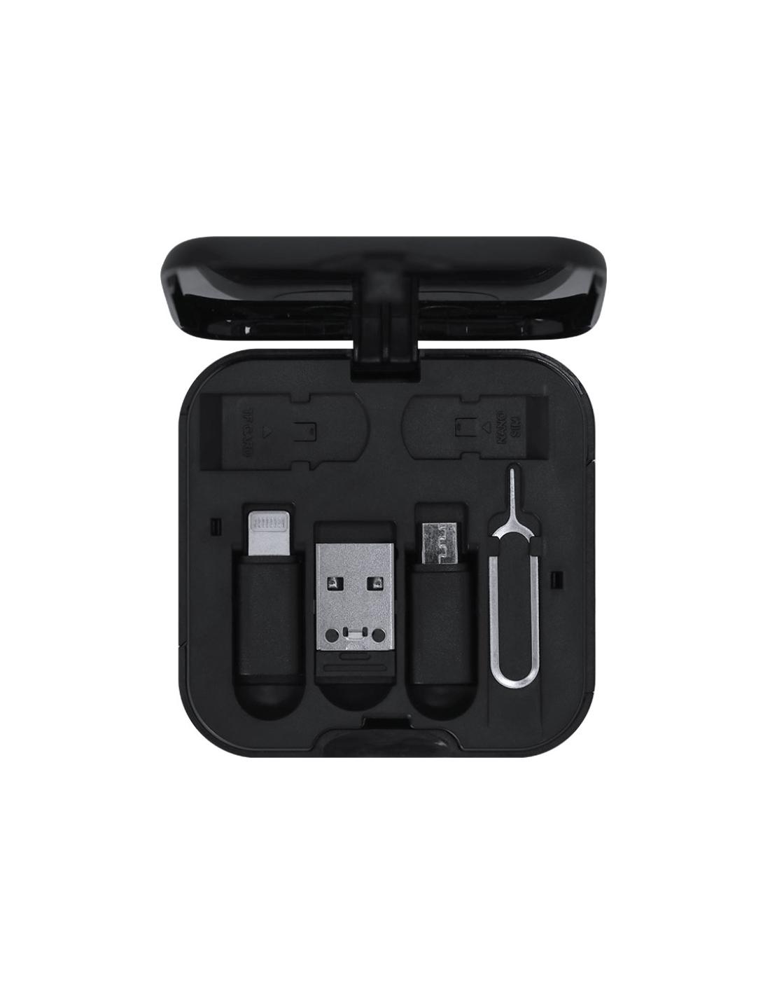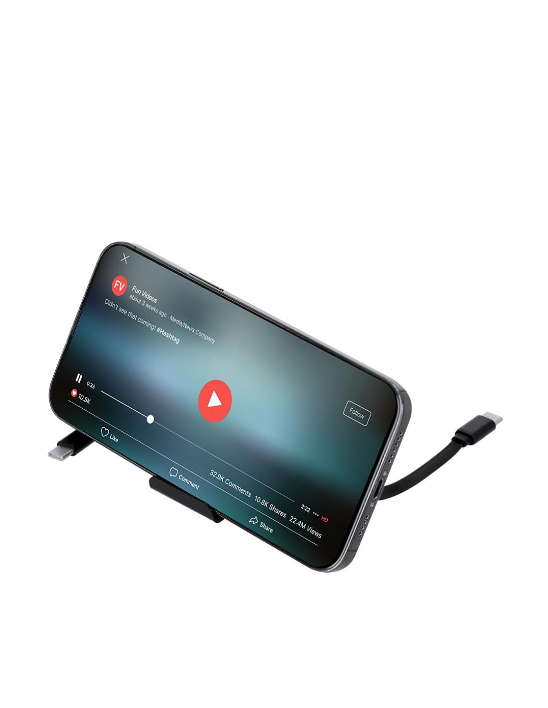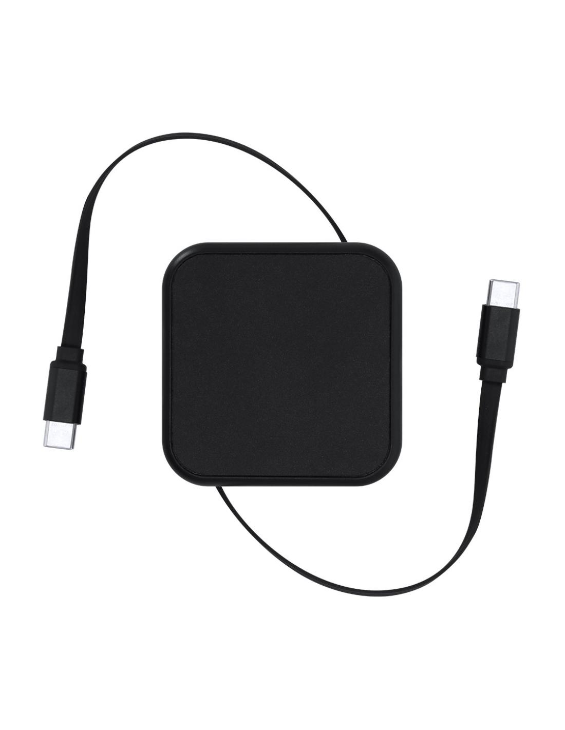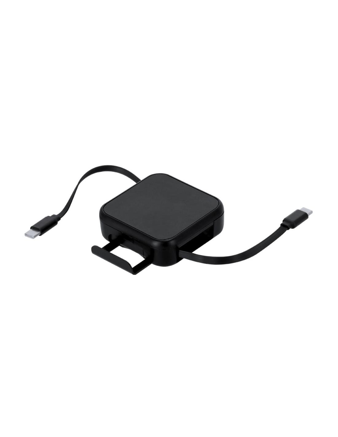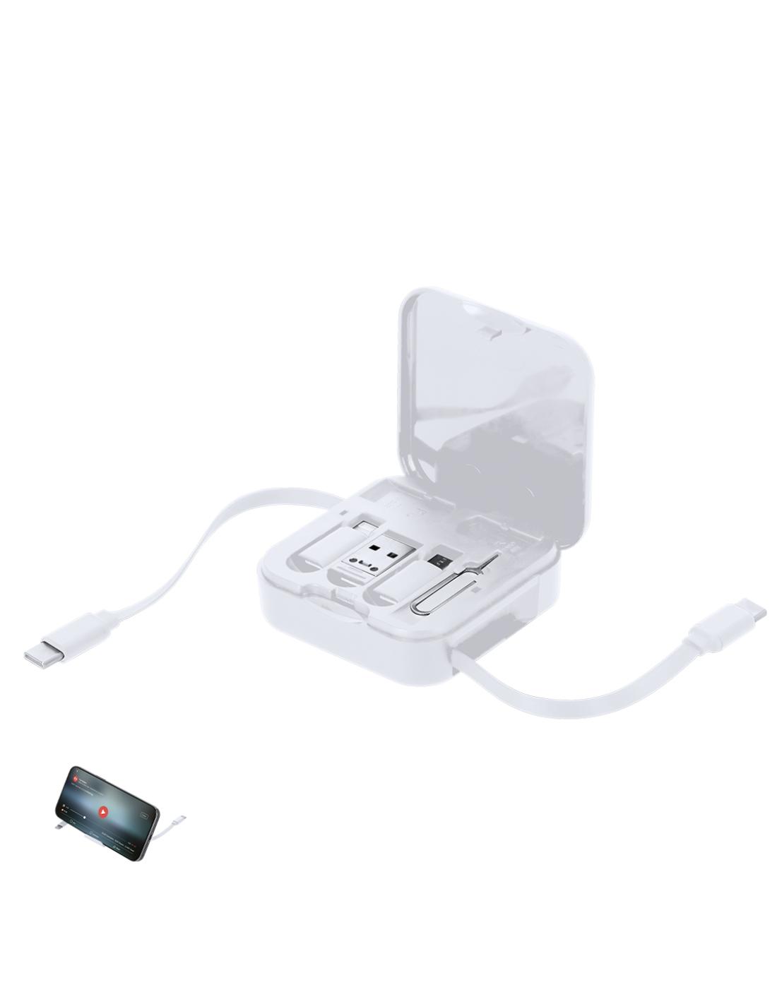 Sets de cables cargadores para tu smartphone fabricado en ABS reciclado (RABS). Cuenta con un cable retráctil de 100 cm de carga rápida y transferencia de datos USB-C de 100 W, junto con un adaptador USB-A y un adaptador microUSB/Lightning 2 en 1. El RABS es un plástico altamente reciclable de gran resistencia y con multitud de aplicaciones que lo convierten en una solución eco-friendly. En el interior, encontrarás un expulsor de la tarjeta SIM, almacenamiento para una nano SIM y una tarjeta SIM, y un soporte para teléfono integrado, perfecto para ver vídeos o hacer videollamadas. Fácil de transportar gracias a su diseño compacto.