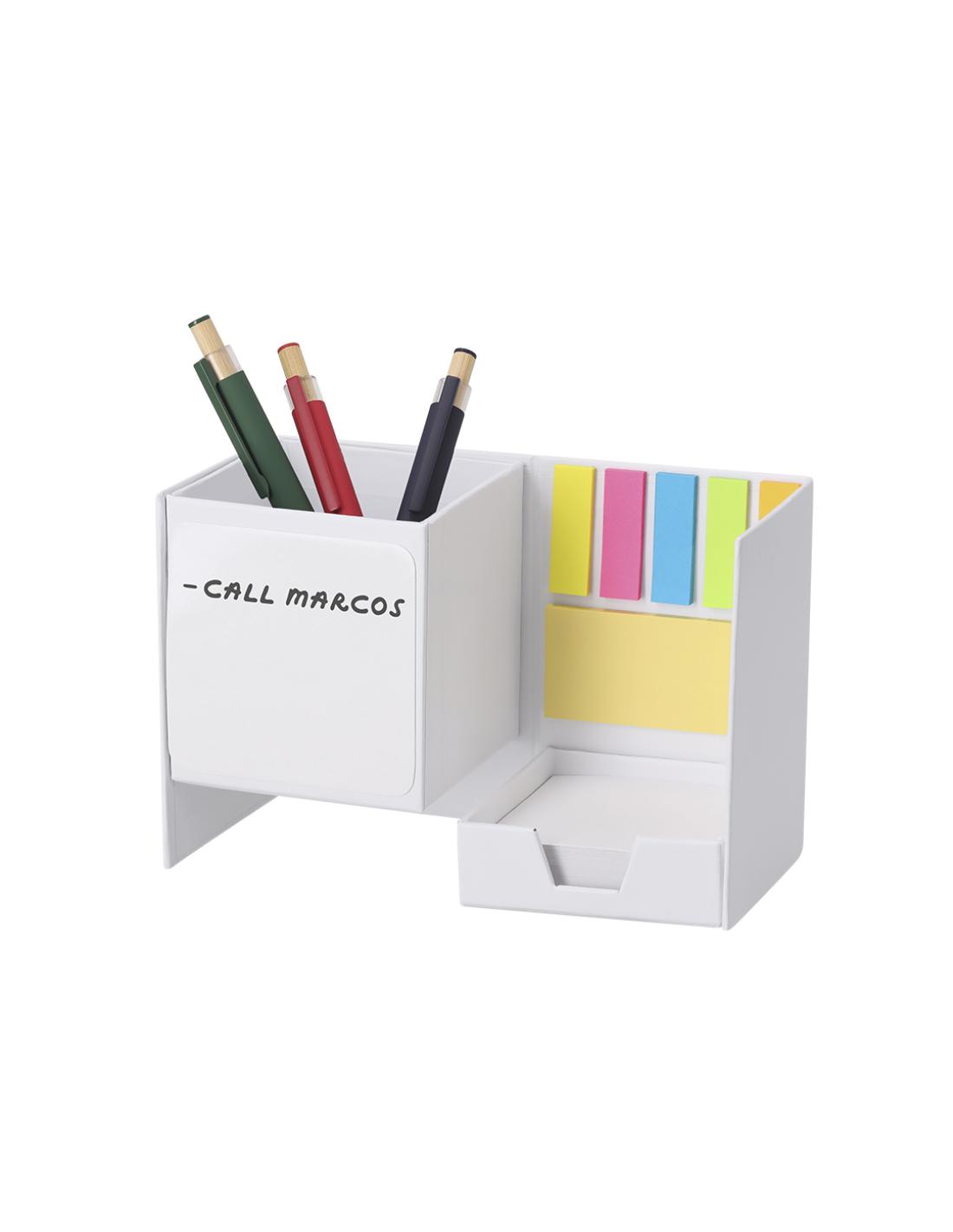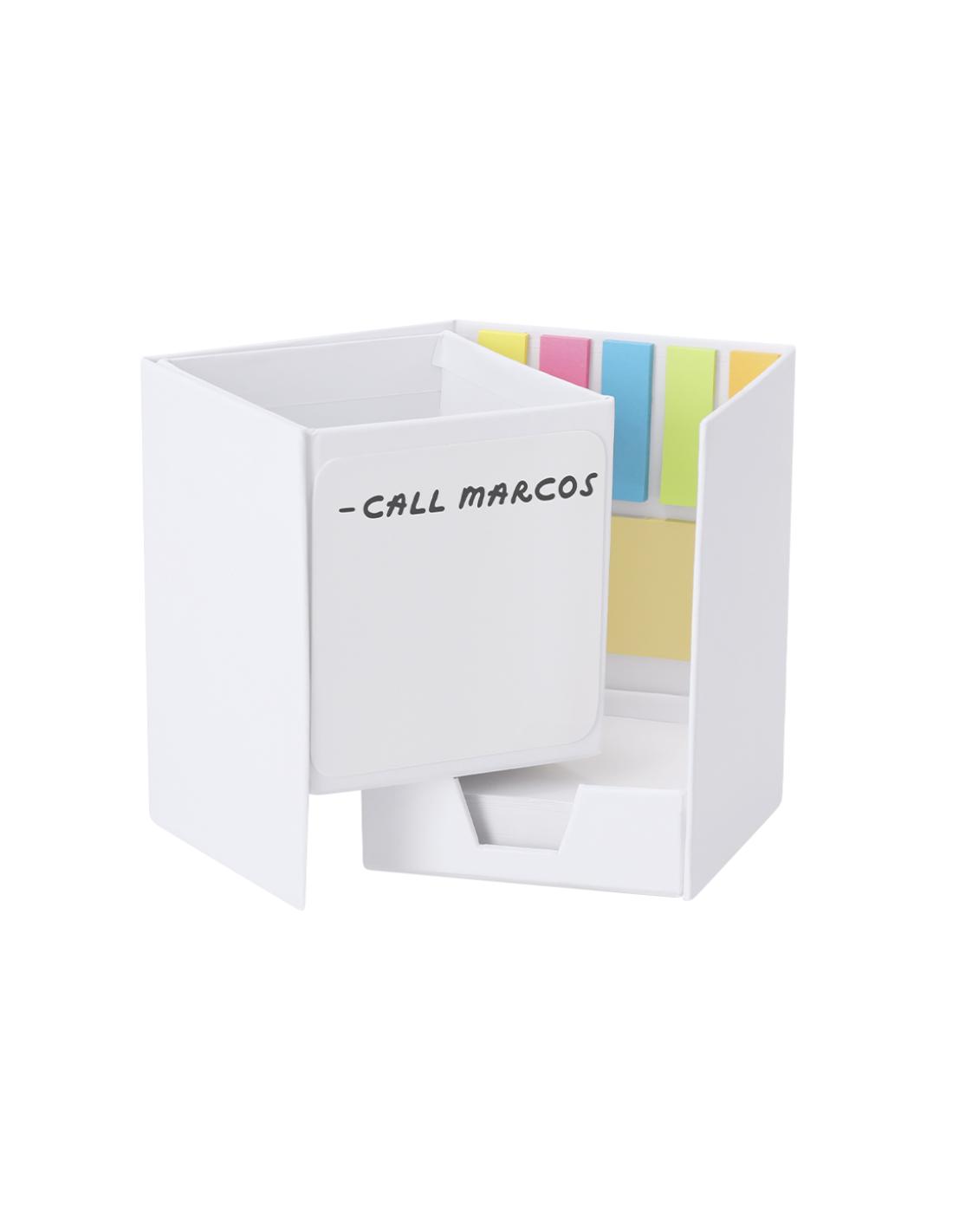 Lapicero Portanotas Pizarra en cartón reciclado. Práctico cubo desplegable con 170 hojas de 7x7 cm y 125 mininotas adhesivas de 3,8x 1,2cm en variados colores, 25 mininotas de 7,5 x 3,5 cm con práctico hueco para usar como lapicero. Lado frontal con función pizarra.