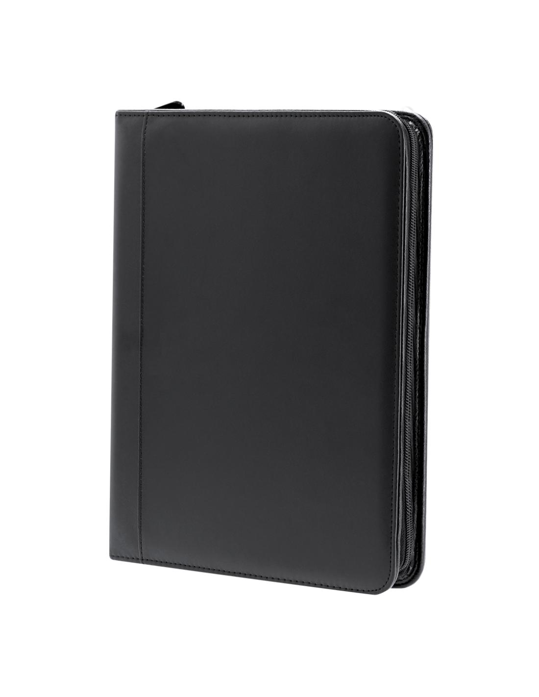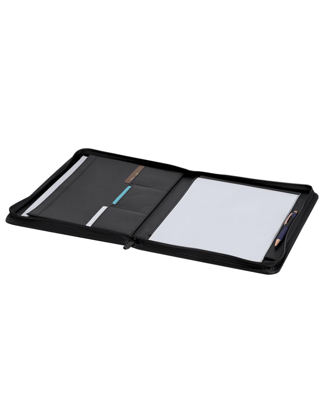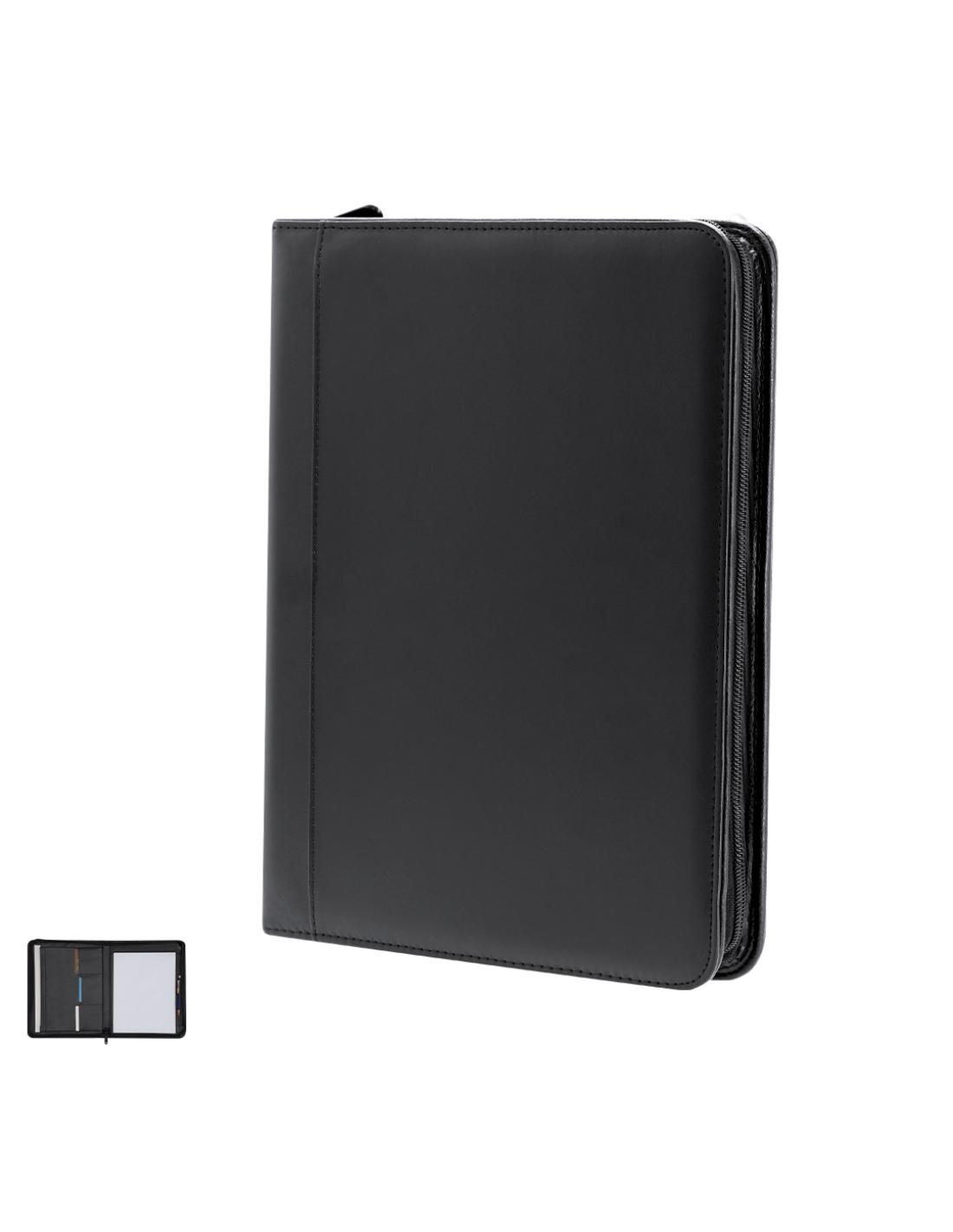 Elegante Carpeta con cremallera en PU reciclado. Con 4 compartimentos interiores en PU Reciclada y soporte para bolígrafo. Incluye bloc de notas de 25 páginas en blanco.