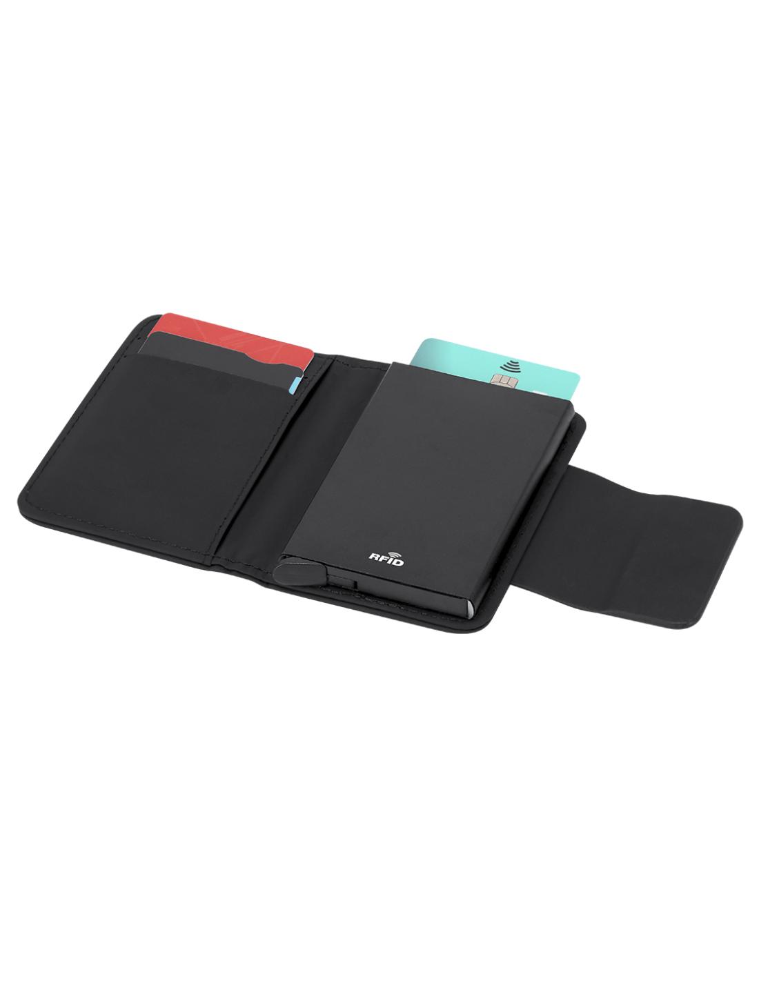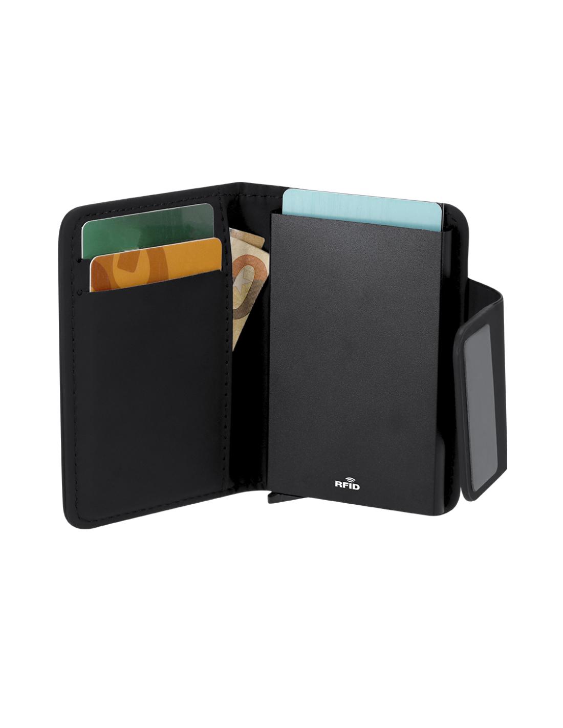 Tarjetero fabricado en PU reciclada. Capacidad hasta 10 tarjetas, con ingenioso mecanismo desliza y extrae de acceso a las tarjetas. Cierre magnético a través de solapa. Contiene 4 compartimentos. Tecnología de seguridad RFID (Identificación por Radio Frecuencia) que mantiene seguros tus dispositivos de transmisión de identidad. Distintivos RFID.