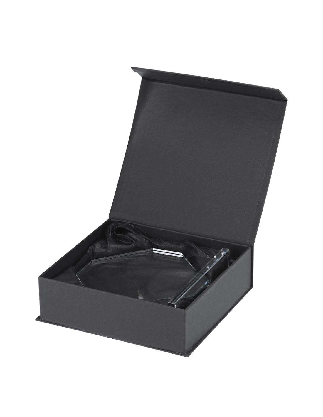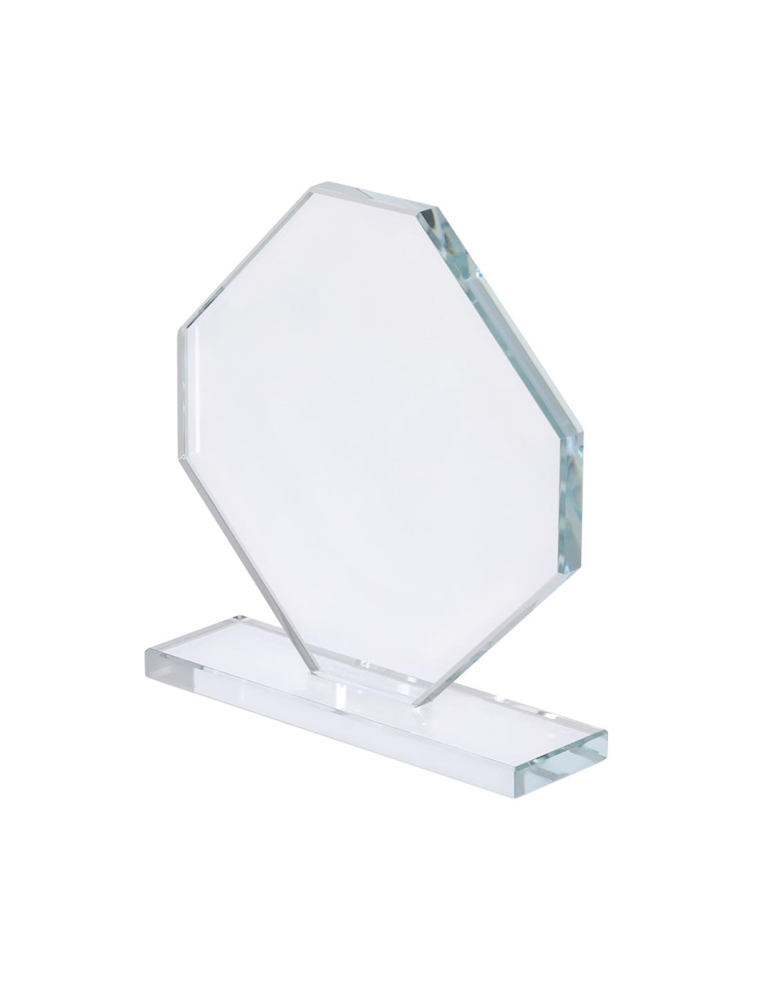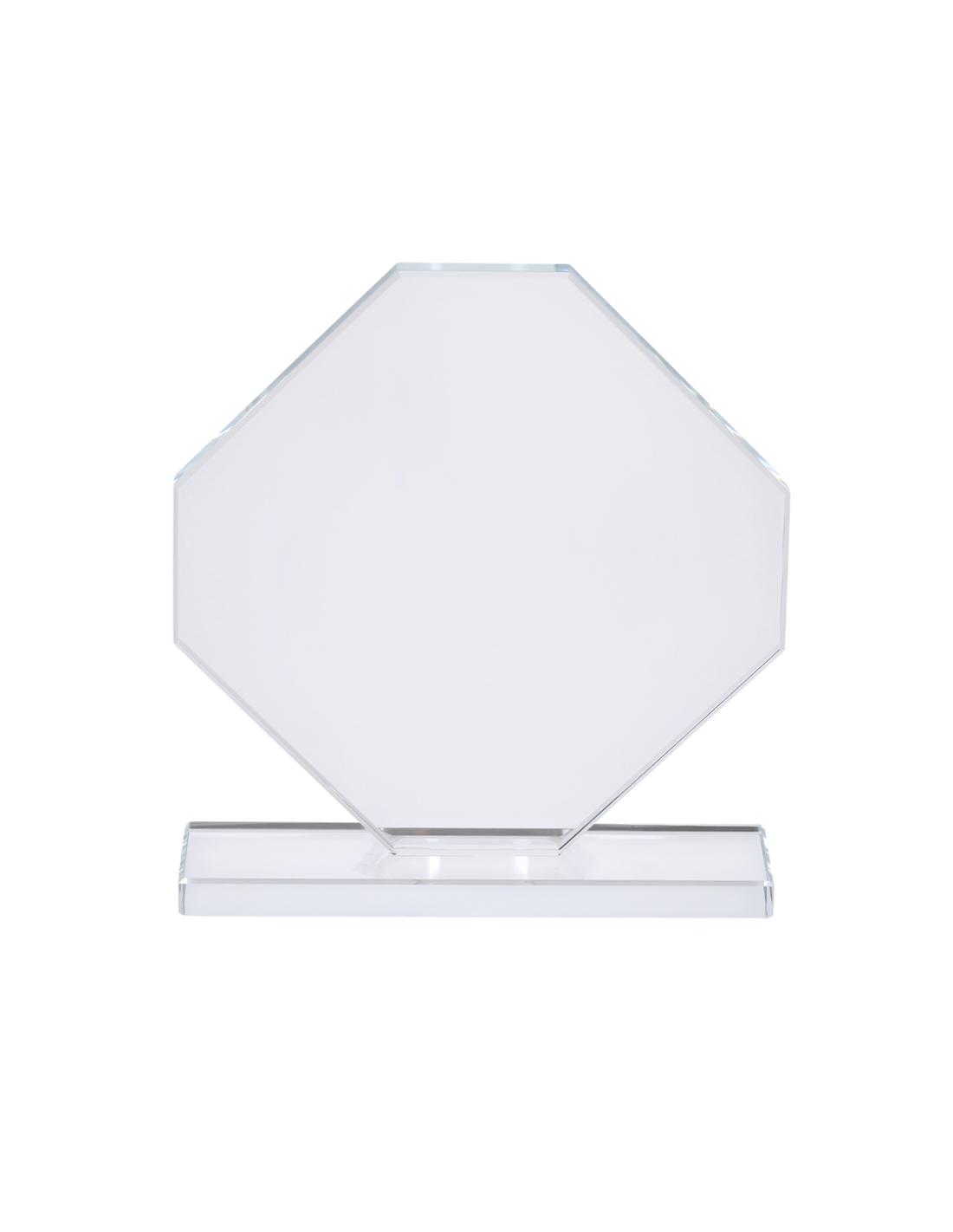 Placa trofeo de grueso cristal con elegante diseño octogonal con soporte. Ideal para regalos personalizados, reconocimientos, premios y decoración.Presentada en estuche de protección individual en elegante diseño.