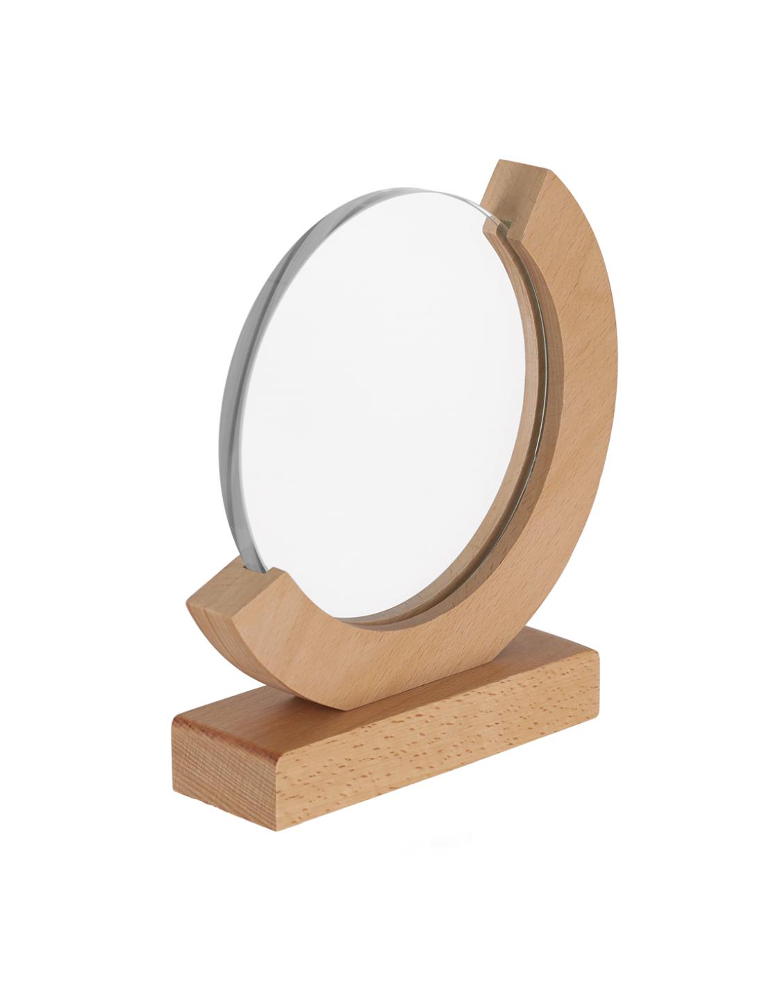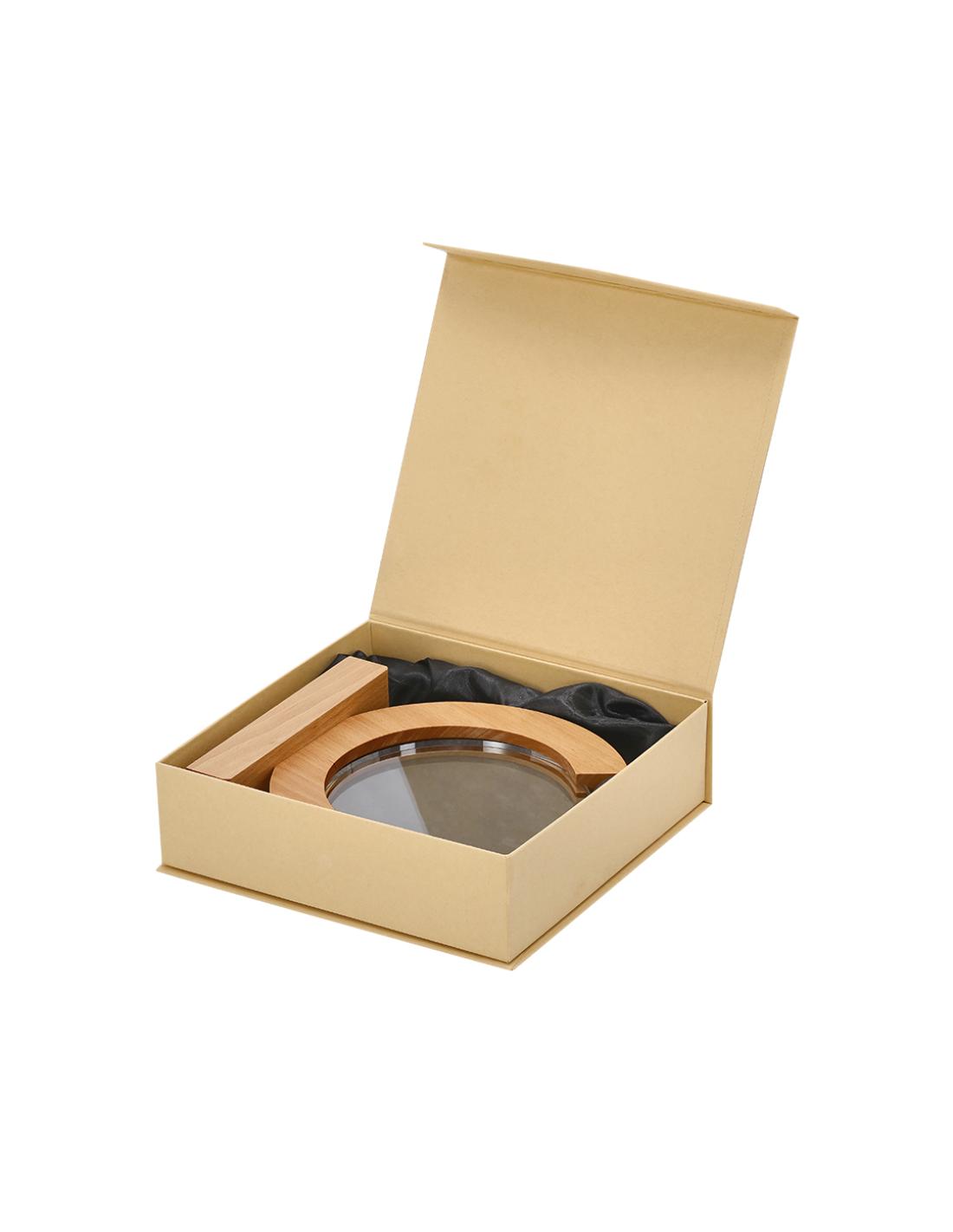 Placa trofeo de grueso cristal con elegante diseño circular con base en madera. Ideal para regalos personalizados, reconocimientos, premios y decoración. Presentada en estuche de protección individual en acabado Kraft.