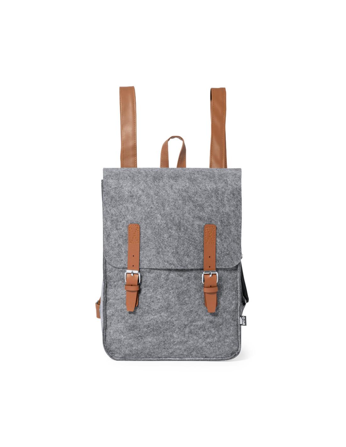 Mochila de diseño fabricada en resistente fieltro RPET, con tiras de cierre, asa de transporte y cintas para hombros en polipiel. Amplio compartimento principal, solapa con tiras ajustables y cierre de hebilla metálica. Con cintas para hombros ajustables y distintivo RPET en etiqueta exterior.El fieltro RPET es fruto de la combinación del proceso de reciclaje de materiales plásticos junto con la técnica milenaria de fabricación del fieltro, dando como resultado un material de eco-tendencia que, además de ser de origen reciclado, también se convierte en reciclable.