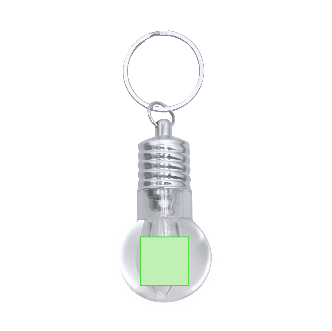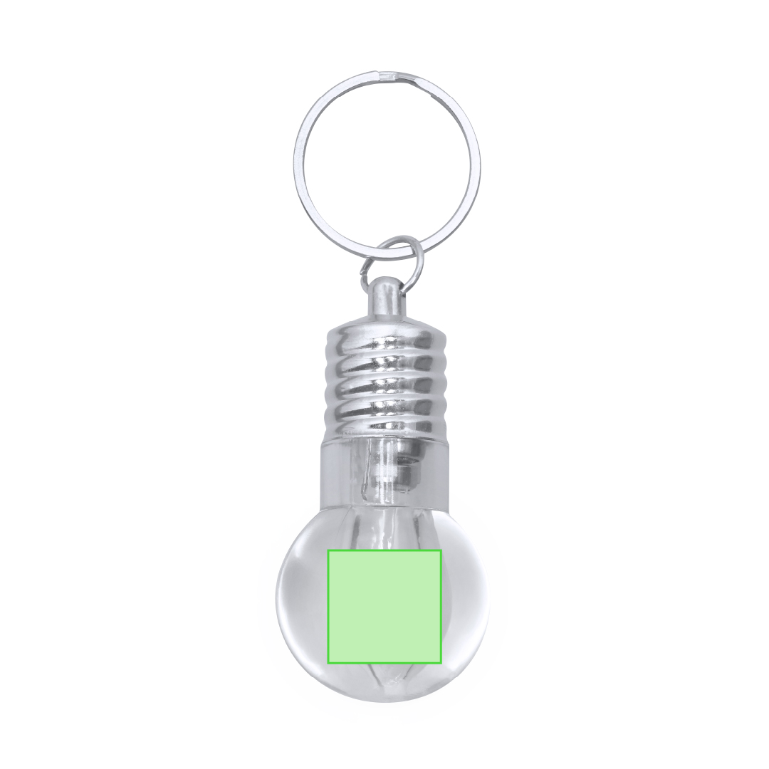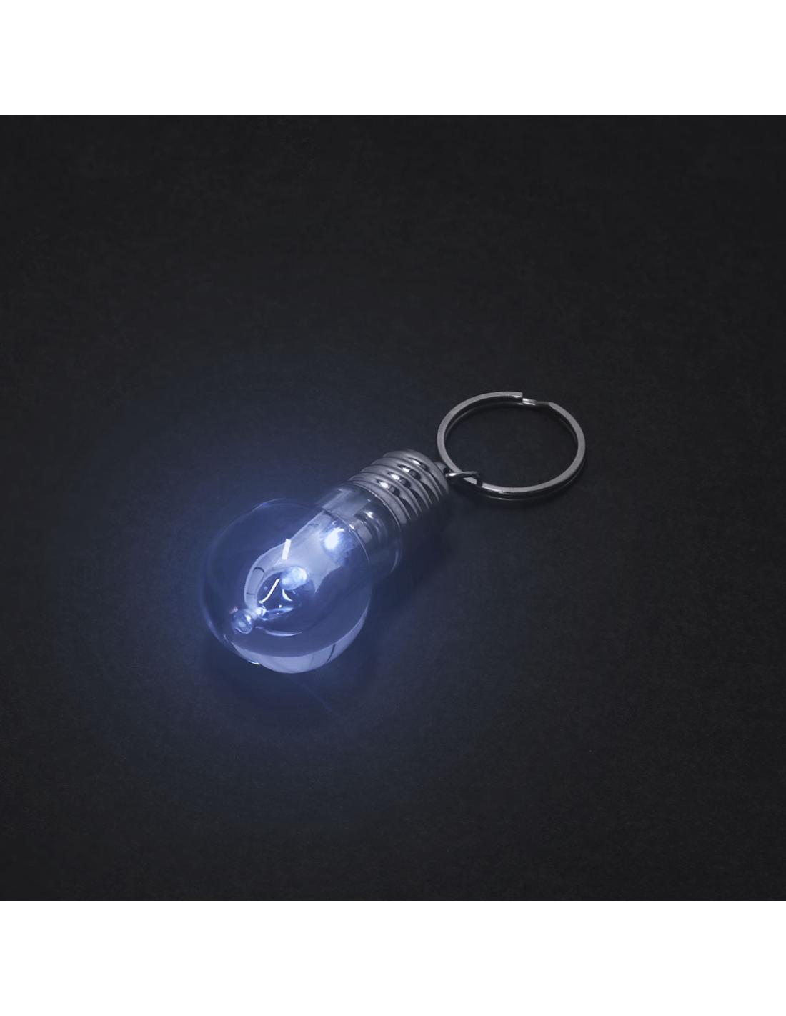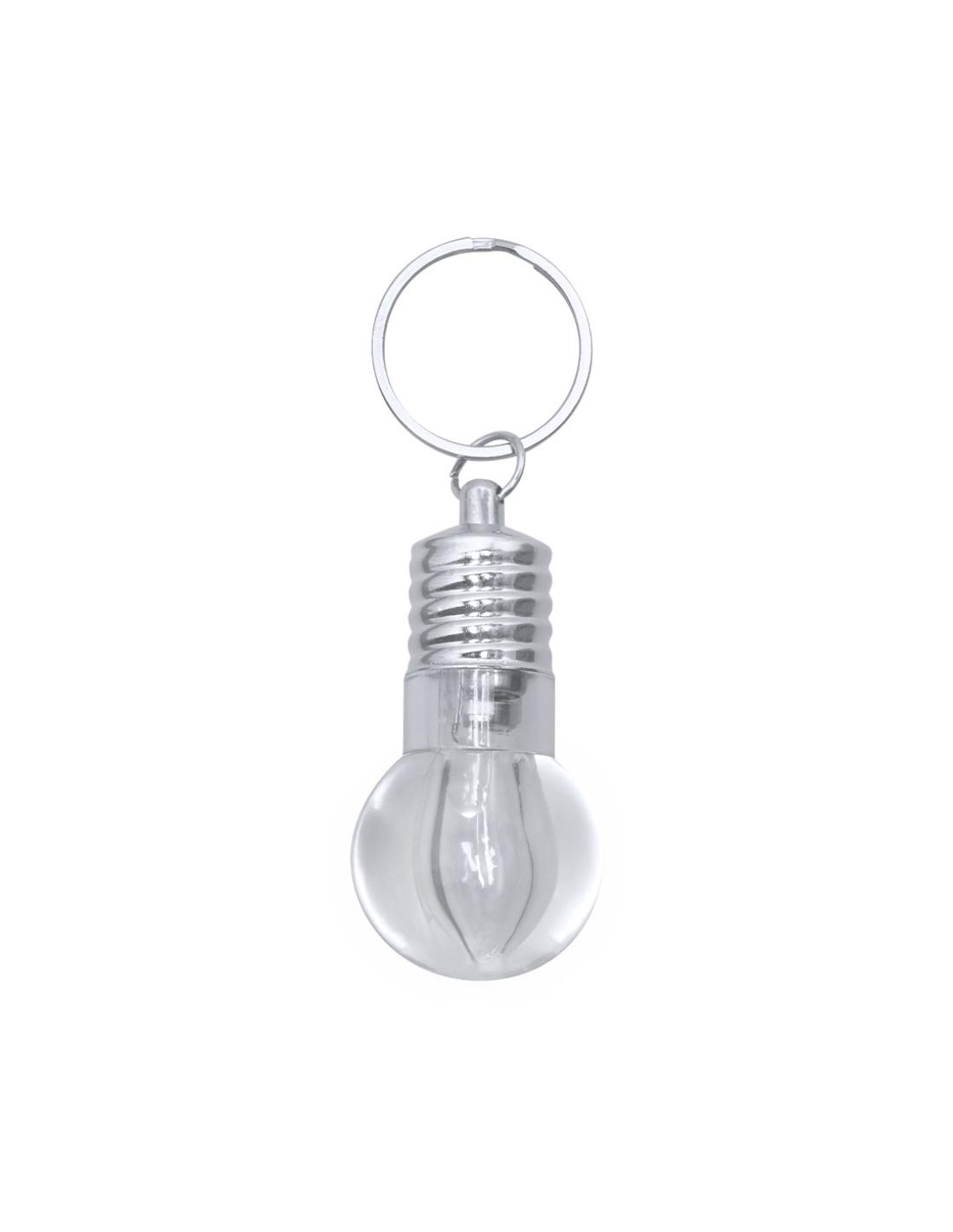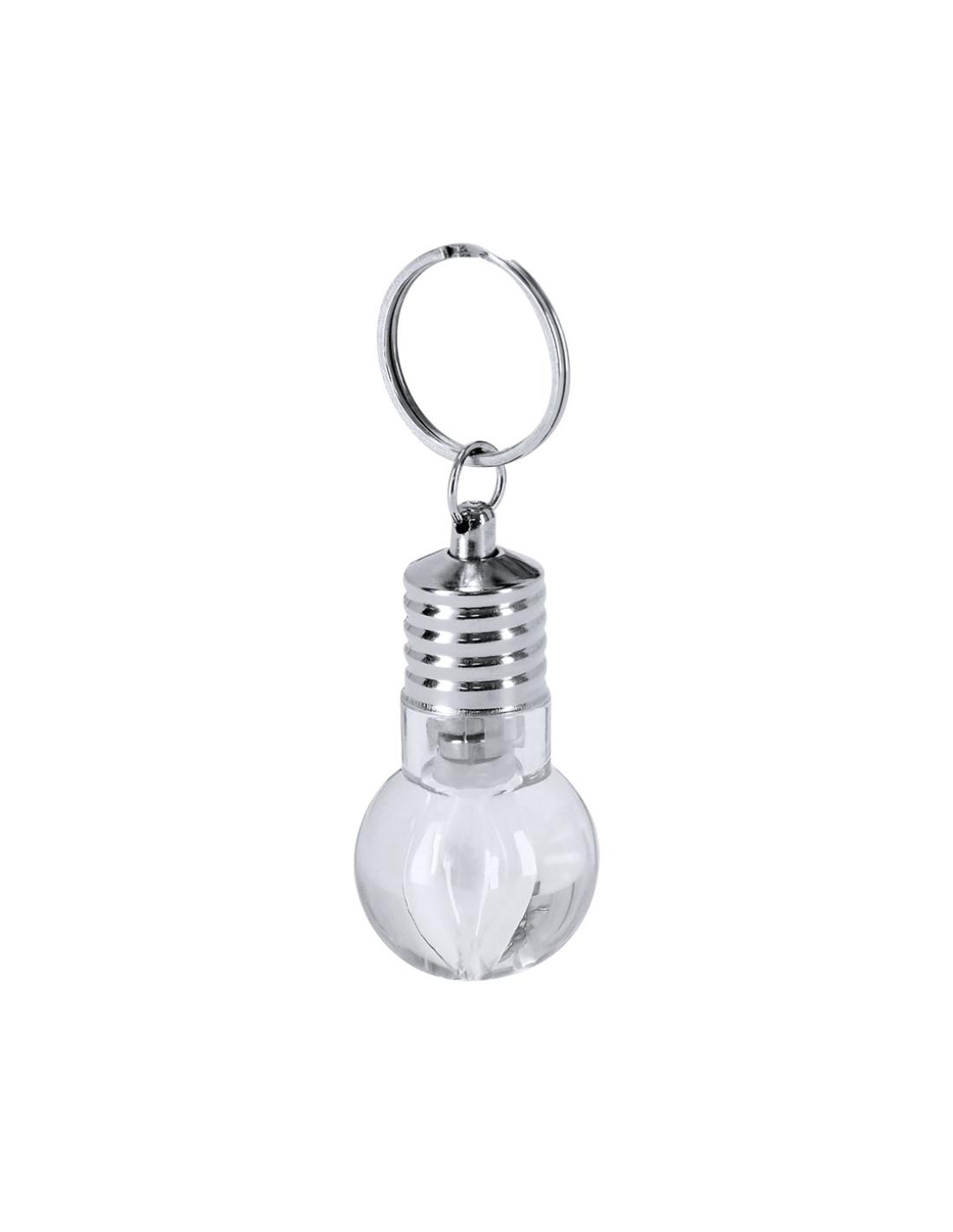 Llavero linterna con original diseño en forma de bombilla. Con 1 LED alimentado con pilas de botón (incluidas) con botón on/off en lateral y elementos decorativos y anilla cromados.