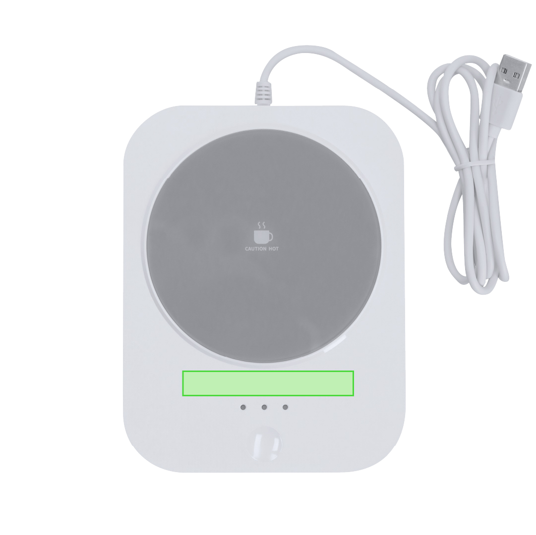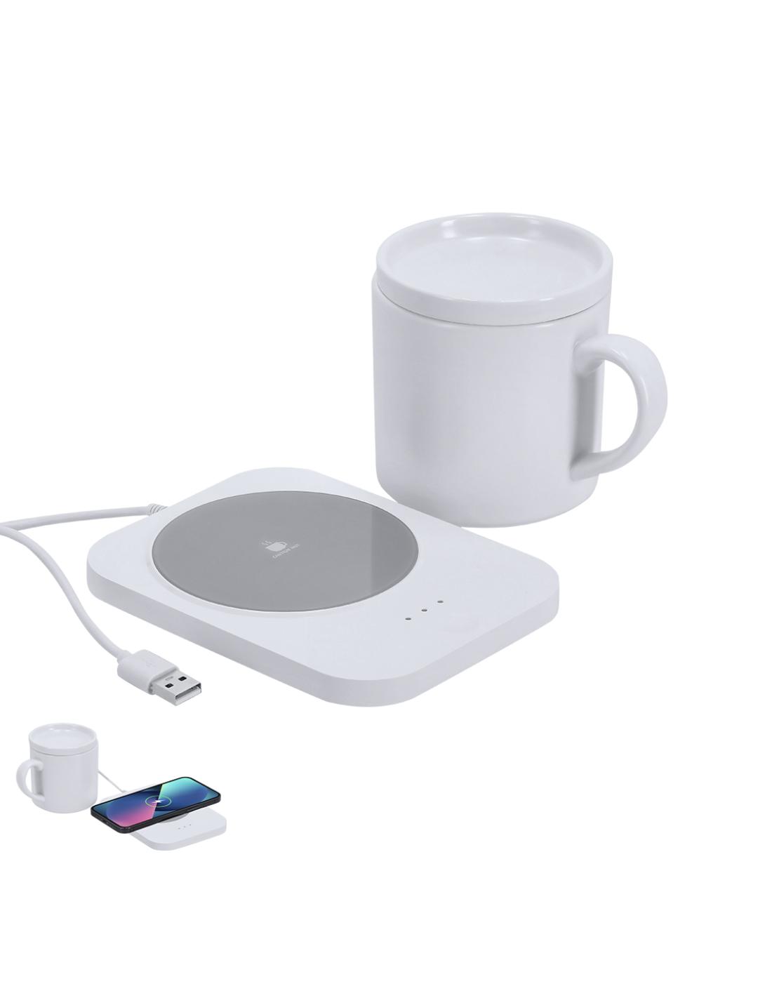 Calentador de tazas con cargador inalámbrico integrado de carga rápida 15W. Con taza de cerámica de 370 ml, especialmente diseñada para calentar y mantener la temperatura de la bebida, con tapa a juego. Incluye cable de carga Tipo USB.