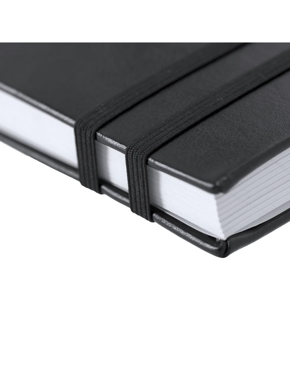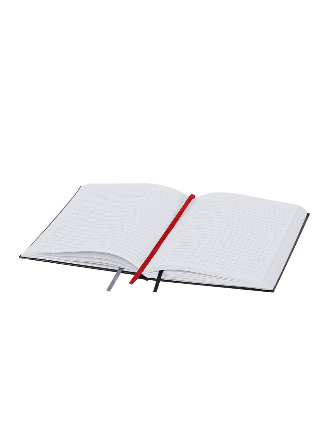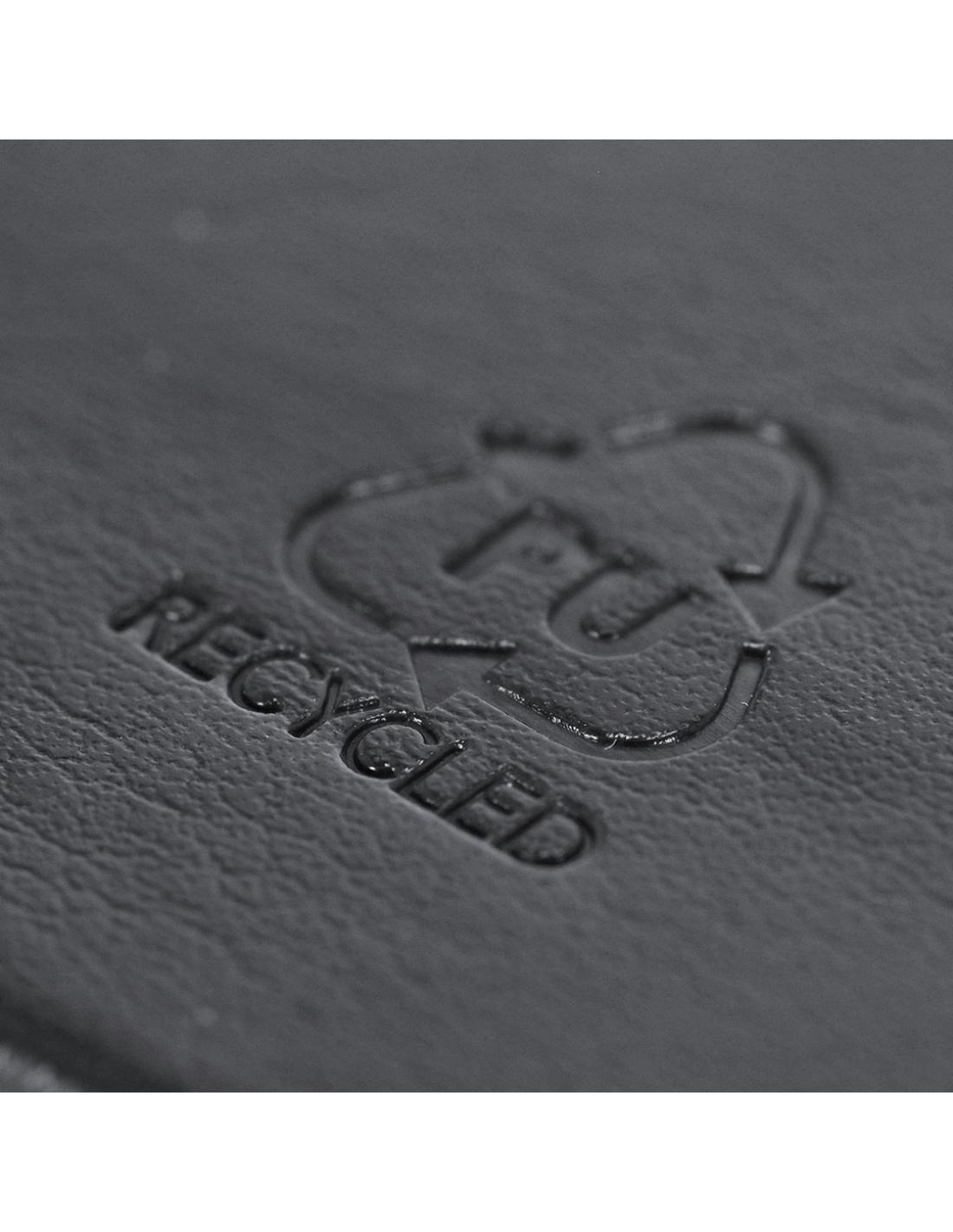 Bloc de notas en tamaño A5 con cubiertas rígidas y suaves, elaborado en PU reciclada y RPET. Marcapáginas en cinta en tres colores diferentes (negro, rojo y gris) para fácil planificación del día a día y doble cinta elástica de cierre a juego. Incluye 128 hojas color blanco con disposición a rayas y un práctico bolsillo de papel para notas sueltas. Ideal para llevar un diario y mantener la planificación durante todo el año. Con distintivo de PU Reciclado.La PU Reciclado destaca por su resistencia y elasticidad. Este material reciclado y reciclable es una opción sostenible que rescata las fibras desechadas en los procesos de fabricación, minimizando así el desperdicio de material y contribuyendo a su vez a reducir el impacto ambiental, manteniendo a la vez sus propiedades originales.