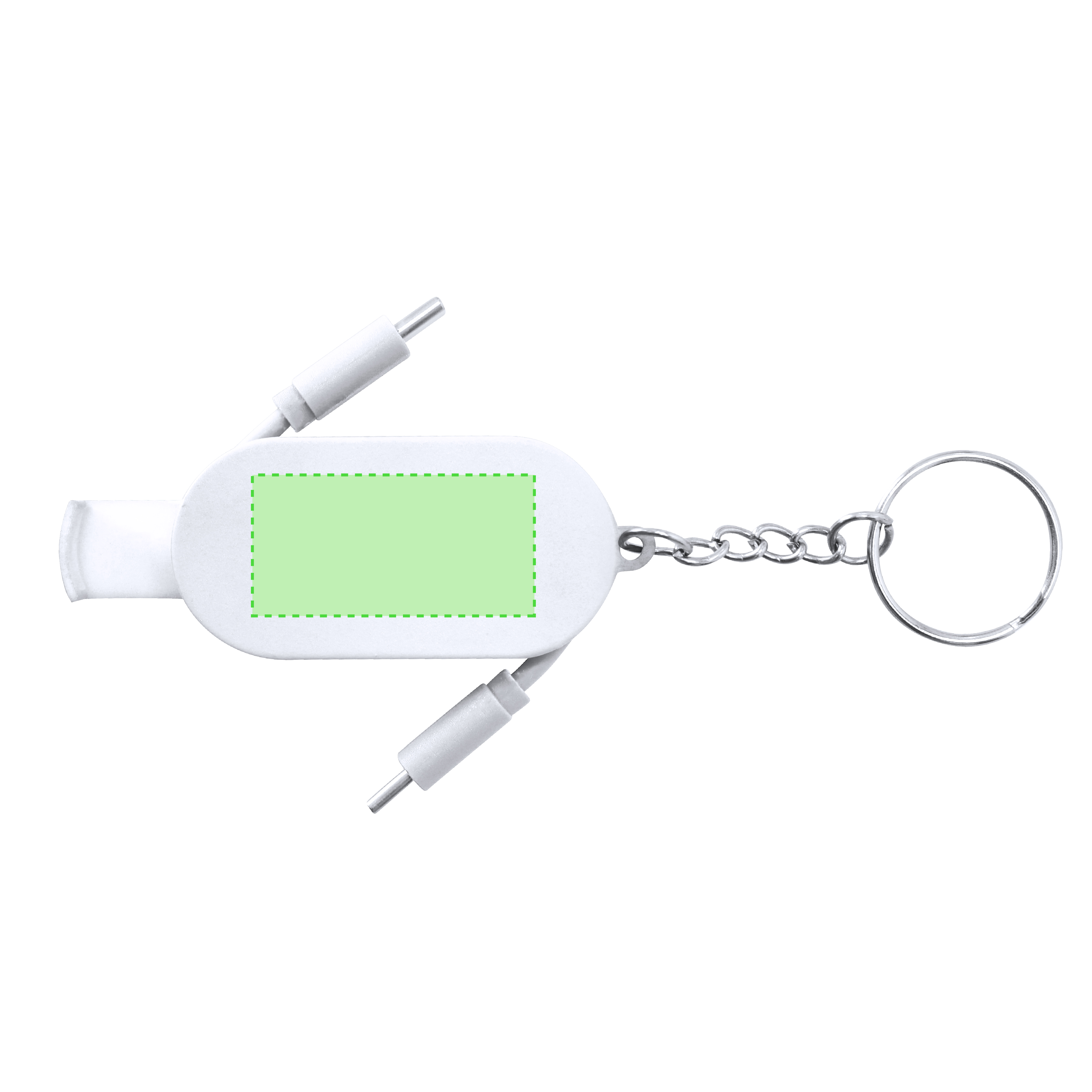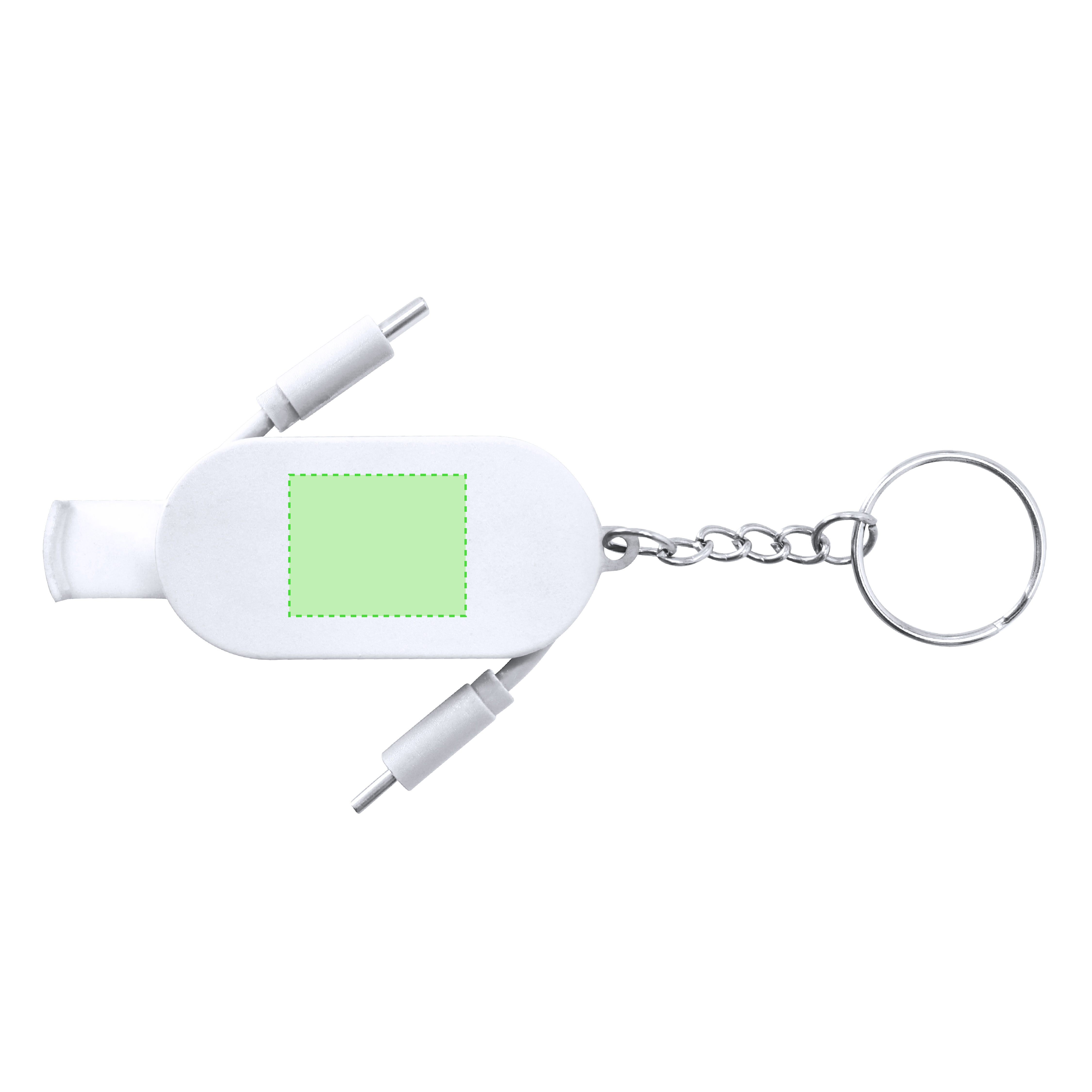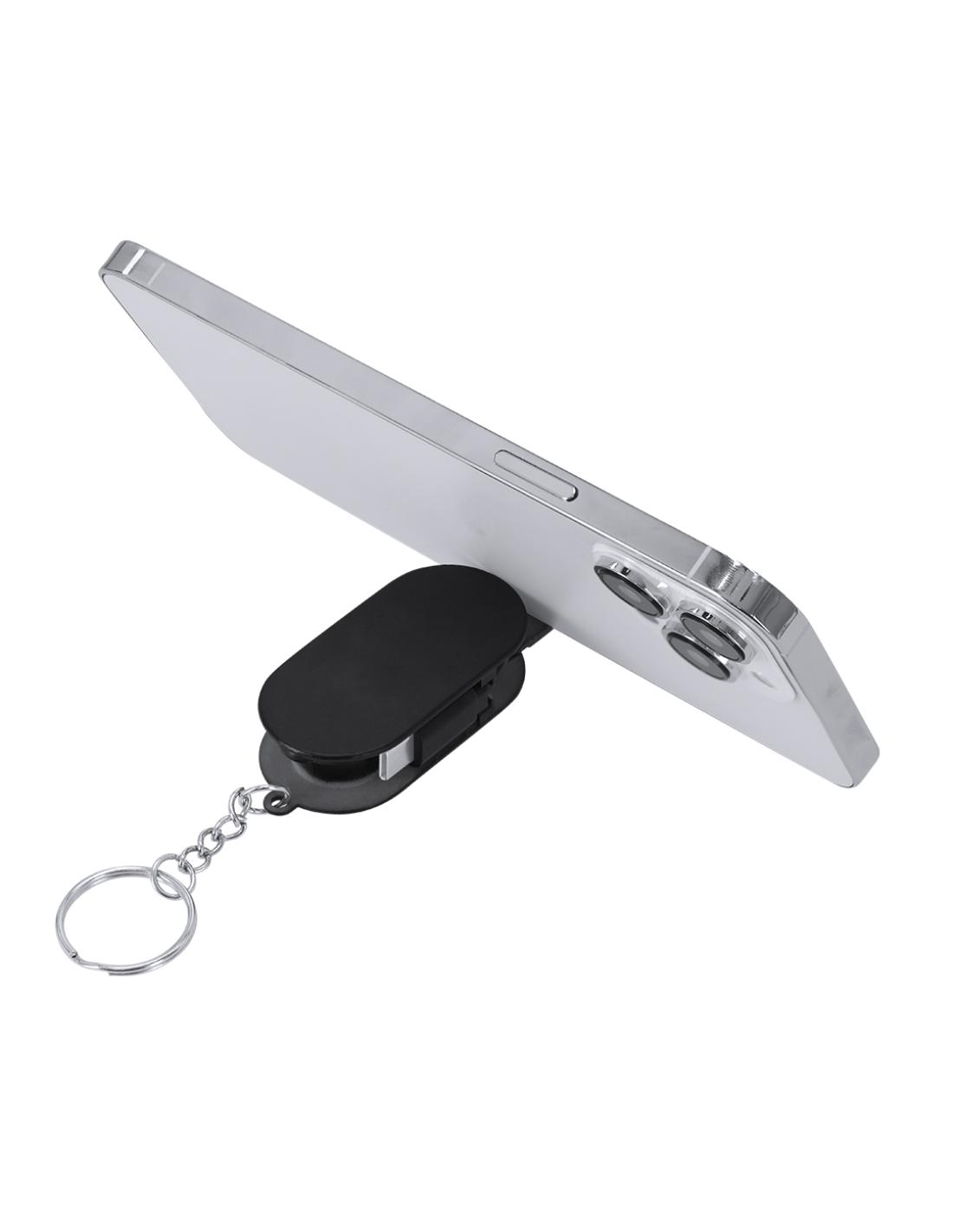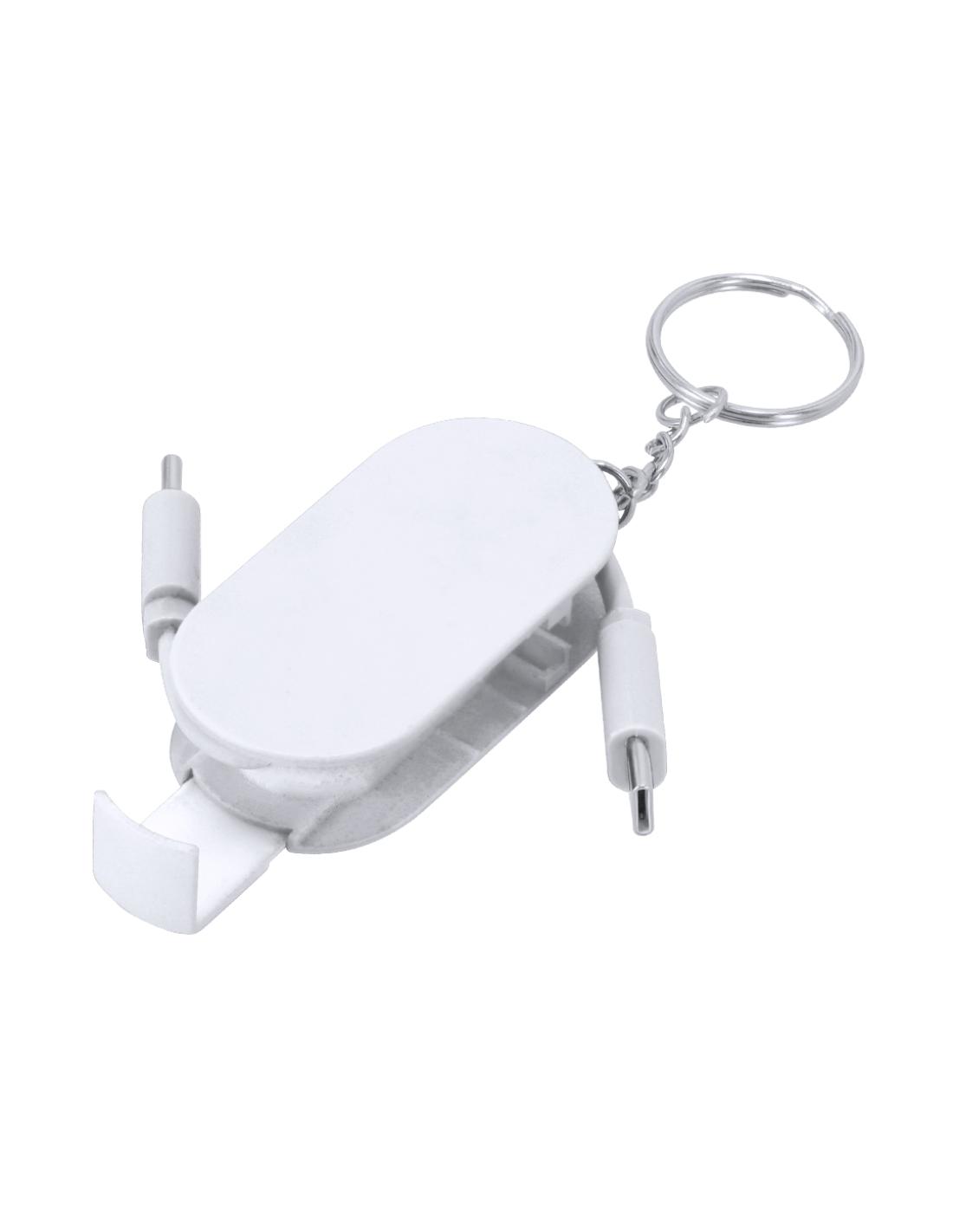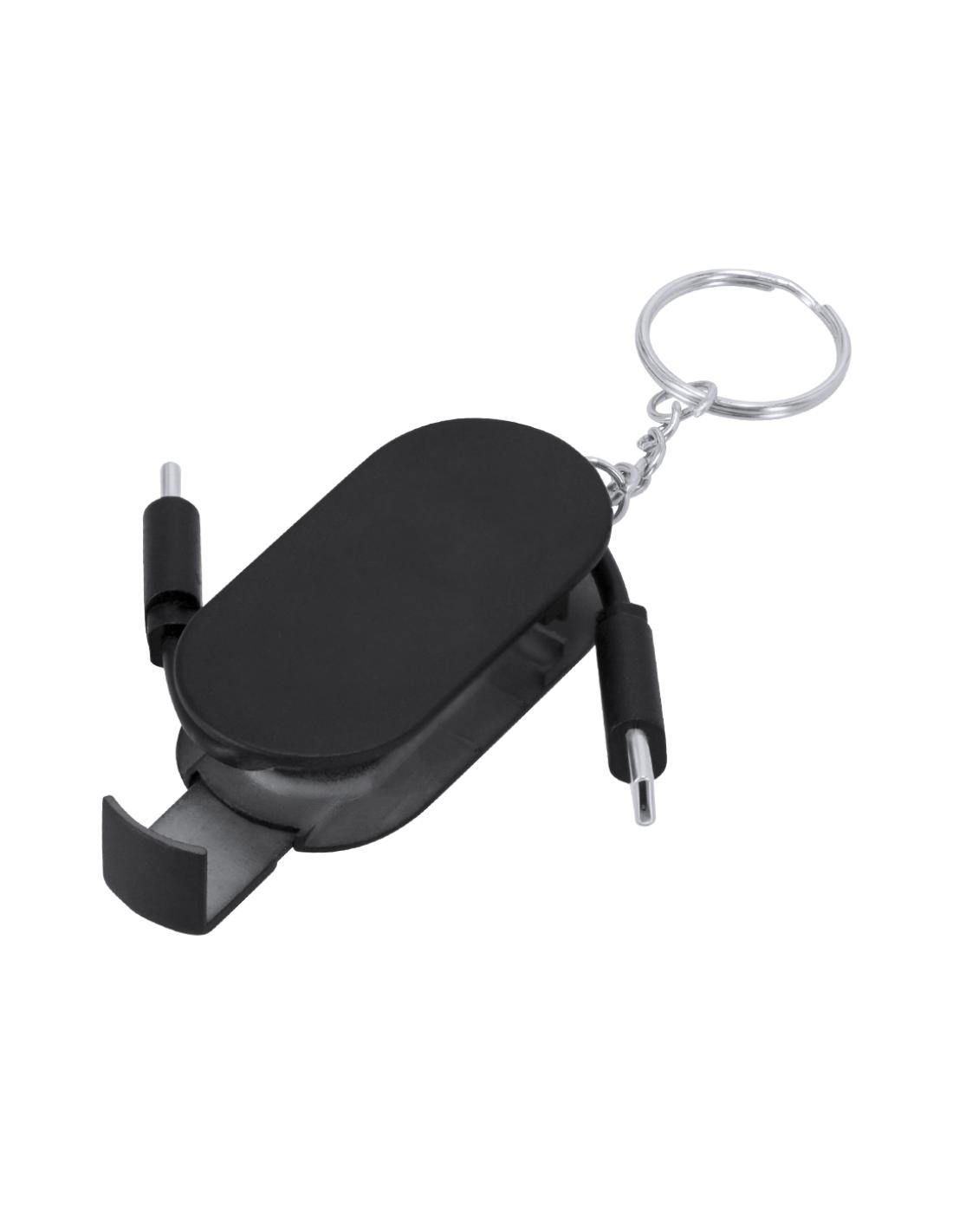 Cable Cargador llavero en ABS. Con soporte retráctil en la base para smartphone. Incluye dos entradas de tipo C para función de carga con potencia máxima 60W.