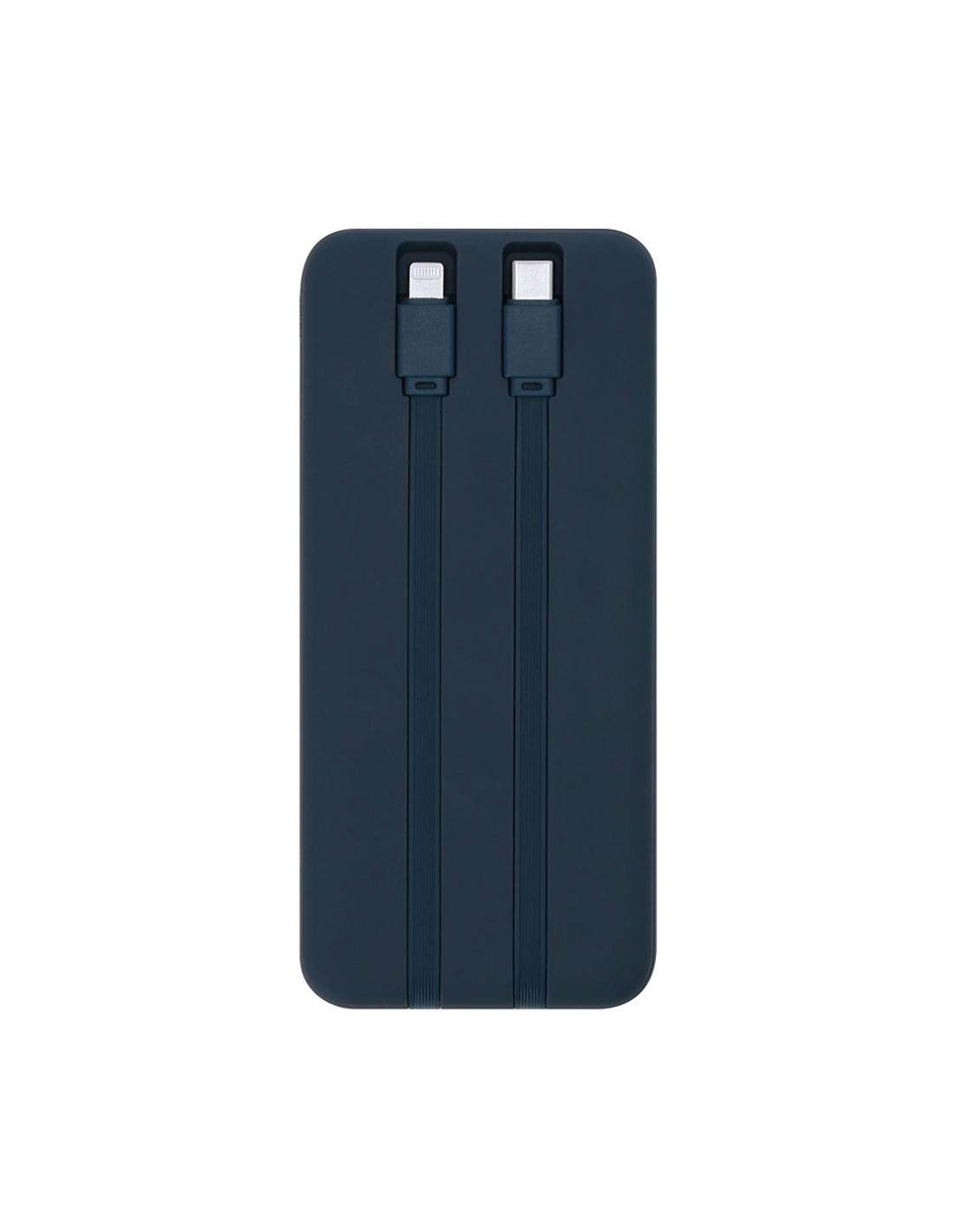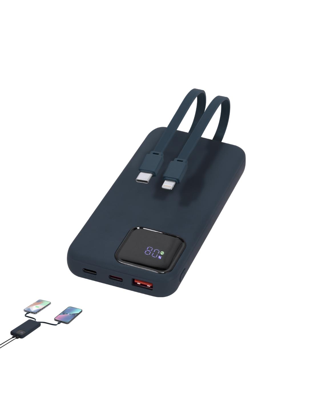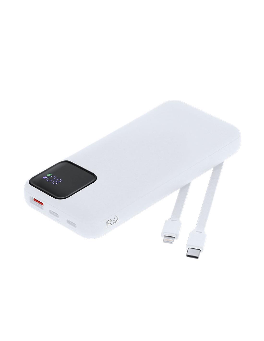 Batería auxiliar externa en ABS reciclado con acabado gomoso y 10.000 mAh de capacidad de carga. Con pantalla con indicador de carga y botón ON/OFF en el lateral. Incluye salida Tipo C y Lightning dual para carga simultánea de 2 dispositivos y conexión Tipo C y USB de salida. Con distintivo logo RABS en la parte transera.