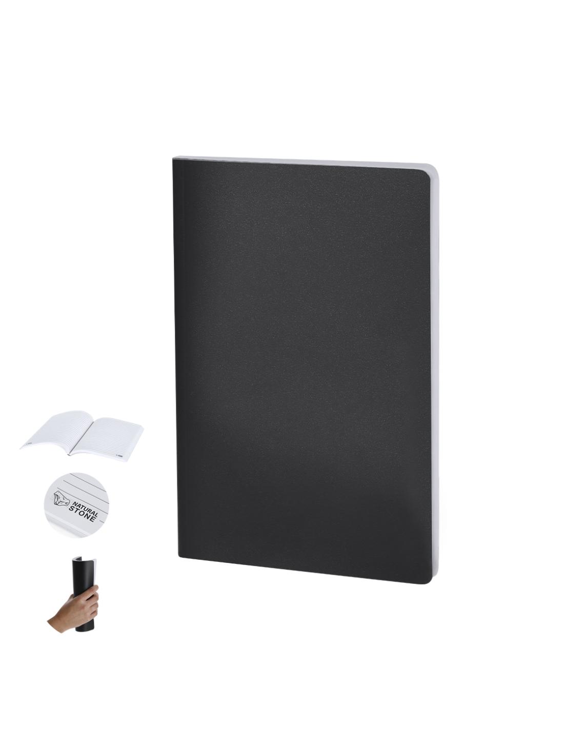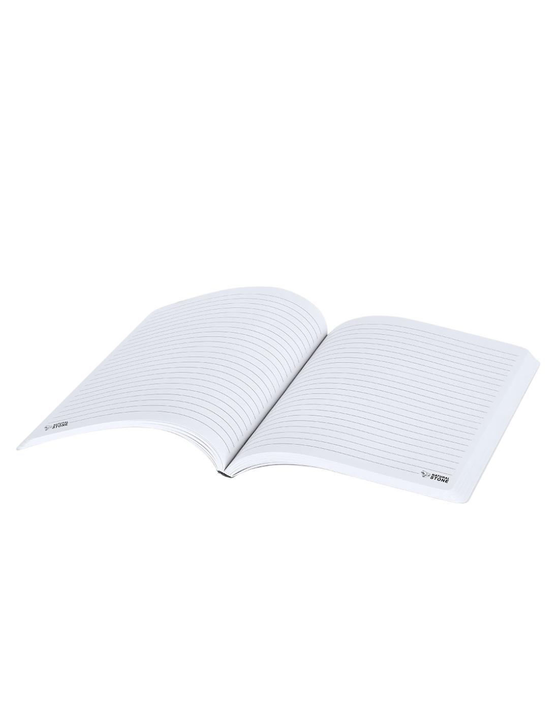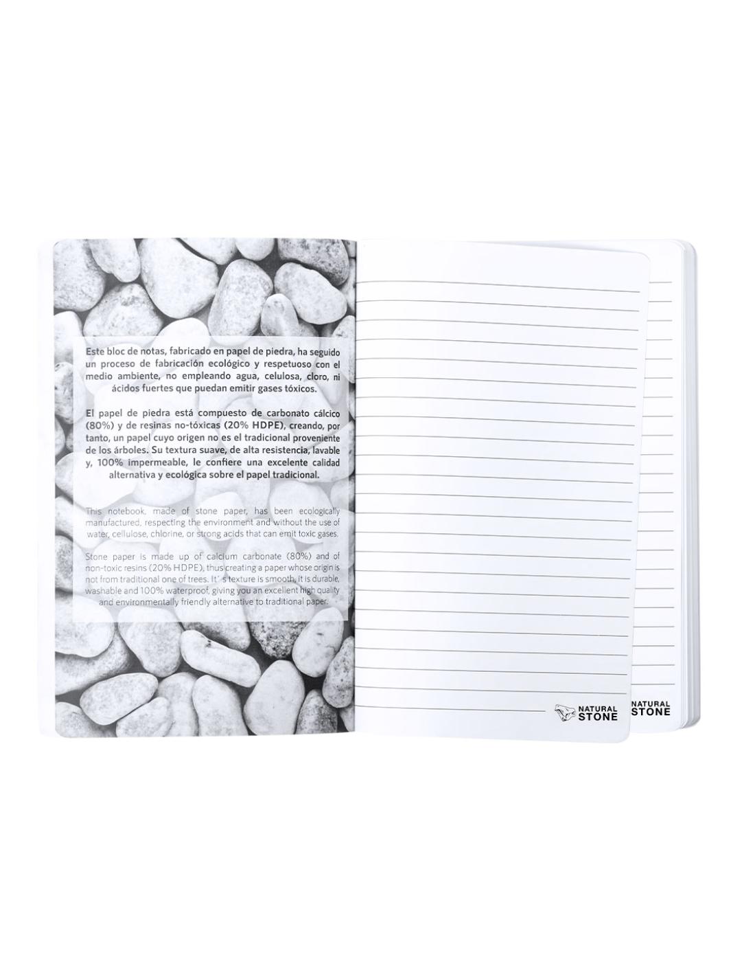 Bloc de notas con tapas blandas de cartón con hojas fabricadas a partir de extractos de piedra. Contiene 64 hojas color blanco y disposición a una raya, de elegante acabado de color blanco. Logotipo Natural Stone en cada hoja. Incluye hoja interior en la que se explica el proceso de fabricación a partir de extractos de piedra.