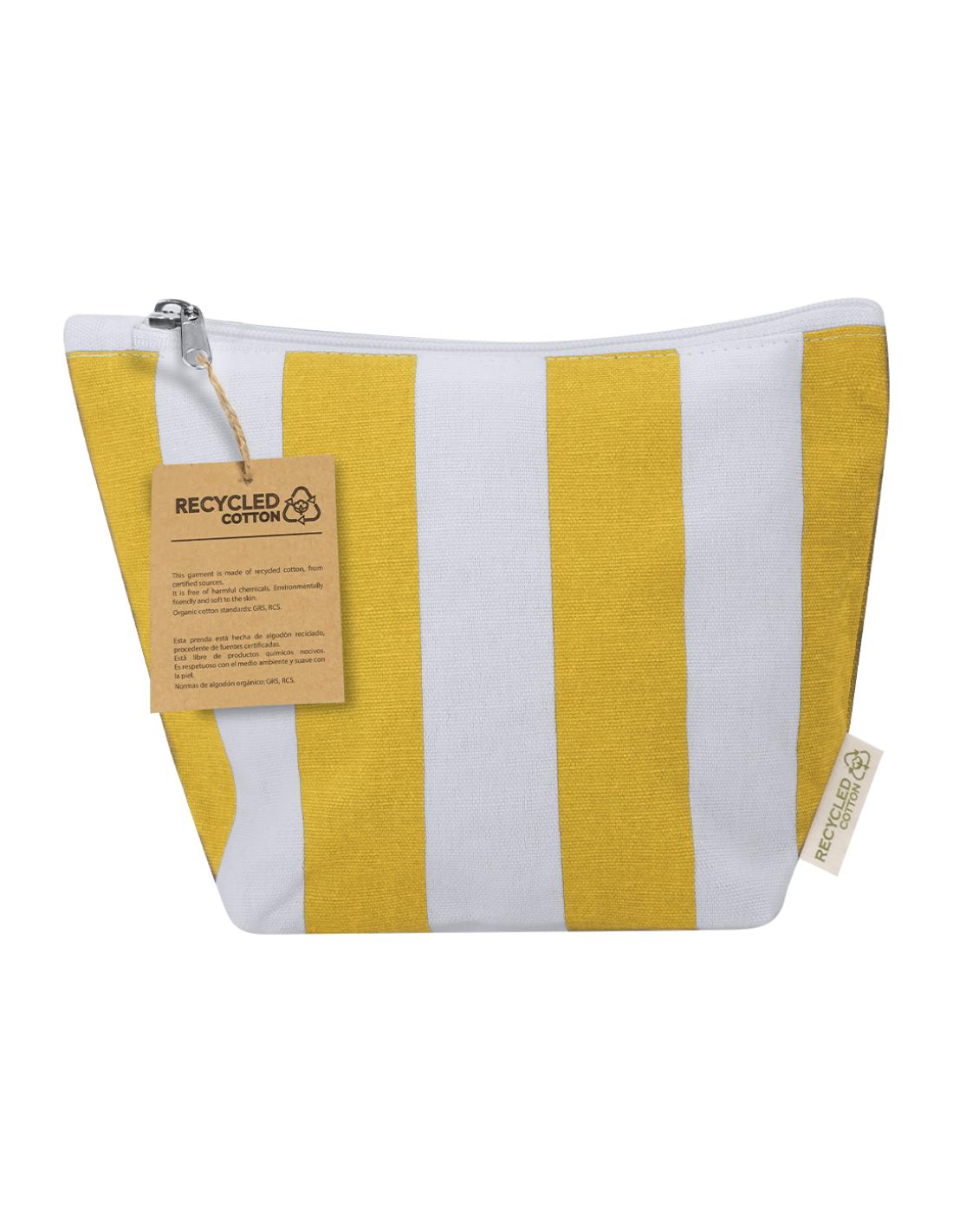 Neceser fabricado principalmente en algodón reciclado 220 g/ m2 en elegante diseño a rayas verticales. Compartimento principal con cierre de cremallera. Incluye etiqueta exterior con logotipo algodón reciclado.