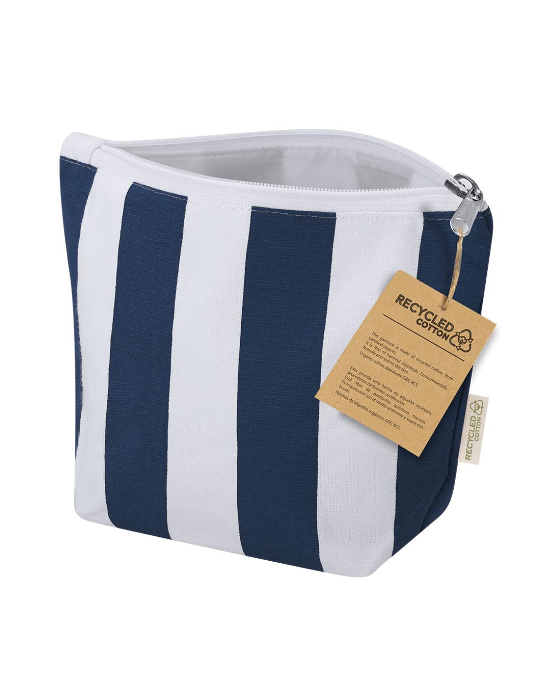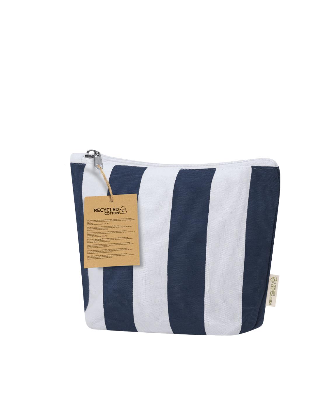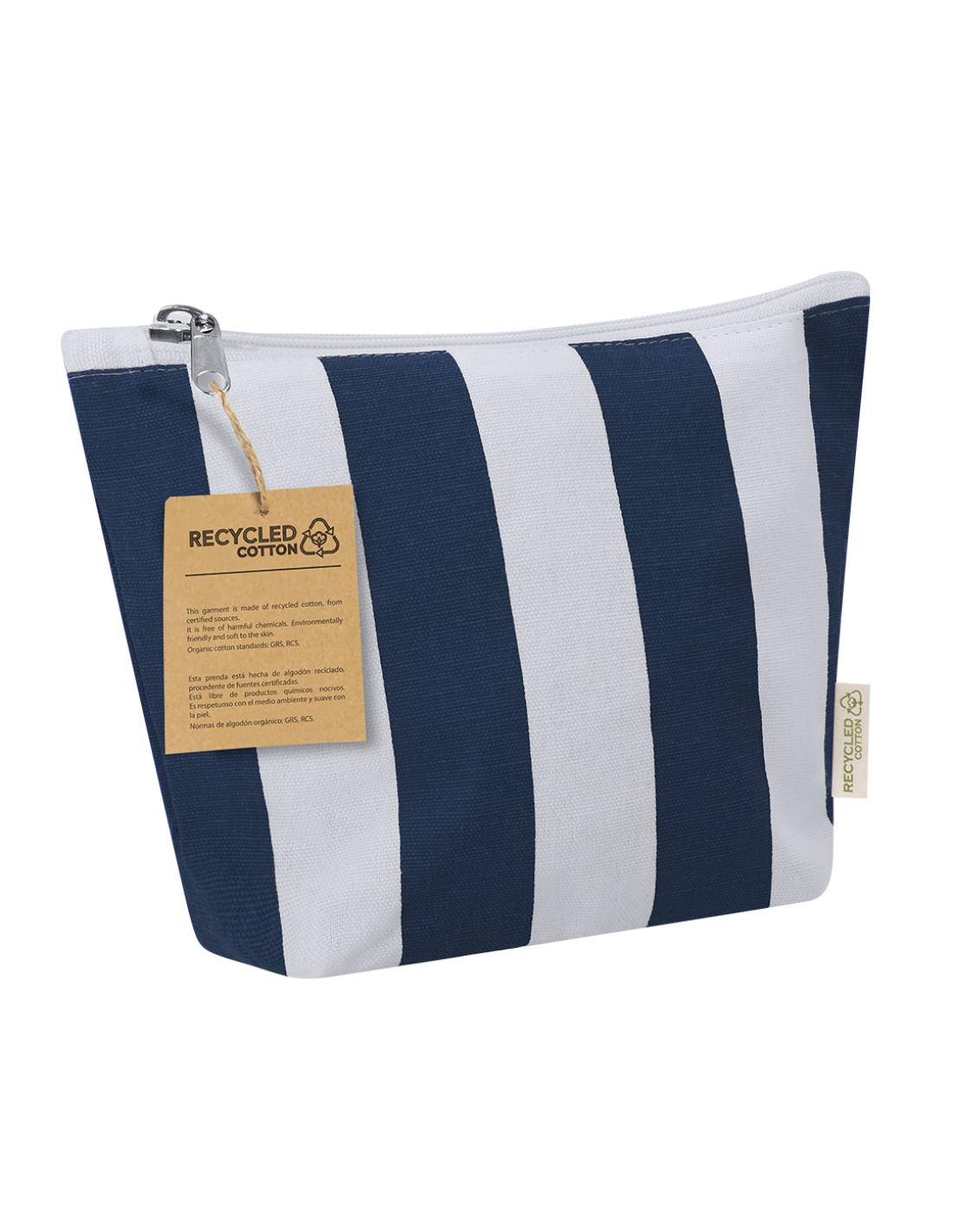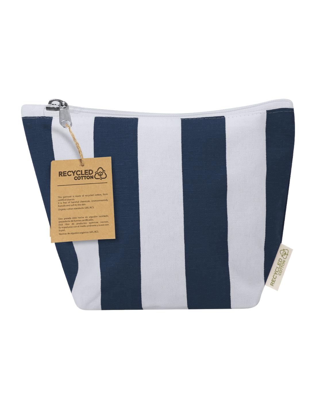 Neceser fabricado principalmente en algodón reciclado 220 g/ m2 en elegante diseño a rayas verticales. Compartimento principal con cierre de cremallera. Incluye etiqueta exterior con logotipo algodón reciclado.