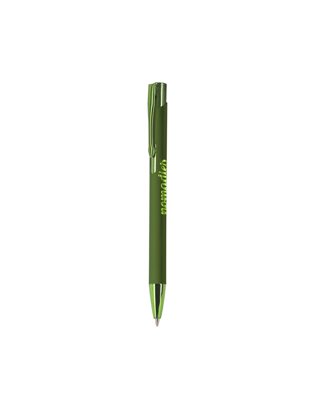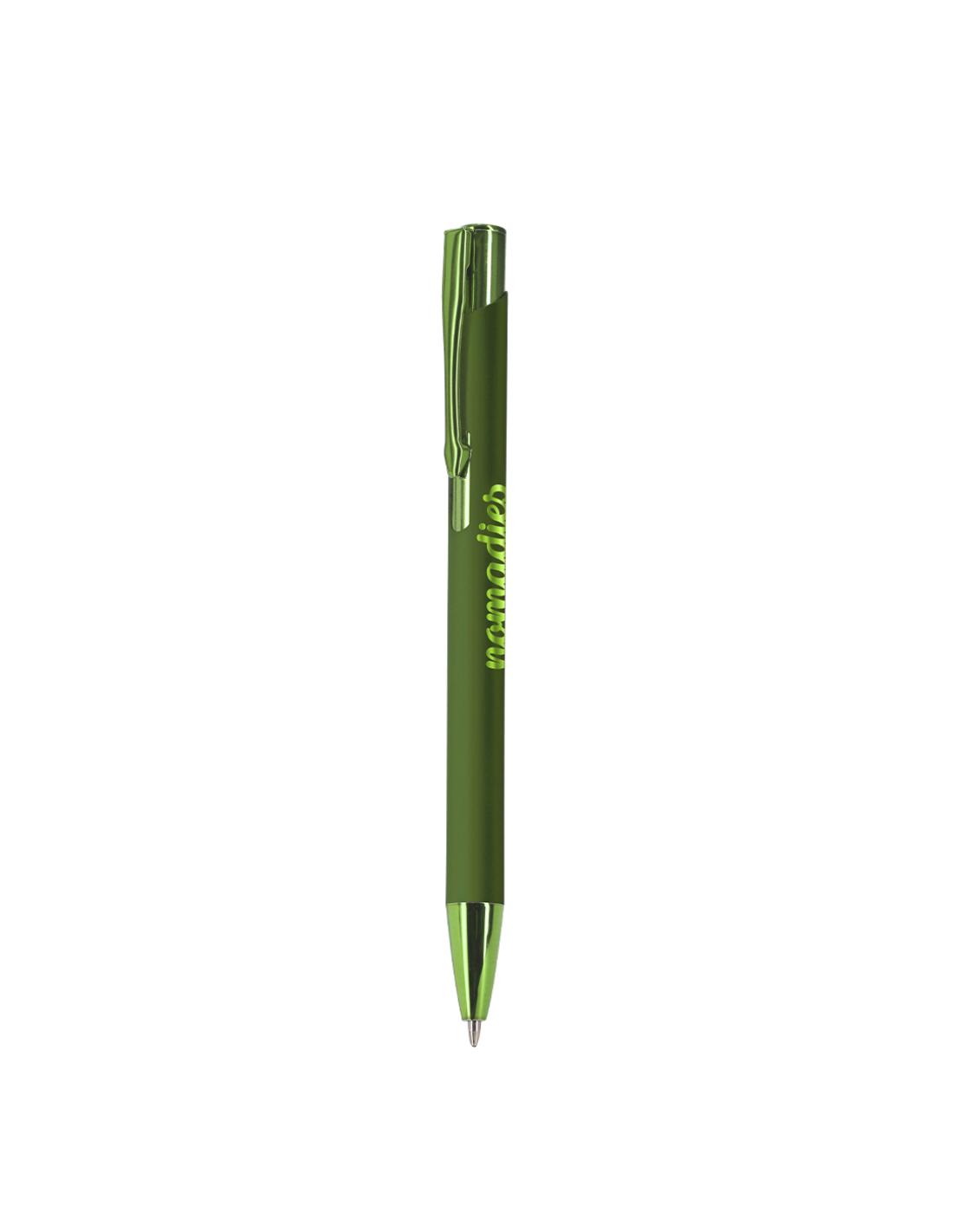 Bolígrafo de mecanismo pulsador. Acabado en aluminio reciclado gomoso, de cartucho jumbo y tinta azul. Diseño especial para grabado láser con resultado en efecto espejo.Con distintivo logo de Aluminio Reciclado.
