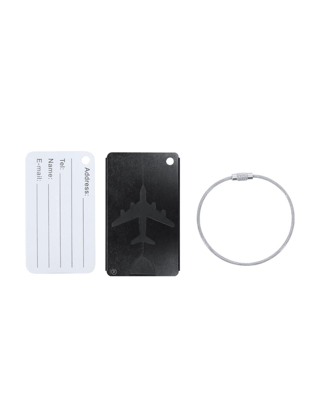 Original identificador de maletas con diseño de avión en resistente Aluminio Reciclado. Con cinta de acople en acero inoxidable con sistema de cierra en rosca y tarjeta de identificación en inglés con los siguientes campos impresos; Addres, Tel, Name, E-mail. Logo AL Recycled grabado por láser.