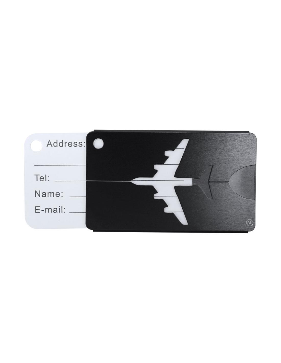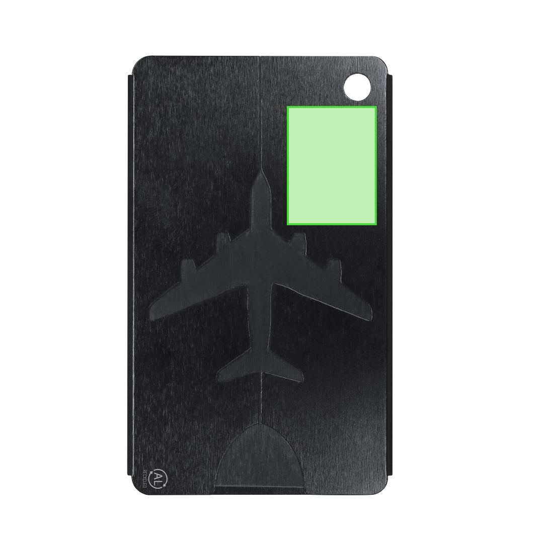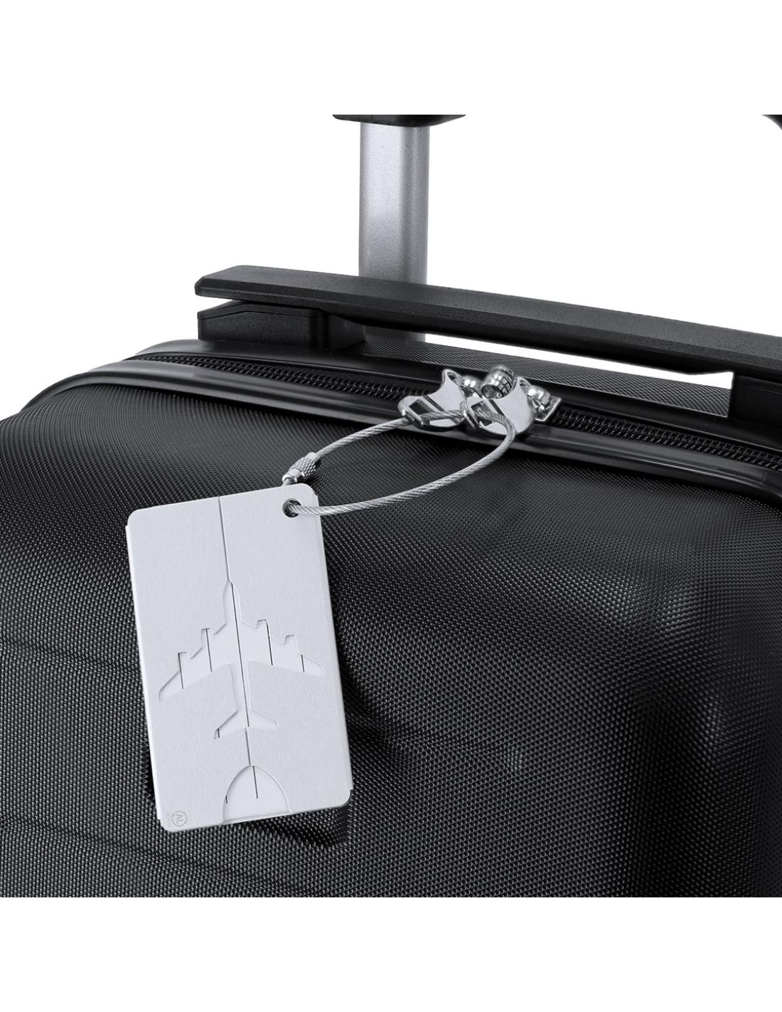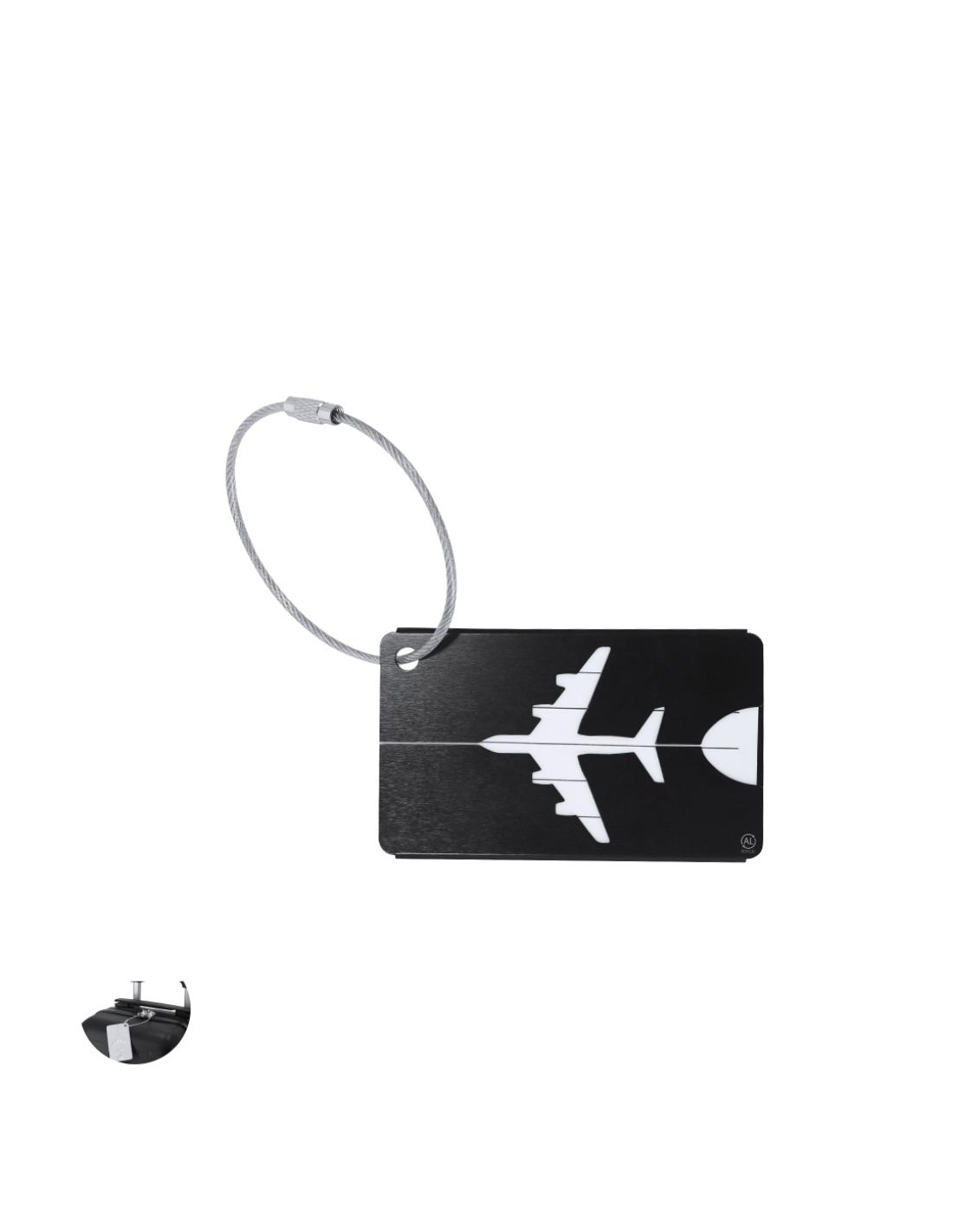 Original identificador de maletas con diseño de avión en resistente Aluminio Reciclado. Con cinta de acople en acero inoxidable con sistema de cierra en rosca y tarjeta de identificación en inglés con los siguientes campos impresos; Addres, Tel, Name, E-mail. Logo AL Recycled grabado por láser.