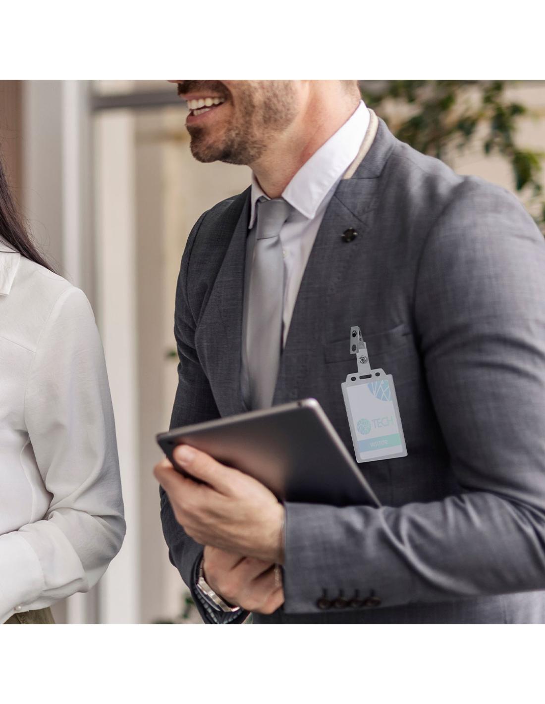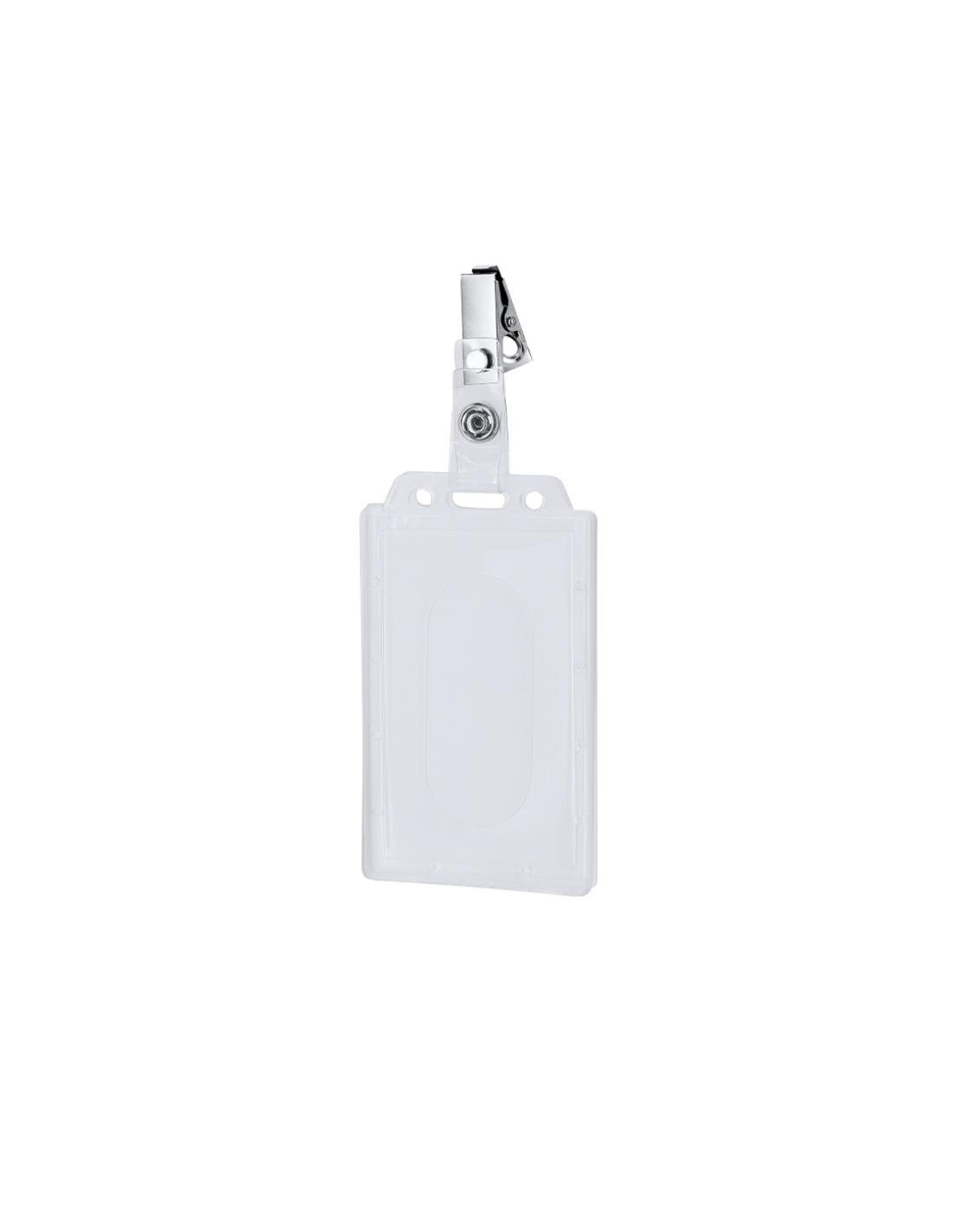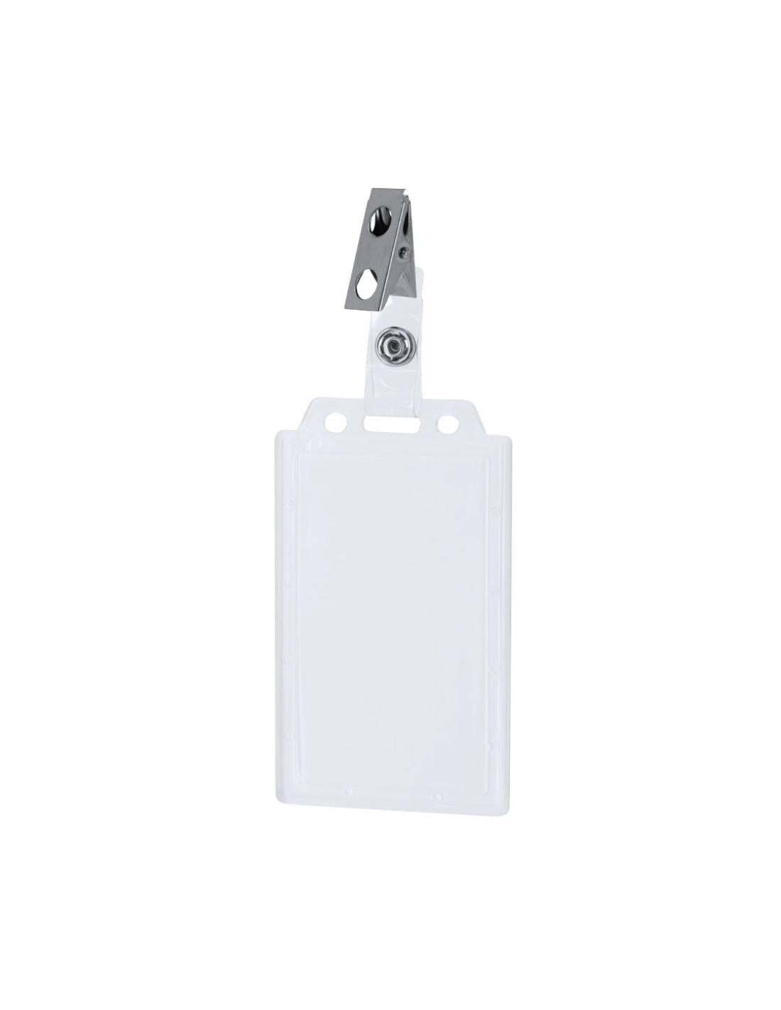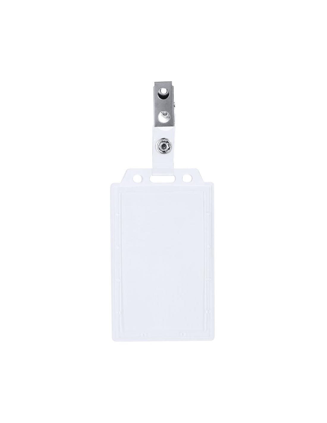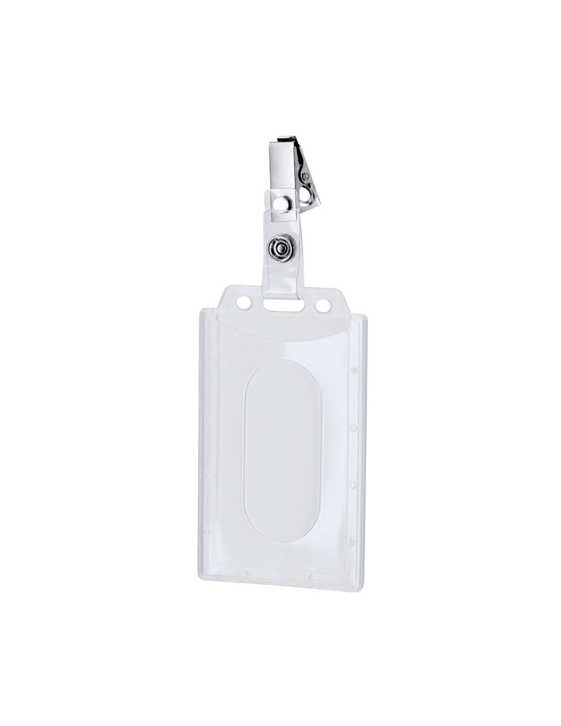 Identificador de PS rígido con pinza metálica en orientación vertical. Ideal para llevar colgado y mostrar tu identificación. El sistema de cierre es extraíble y puedes utilizar el identificador en conjunto con lanyard.