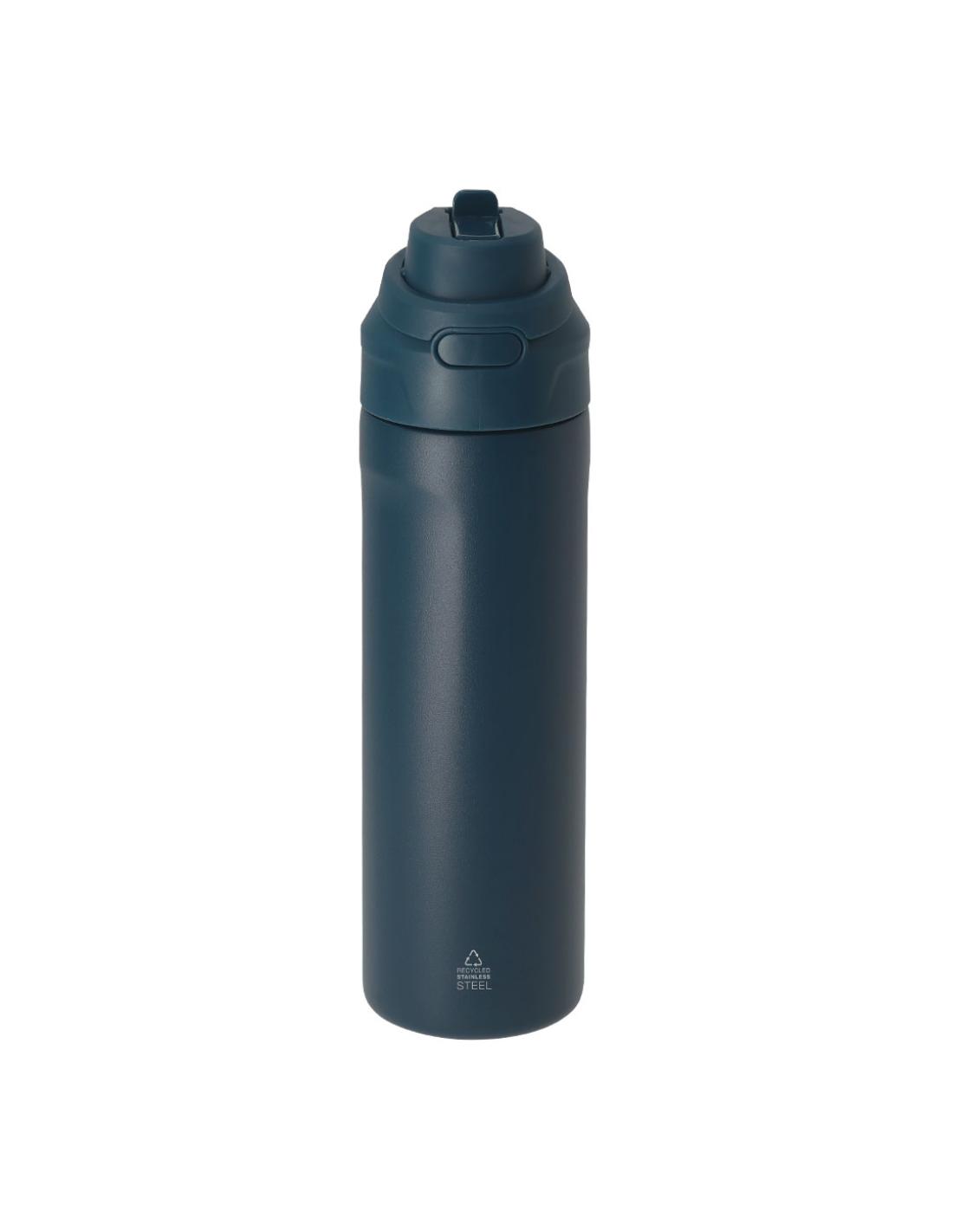 Bidón térmico con 700 ml de capacidad. Fabricado en Acero Inoxidable Reciclado. Cuenta con doble pared y dos sistemas de bebida: orificio con cierre hermético con apertura en push y pajita integrada, adaptándose a las preferencias de uso. Con tapa de sistema de sellado hermético. Incluye práctica asa de transporte integrada, ideal para llevarlo fácilmente en cualquier situación. Libre de BPA. Con distintivo Acero Inoxidable Reciclado.