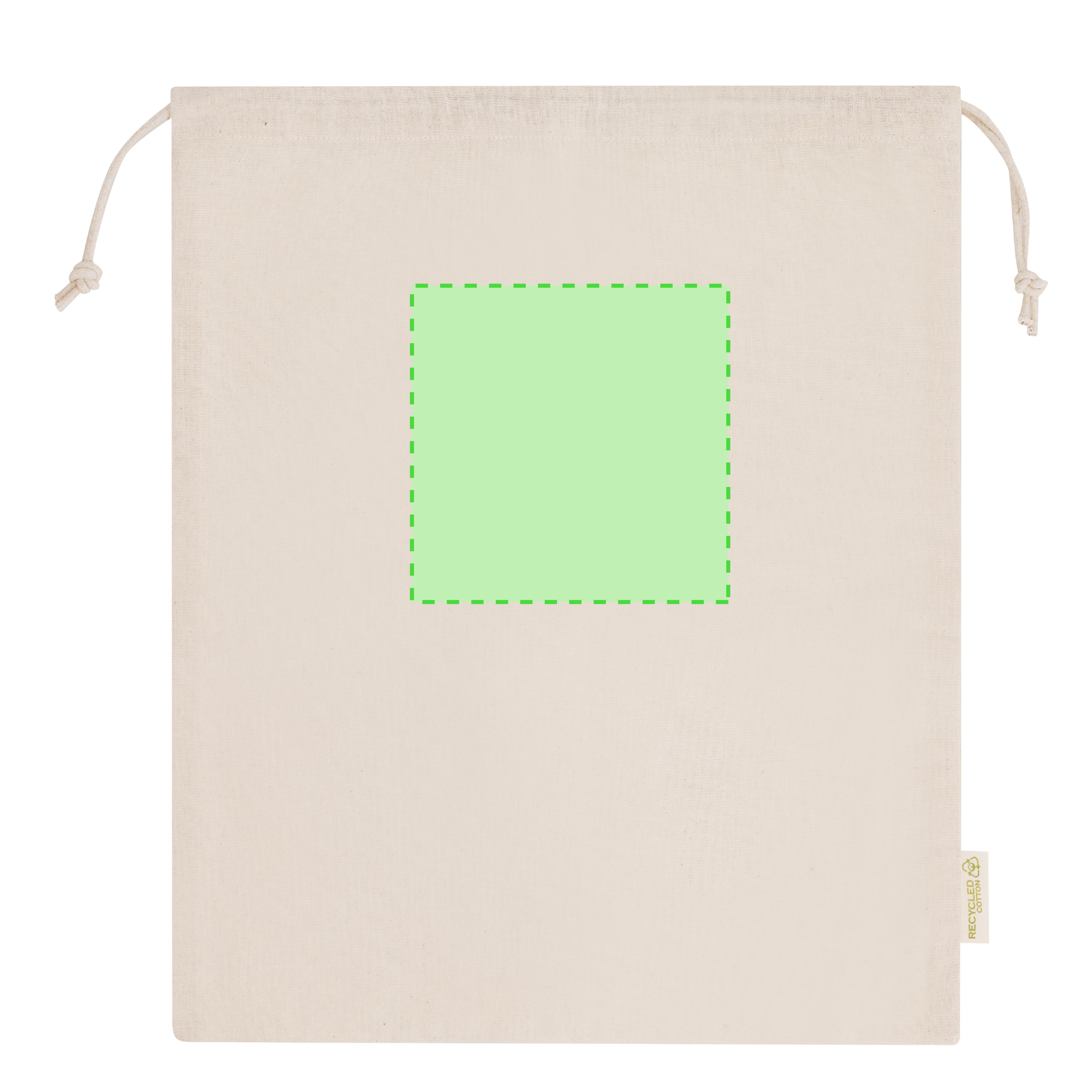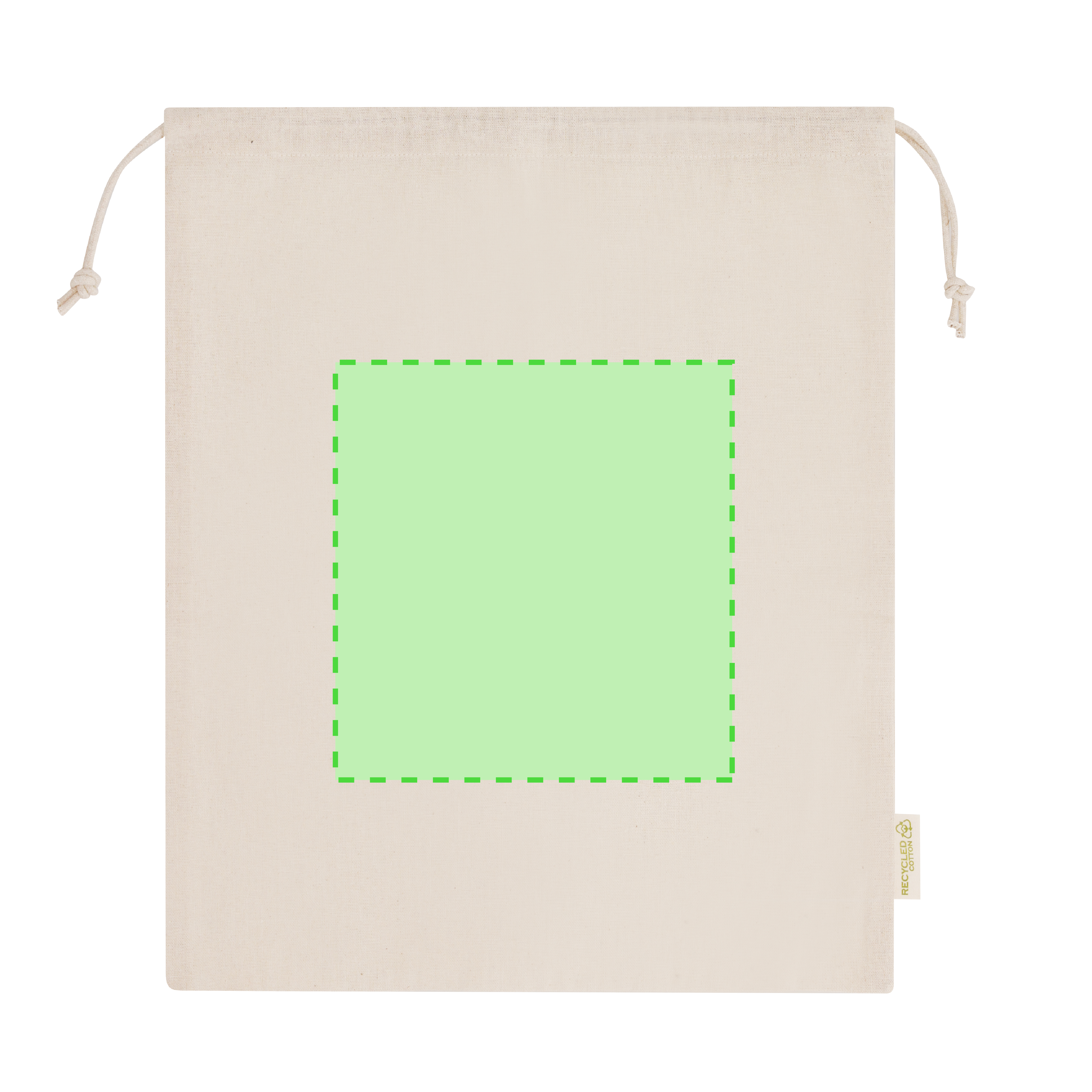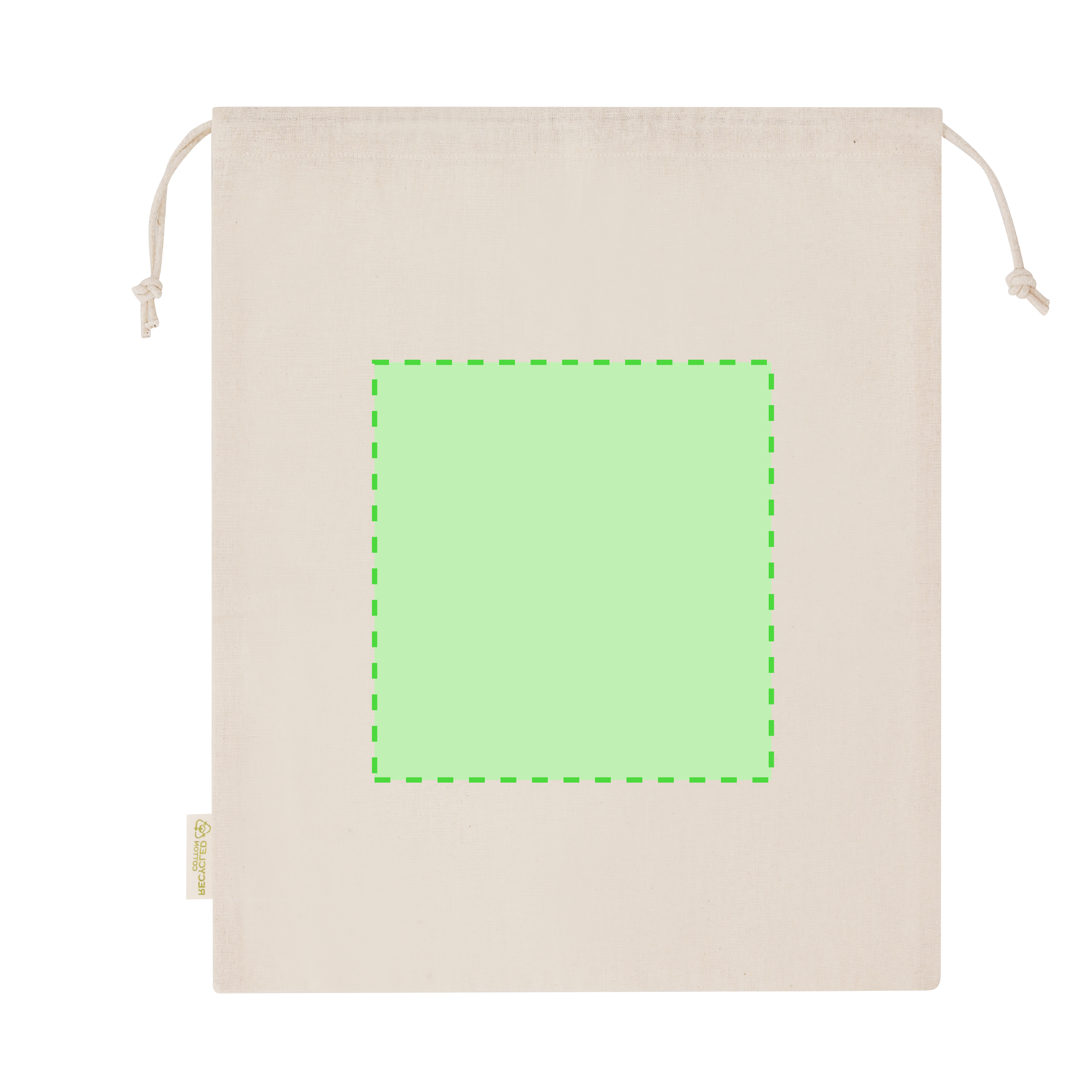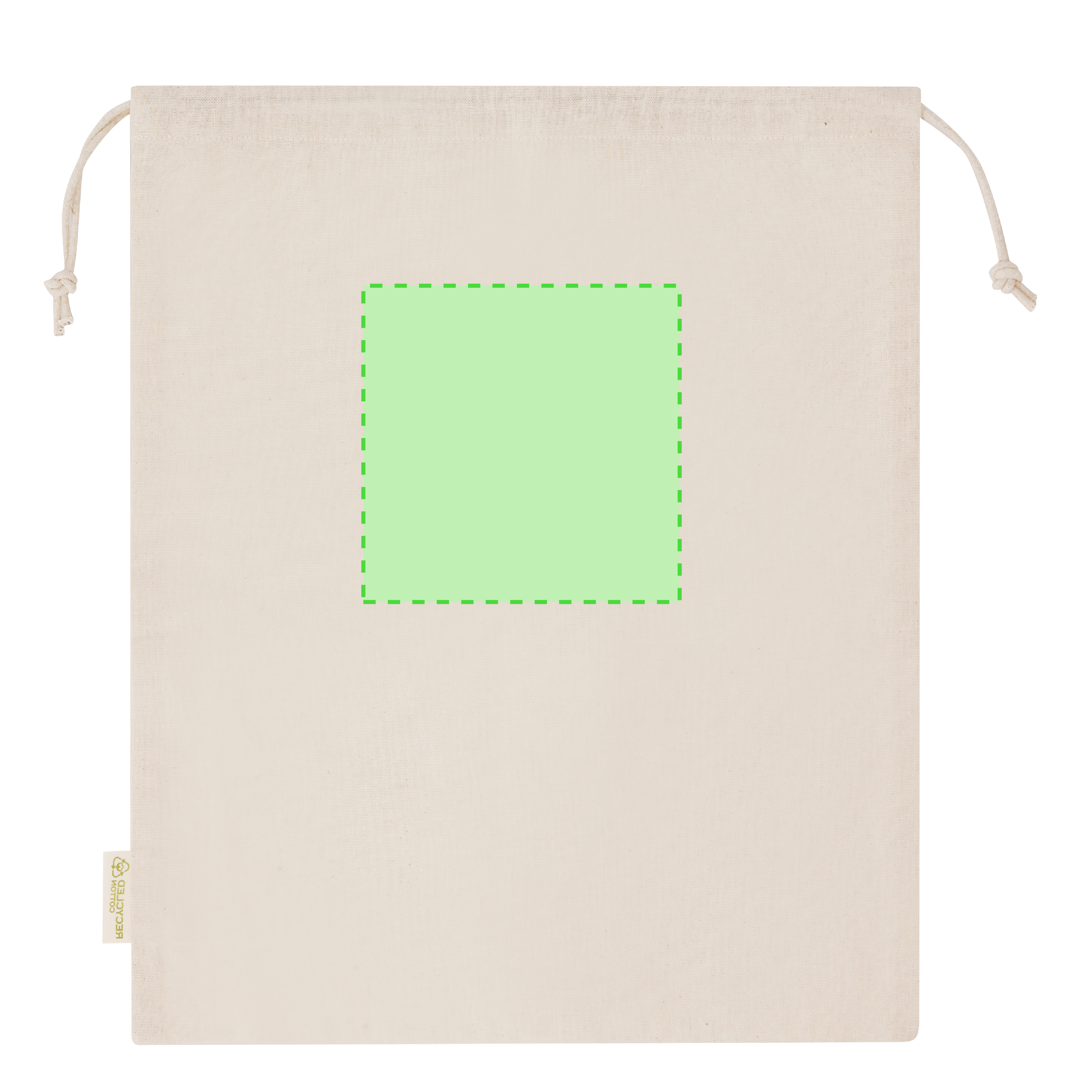 Bolsa en algodón reciclado120g/m2. Con cordones para ajustar cierre. Resistencia máxima de 4 kg. Logotipo en etiqueta lateral.