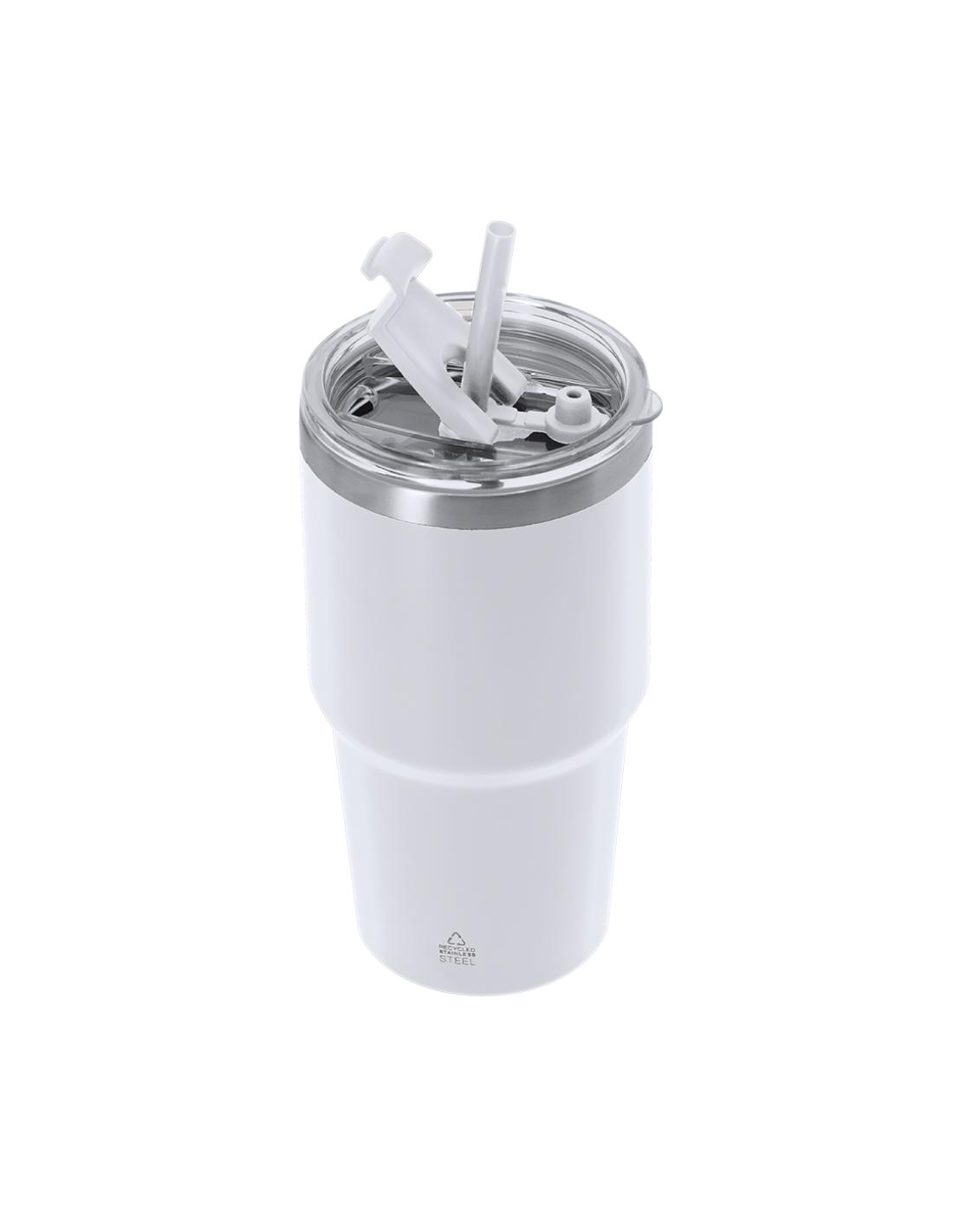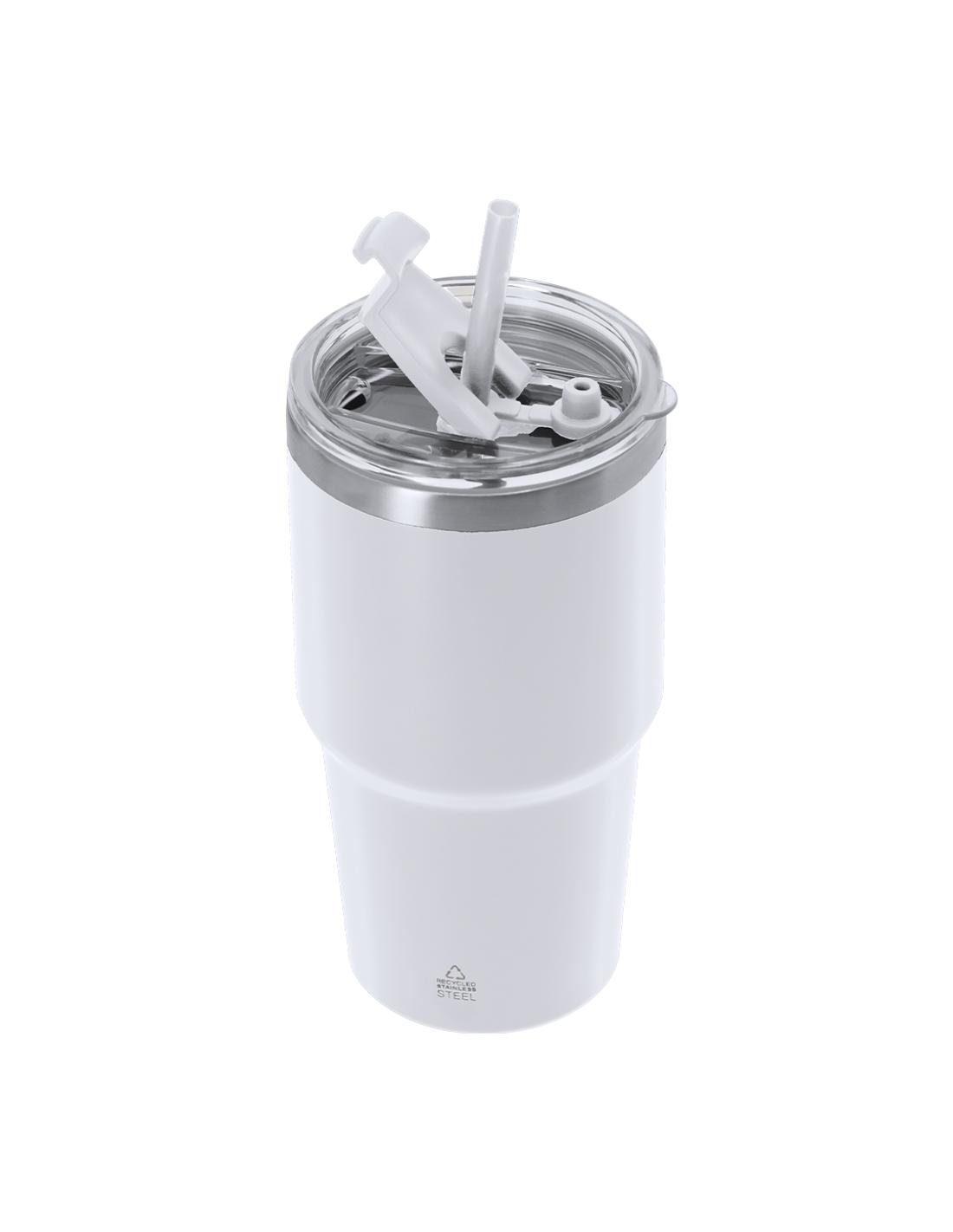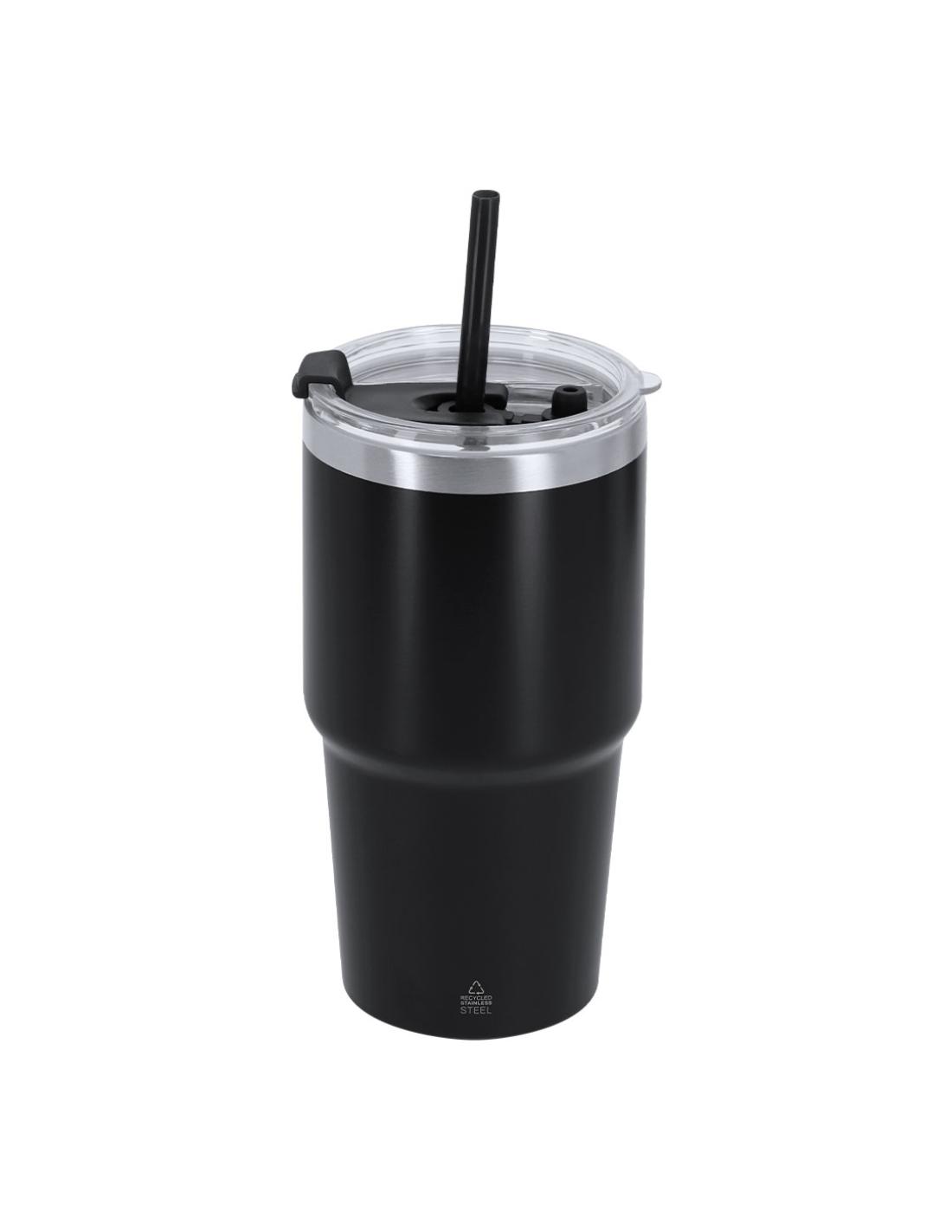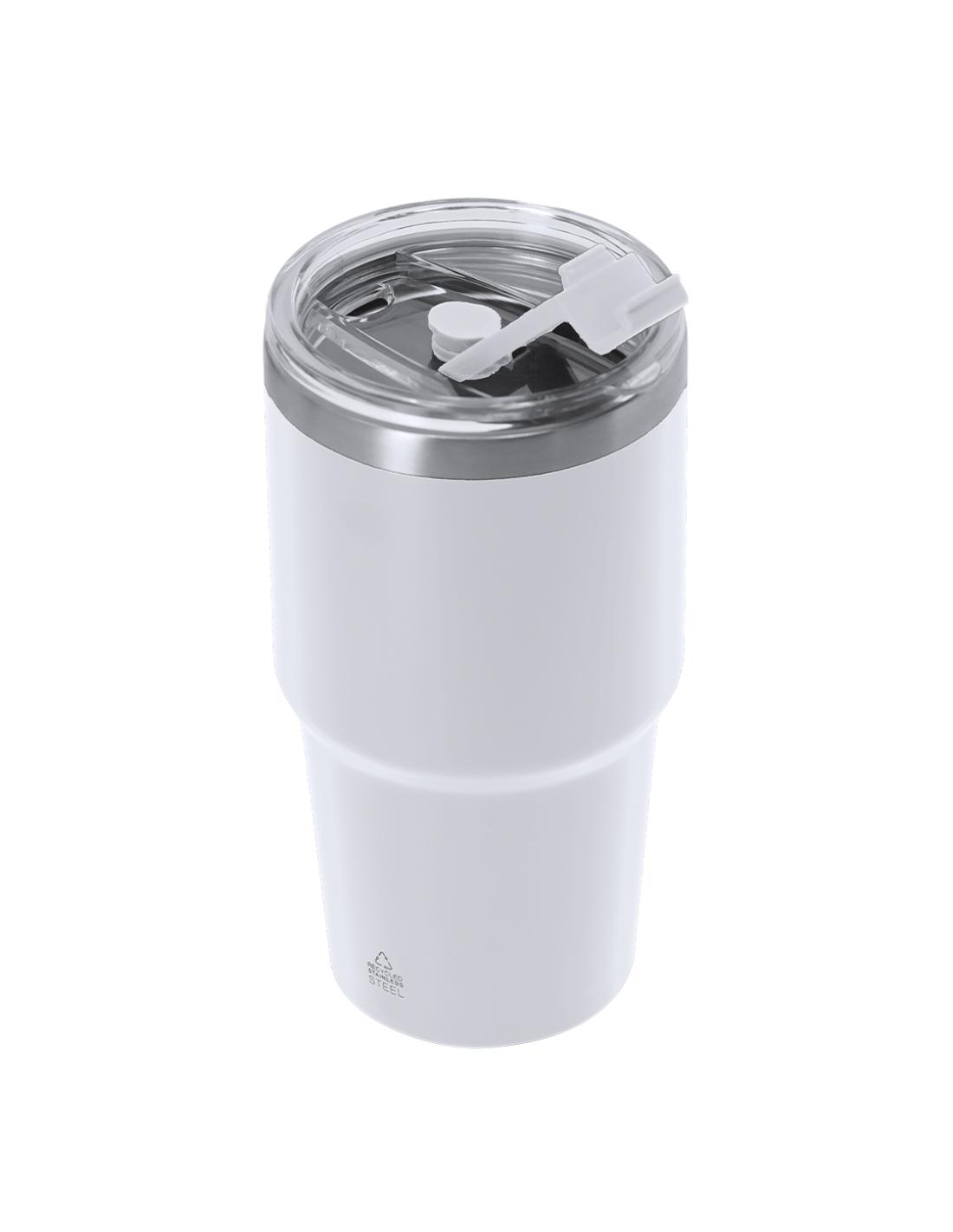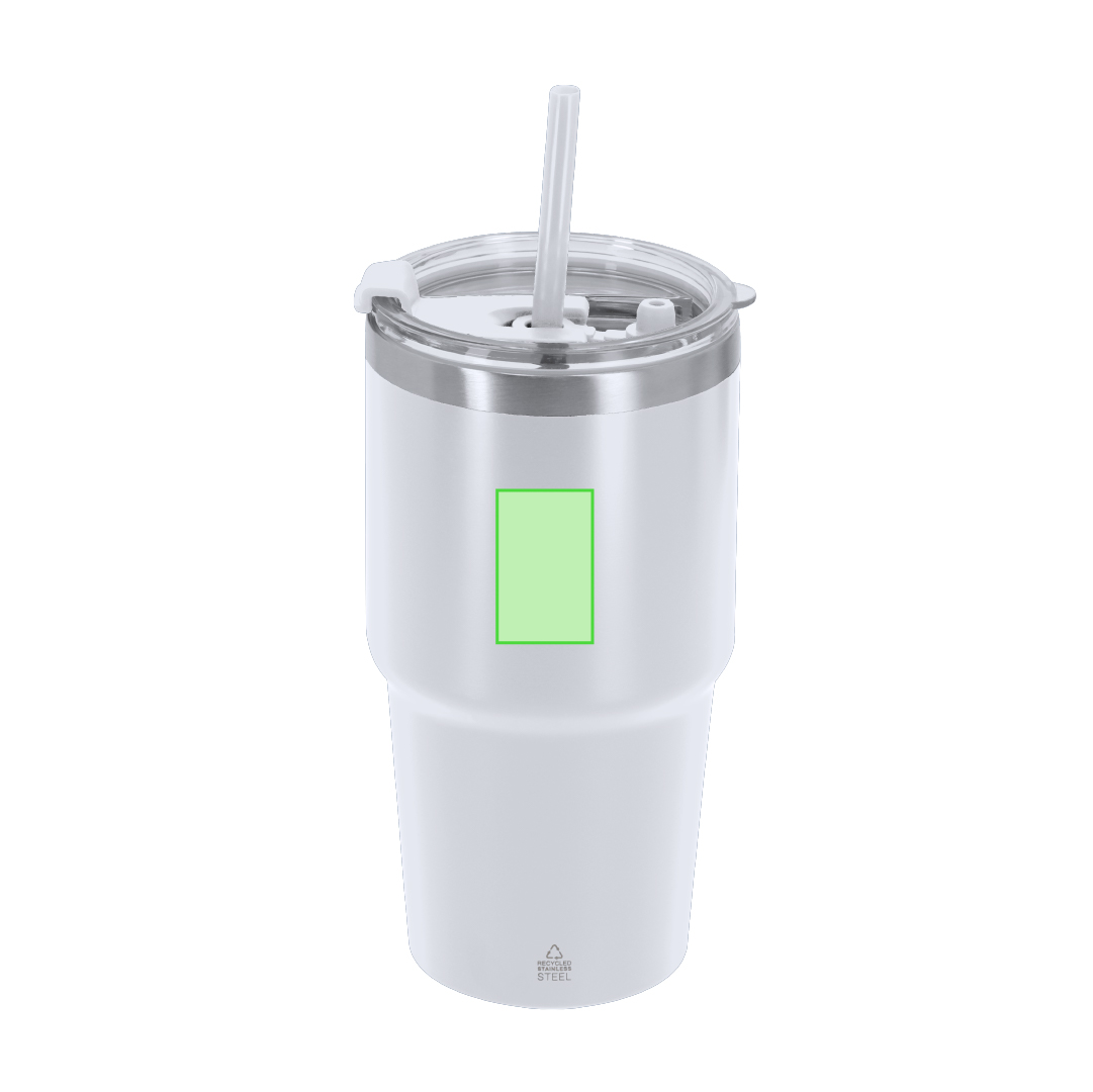 Vaso térmico fabricado en acero inox reciclado de doble pared y 650 ml de capacidad. Cuenta con doble sistema de bebida: orificio con cierre hermético y pajita integrada, adaptándose a las preferencias de uso. Cuenta con tapón para cierre hermético cuando se extrae la pajita. Es ideal para tener en tu escritorio, mesa o en cualquier superficie donde disfrutar tranquilamente de tu bebida favorita. Con logotipo Acero Inox Reciclado.
