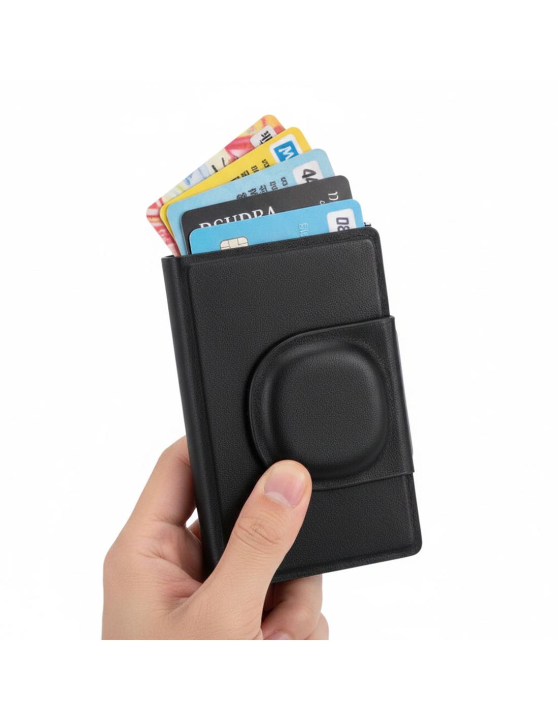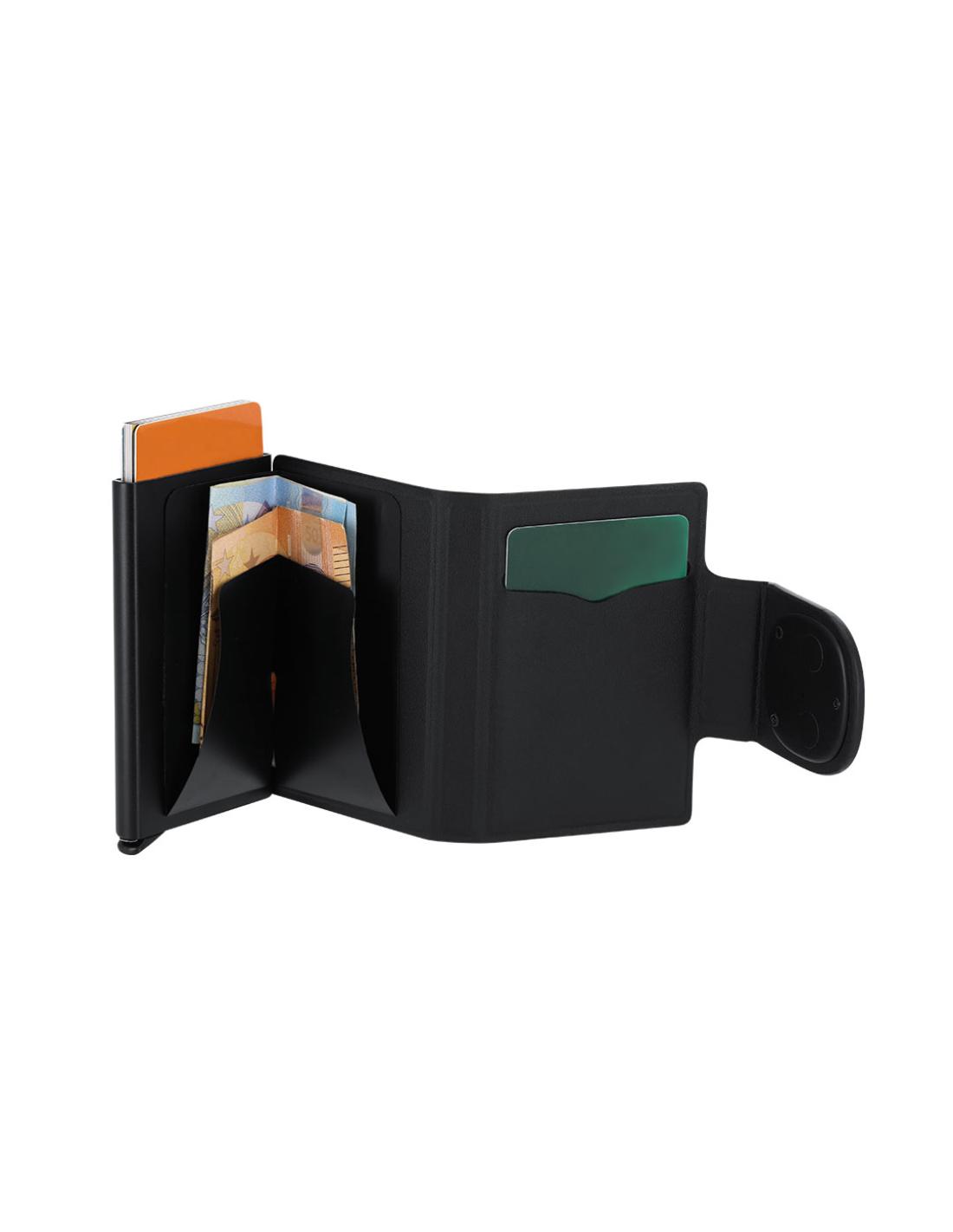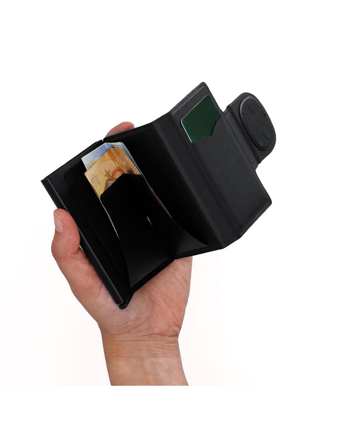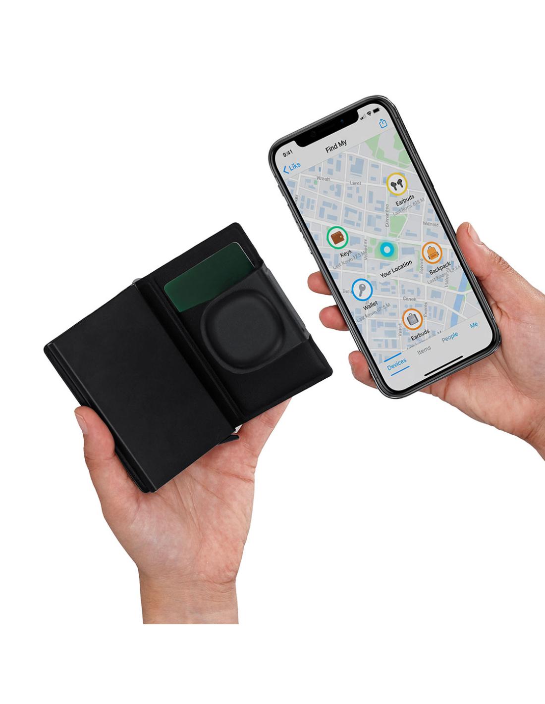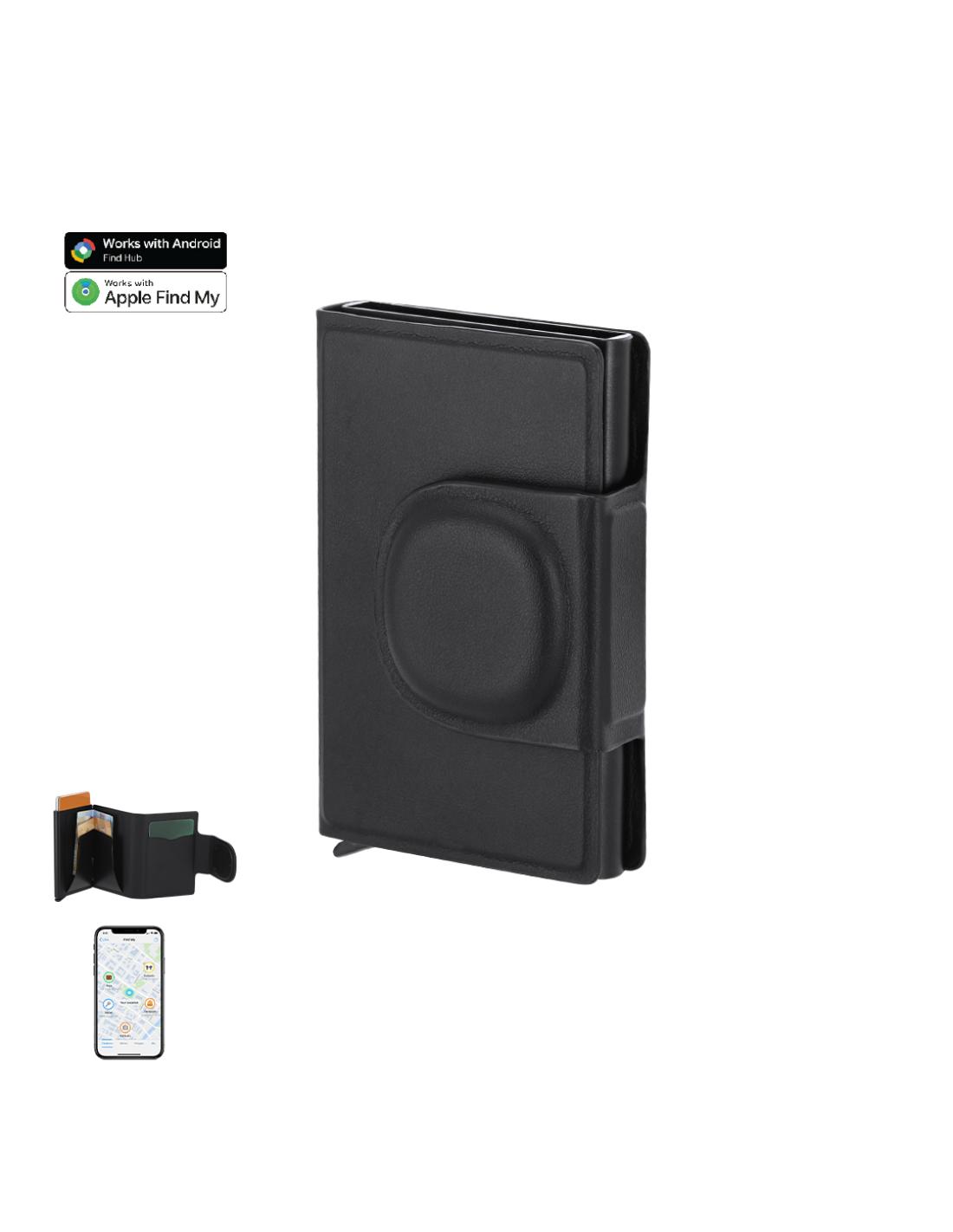 Tarjetero localizador inteligente en PU. Capacidad para hasta 10 tarjetas. Con sistema de conexión dual, compatible con Apple Find My y Android Find Hub, el cual te permite rastrear tus pertenencias en tiempo real, de forma rápida y precisa. Con cierre magnético para mayor seguridad. Pila de botón incluida.