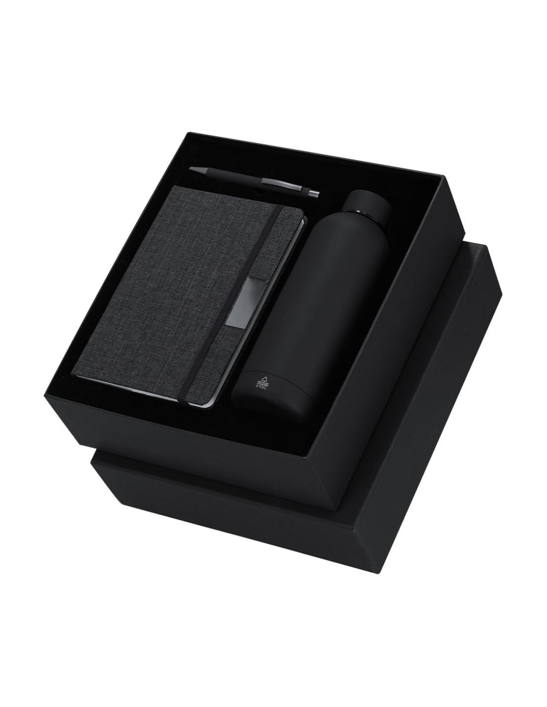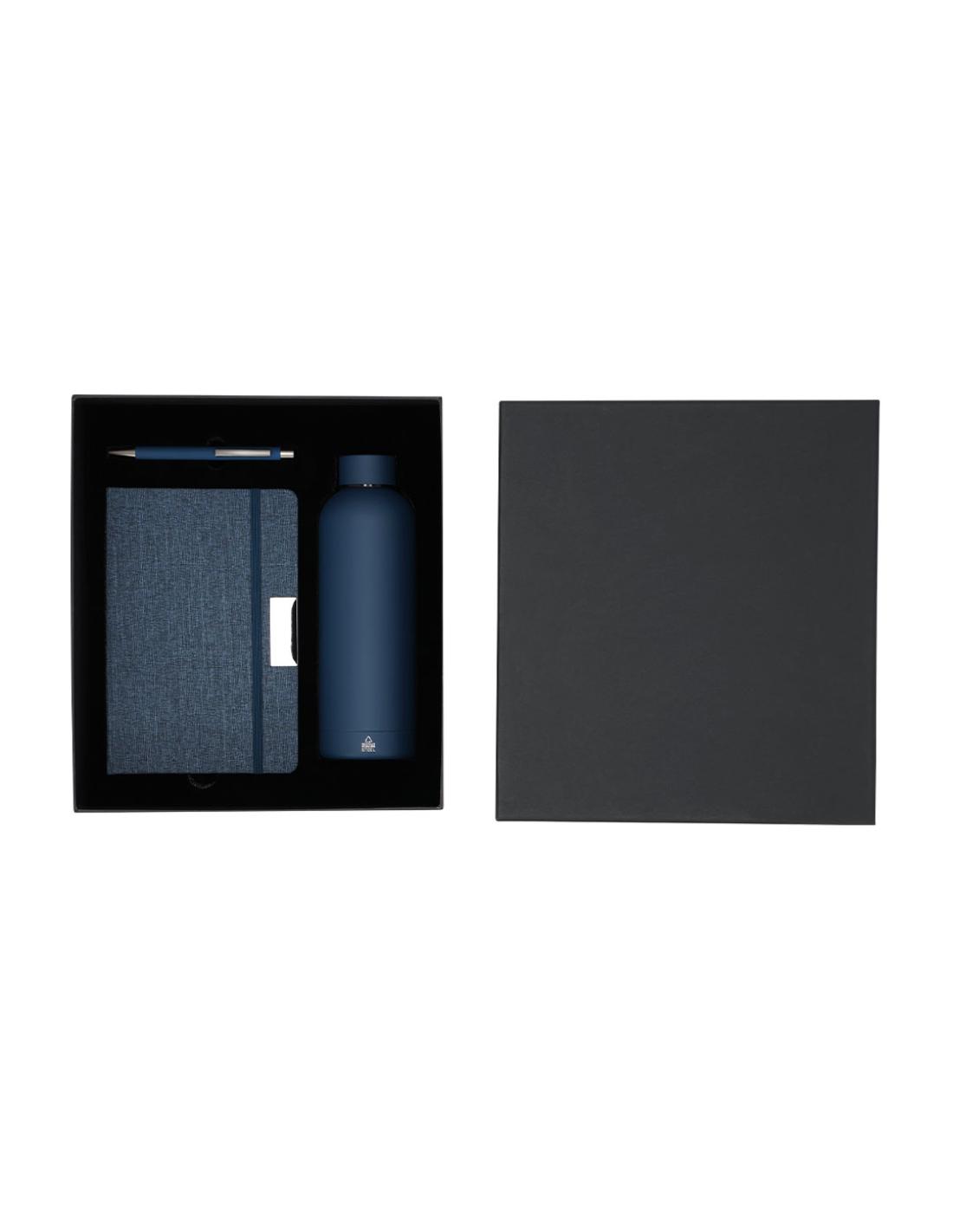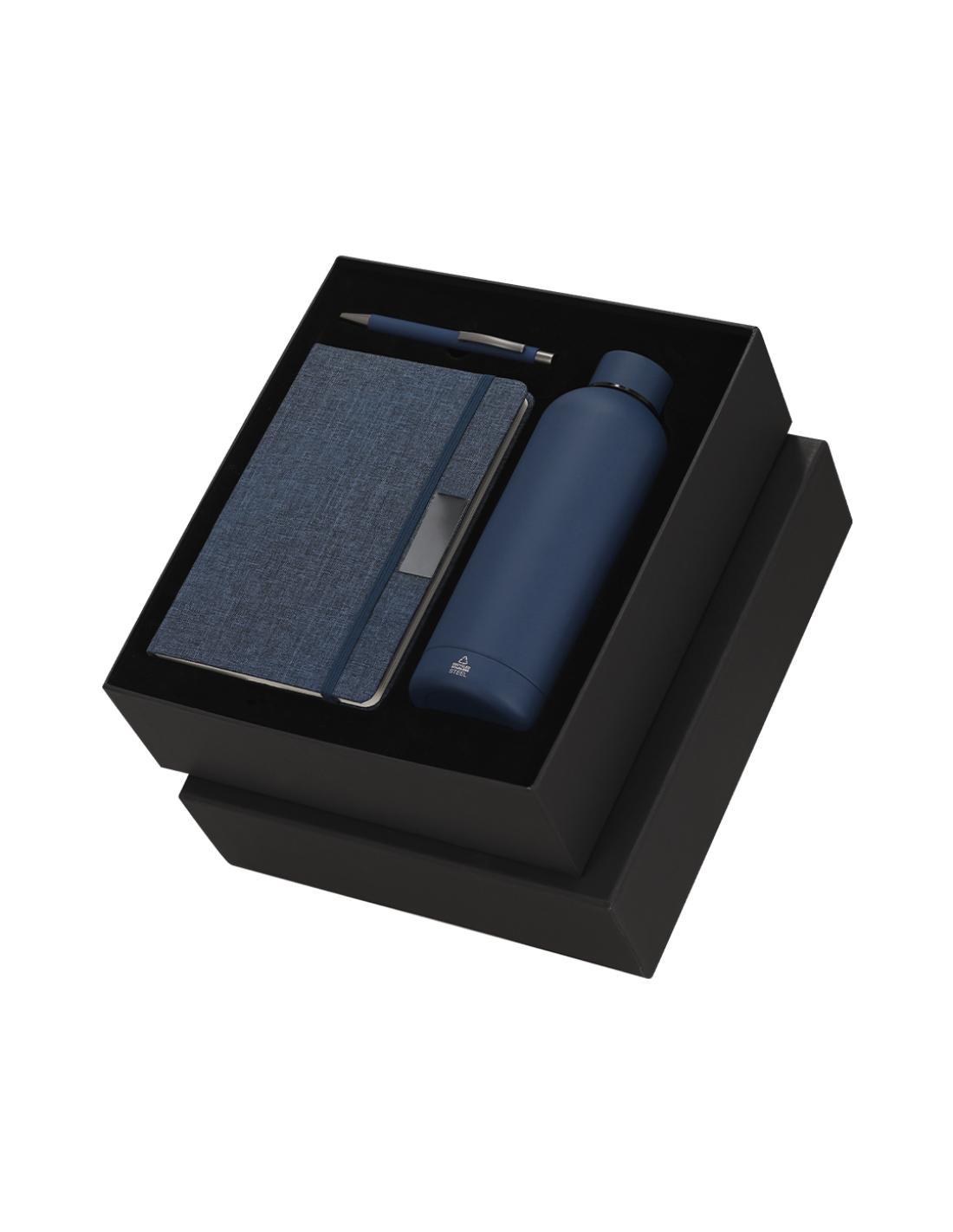 Set de bloc de notas y bolígrafo , además de un bidón térmico fabricado en acero inox.El set incluye:- Bloc de notas de tapas rígidas en RPET, con 80 páginas rayas, banda elástica con clip metálico y marcapáginas a juego.- Bolígrafo de aluminio reciclado en acabado gomoso, carga jumbo y tinta azul.- Bidón térmico de doble pared fabricado en acero inox de 500ml. Con tapón a rosca. Con distintivo logotipo Acero Inoxidable Reciclado.