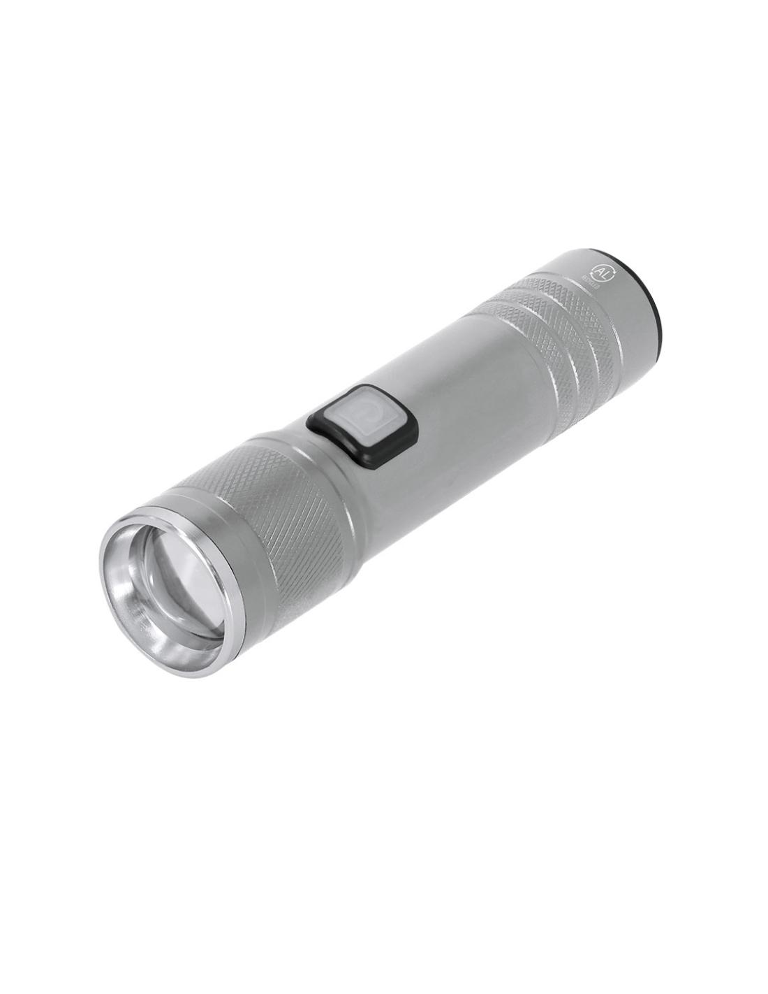 Linterna fabricada en Aluminio reciclado de acabado mate con zoom extensible. Con 1 luz COB con tres posiciones, alimentadas con batería de capacidad 800mAh, cable de carga Tipo C incluido de 5V. Con botón on/off en lateral y elementos decorativos cromados.