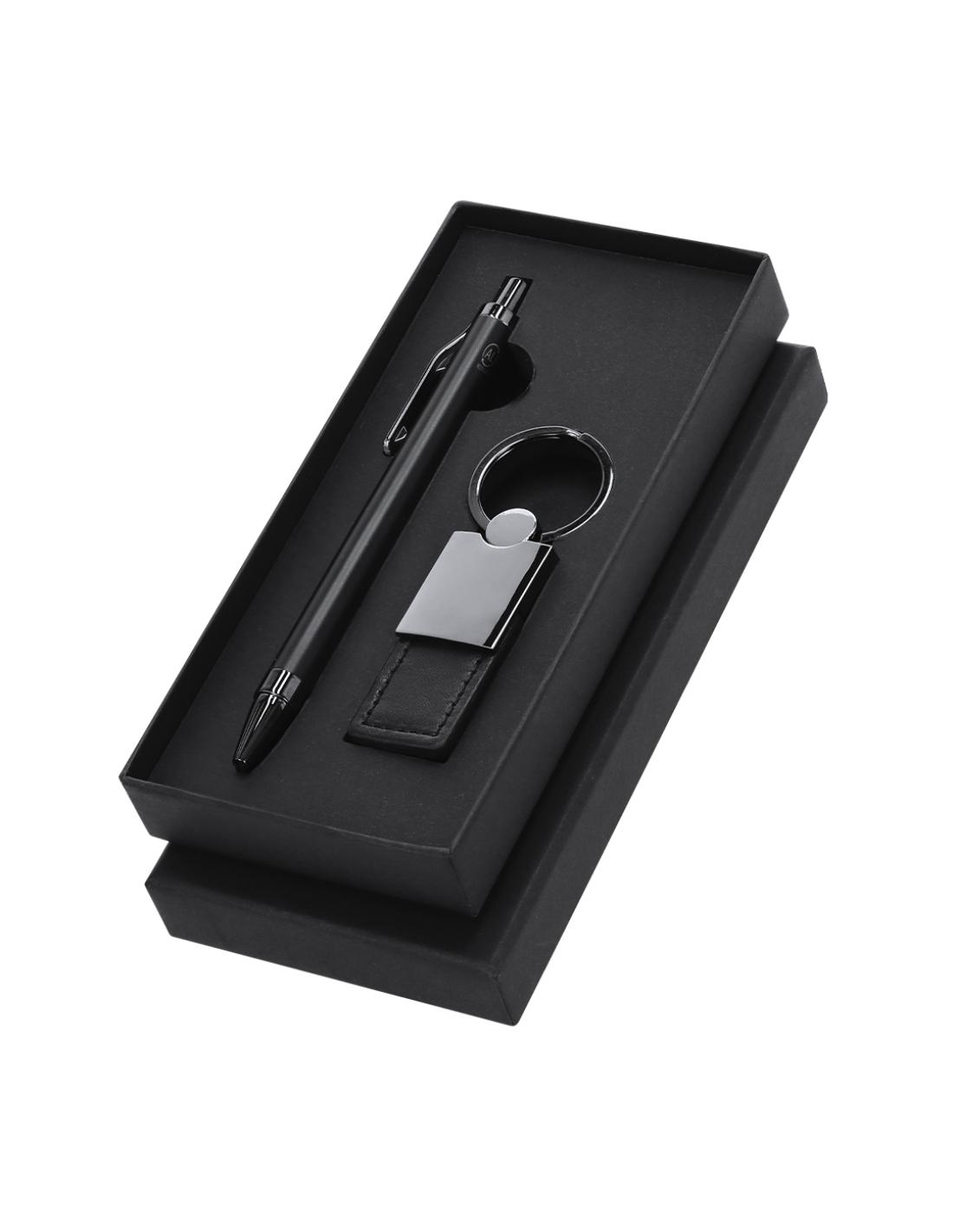 Elegante set premium que incluye:Bolígrafo en Aluminio Reciclado de acabado negro mate, de mecanismo pulsador y tinta azul. Con clip y puntera en pulido ABS. Incluye distintivo Aluminio reciclado.Elegante llavero con cinta fabricada en poliéster PU y accesorios cromados.