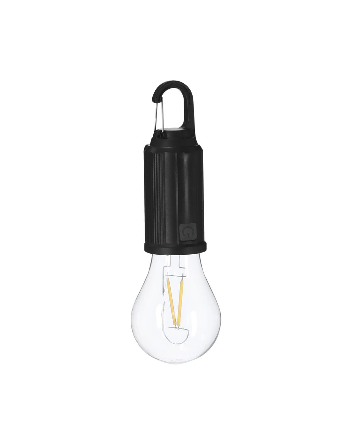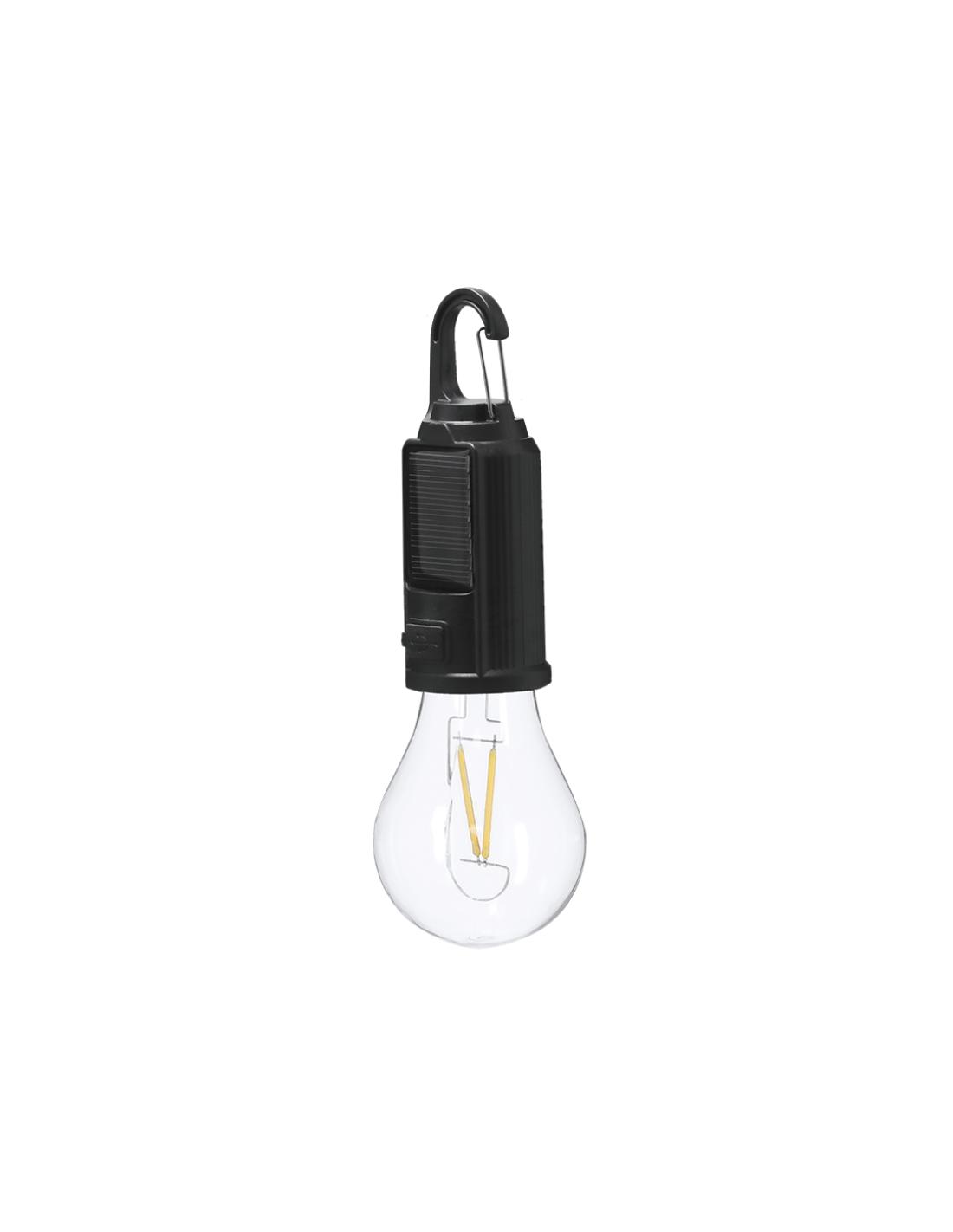 Lampara con original diseño de bombilla con cuerpo en ABS. Batería de 300 mAh y carga solar. Dispone de sensor nocturno que se activa automáticamente al no recibir luz solar. Dispone de carga a través de cable Tipo C, además de incluir mosquetón para fácil transporte.