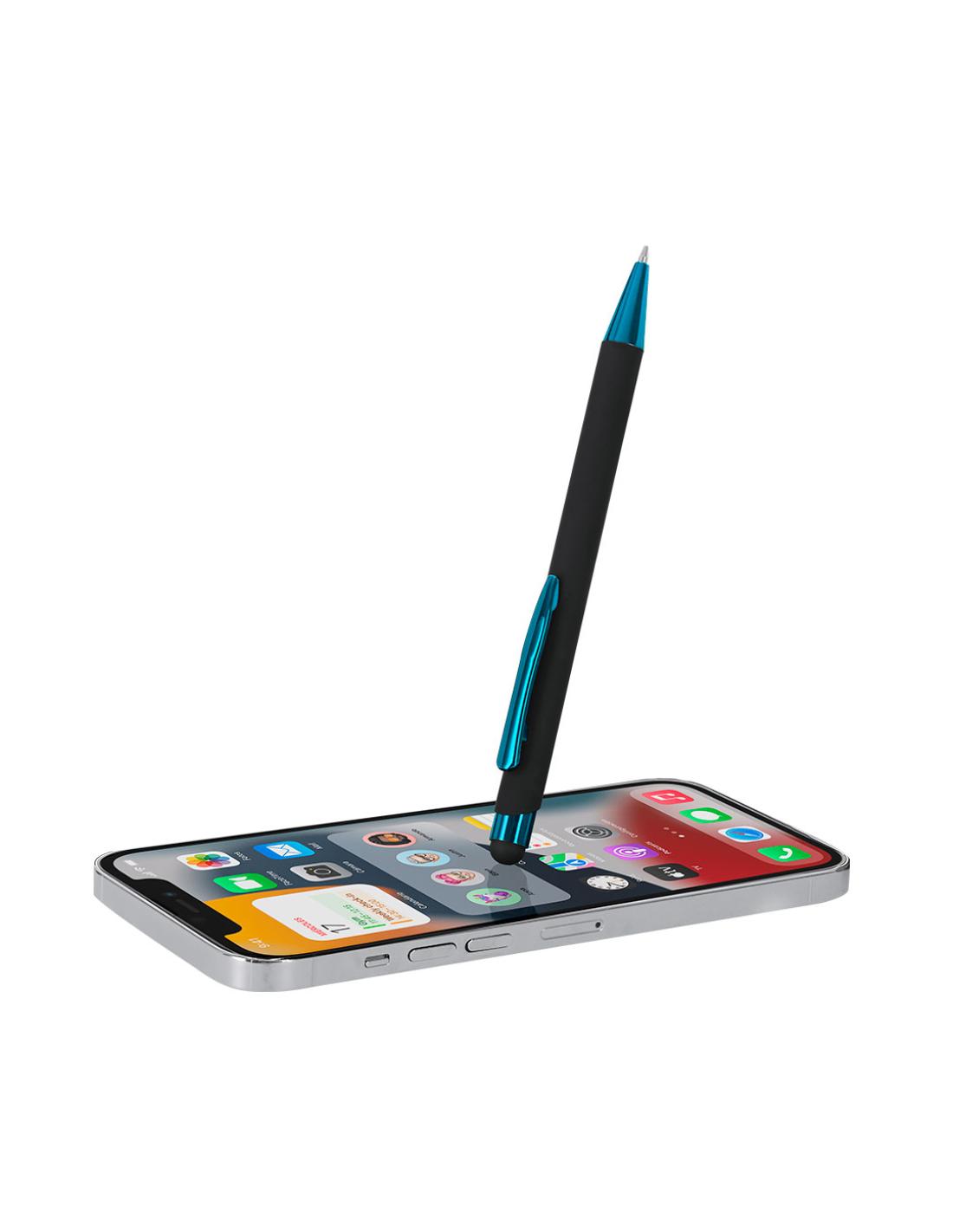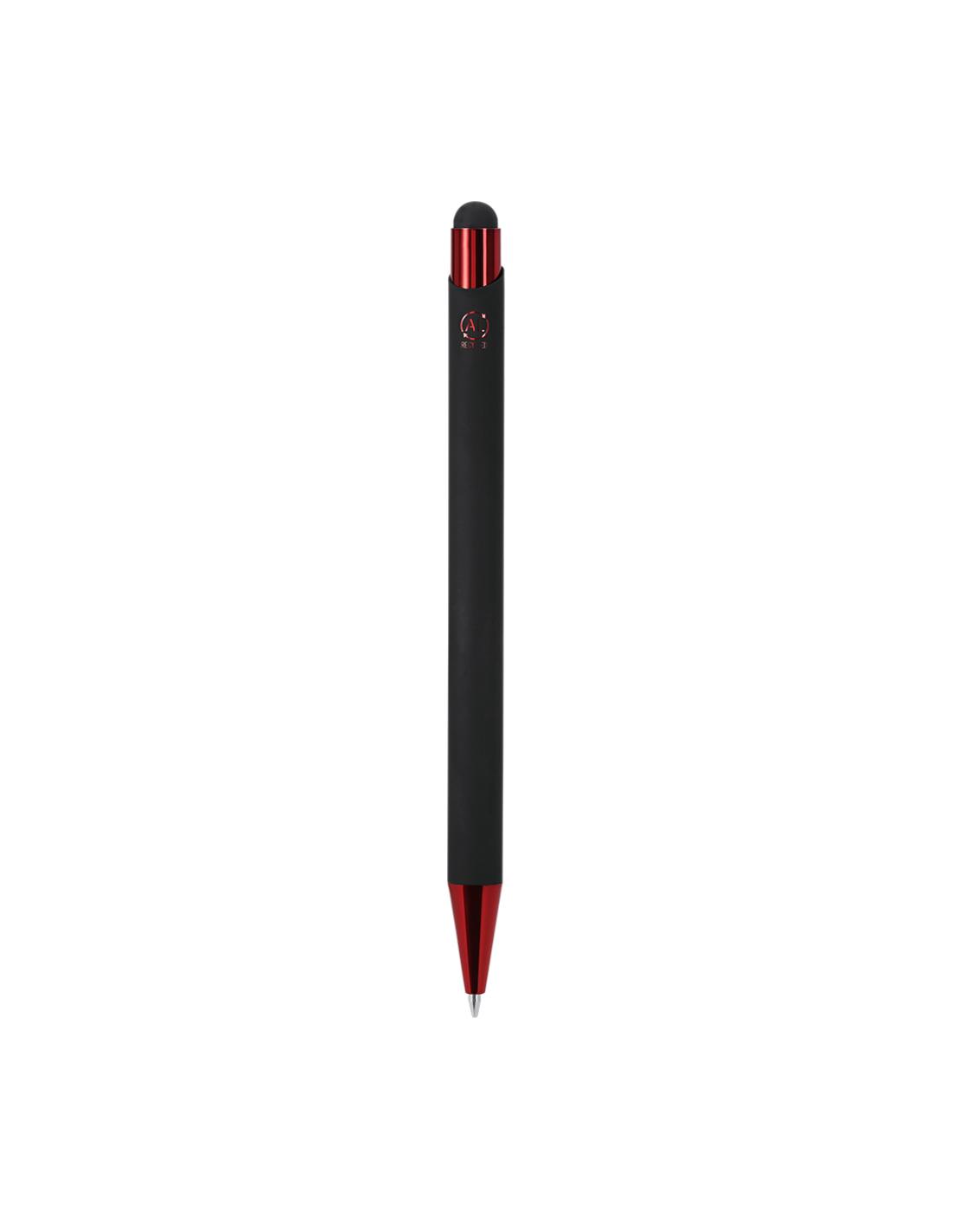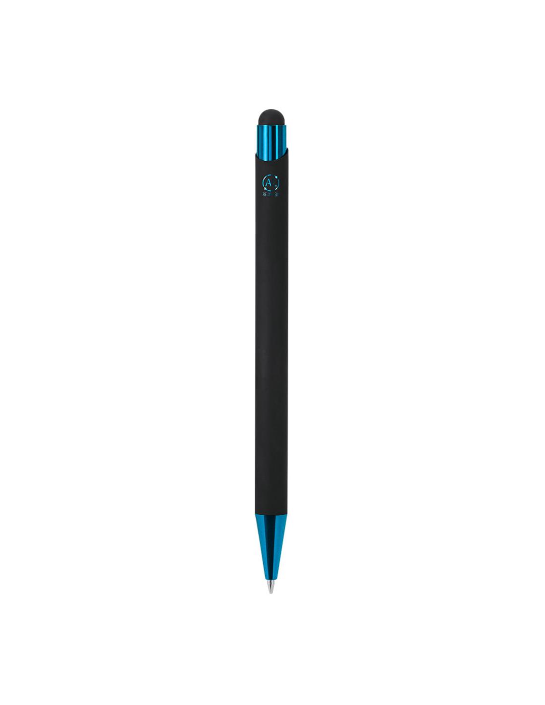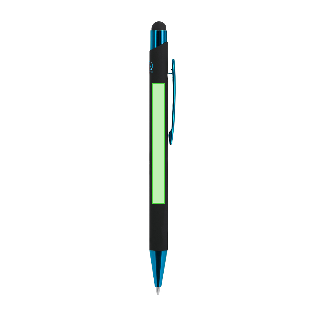 Bolígrafo puntero de mecanismo pulsador fabricado en aluminio reciclado. Pulsador, clip metálico y punta en acabado brillante. Cuerpo terminación en goma, especialmente diseñado para marcaje en láser con efecto espejo. Distintivo aluminio reciclado en la parte superior del bolígrafo. De carga jumbo y en tinta azul.