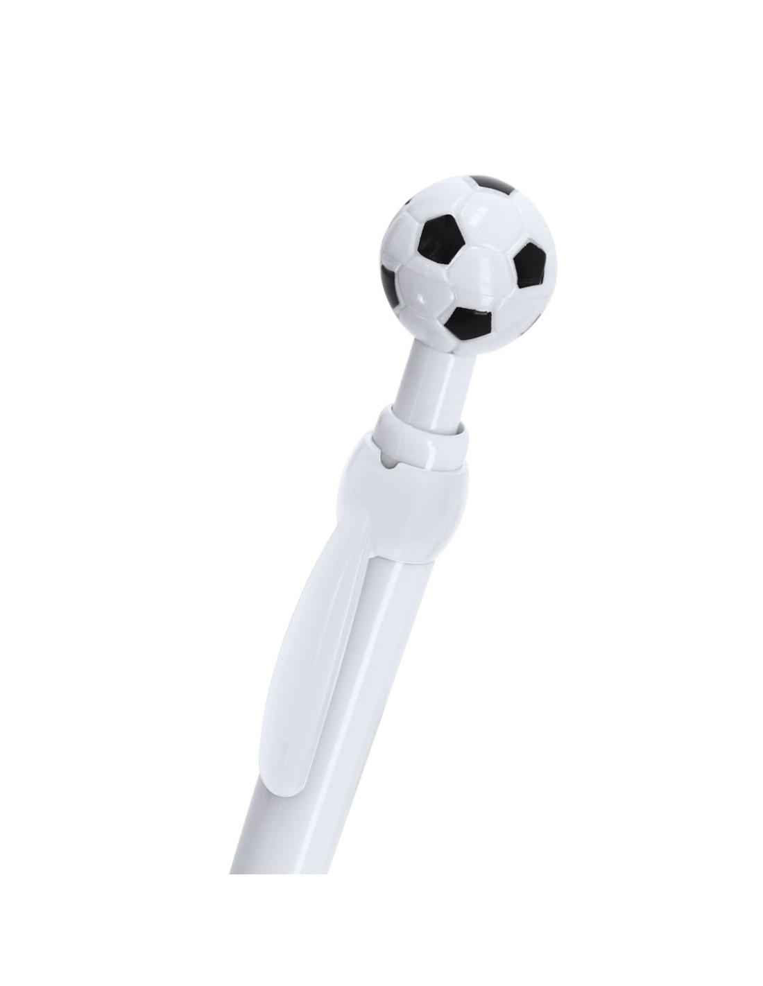 Bolígrafo de mecanismo pulsador fabricado en ABS. Pulsador con diseño de balón de futbol y cuerpo acabado brillante. En tinta azul.