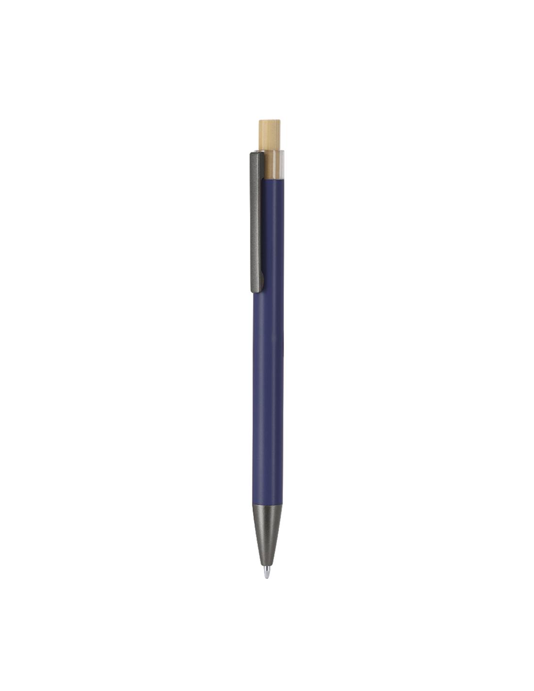 Bolígrafo de mecanismo pulsador fabricado en Aluminio reciclado. Pulsador en bambú y cuerpo gris acabado mate. Clip y punta en negro. De carga jumbo y en tinta azul.