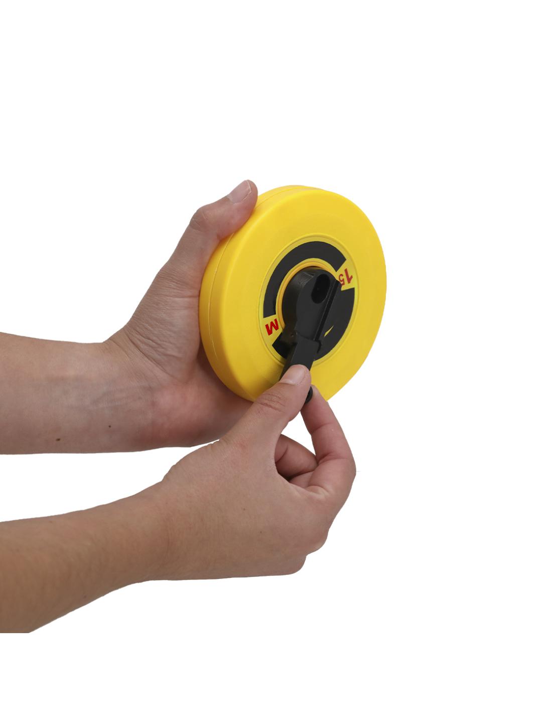 Cinta métrica 15 metros de largo en estuche PP y mecanismo en manivela. Escala impresa en cinta de PVC en negro para cm, y rojo para las pulgadas.