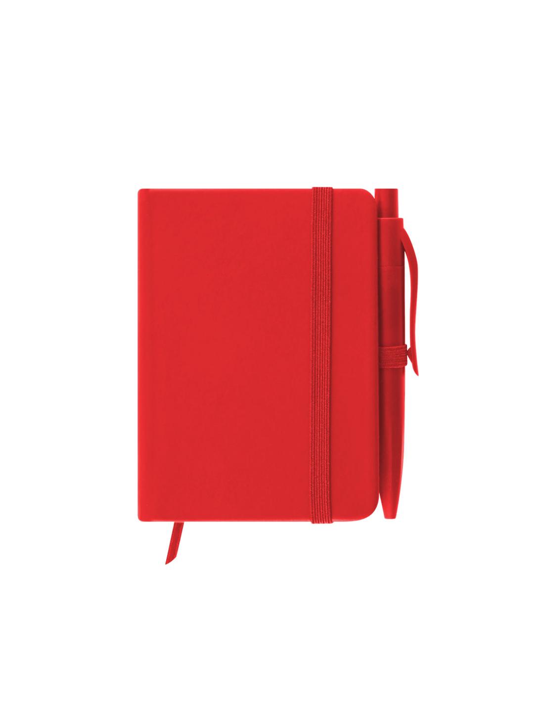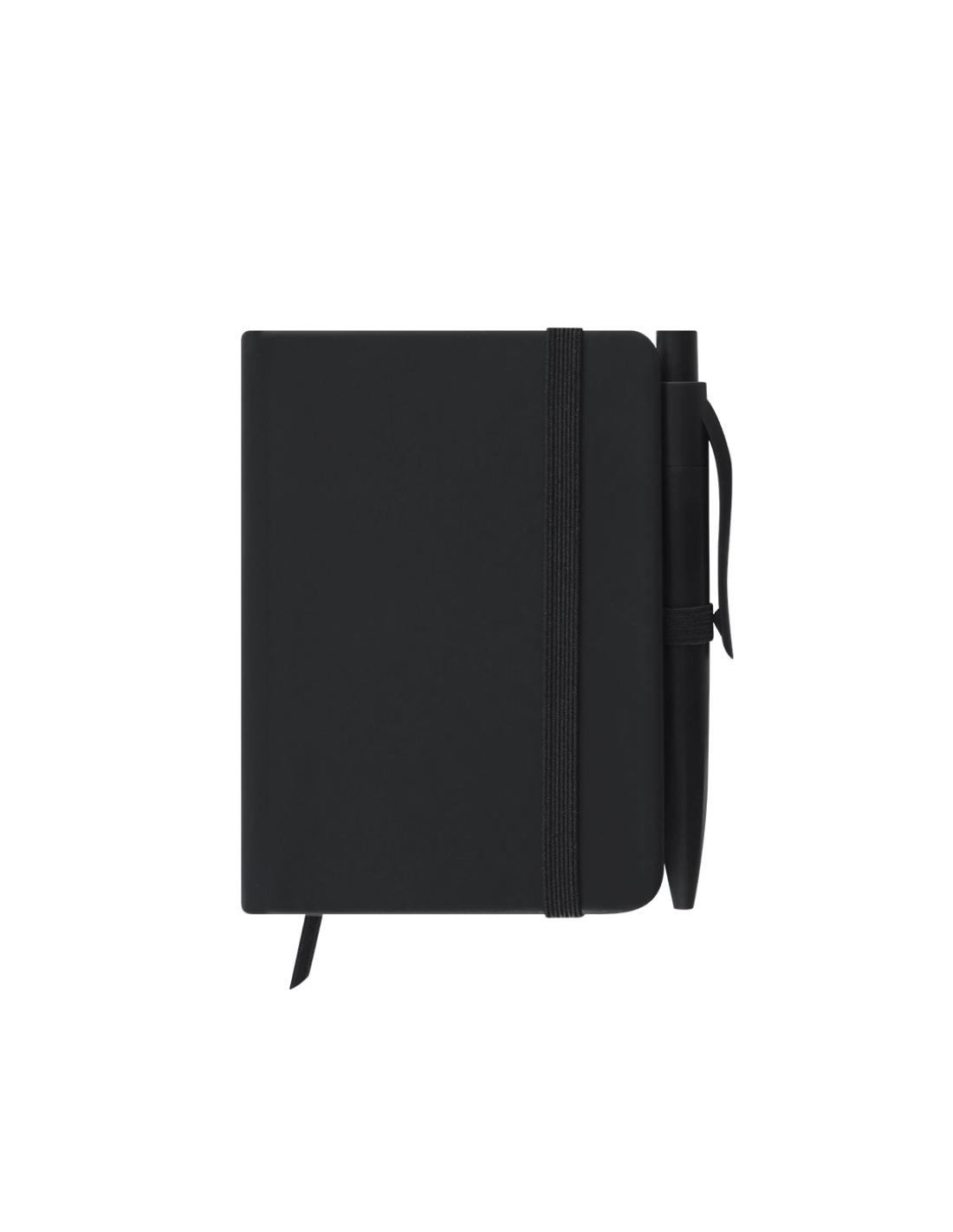 Bloc de notas con tapas rígidas en PU. Incluye 80 hojas en disposición de una raya, elástico de sujeción, marcapáginas de tela y bolígrafo a juego.