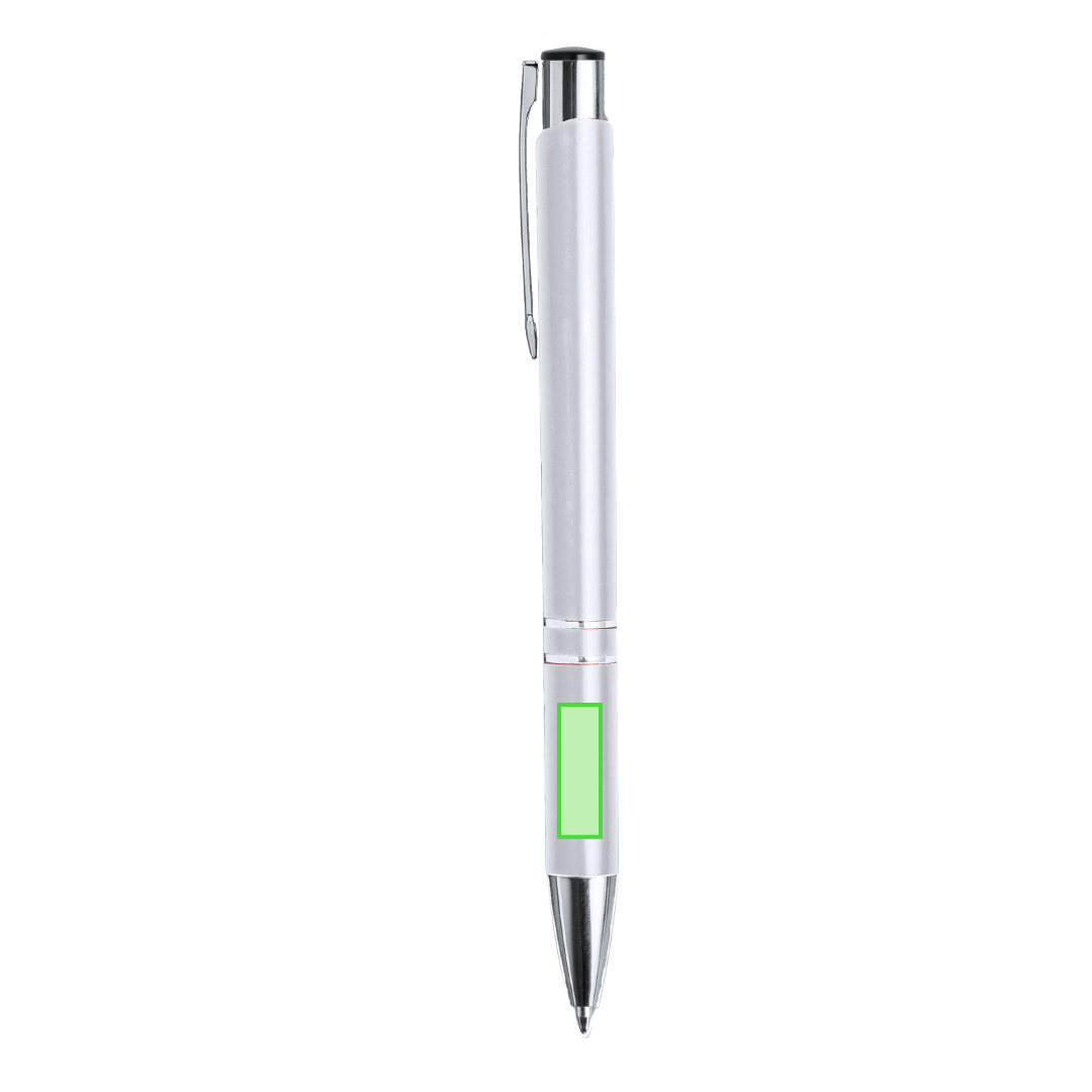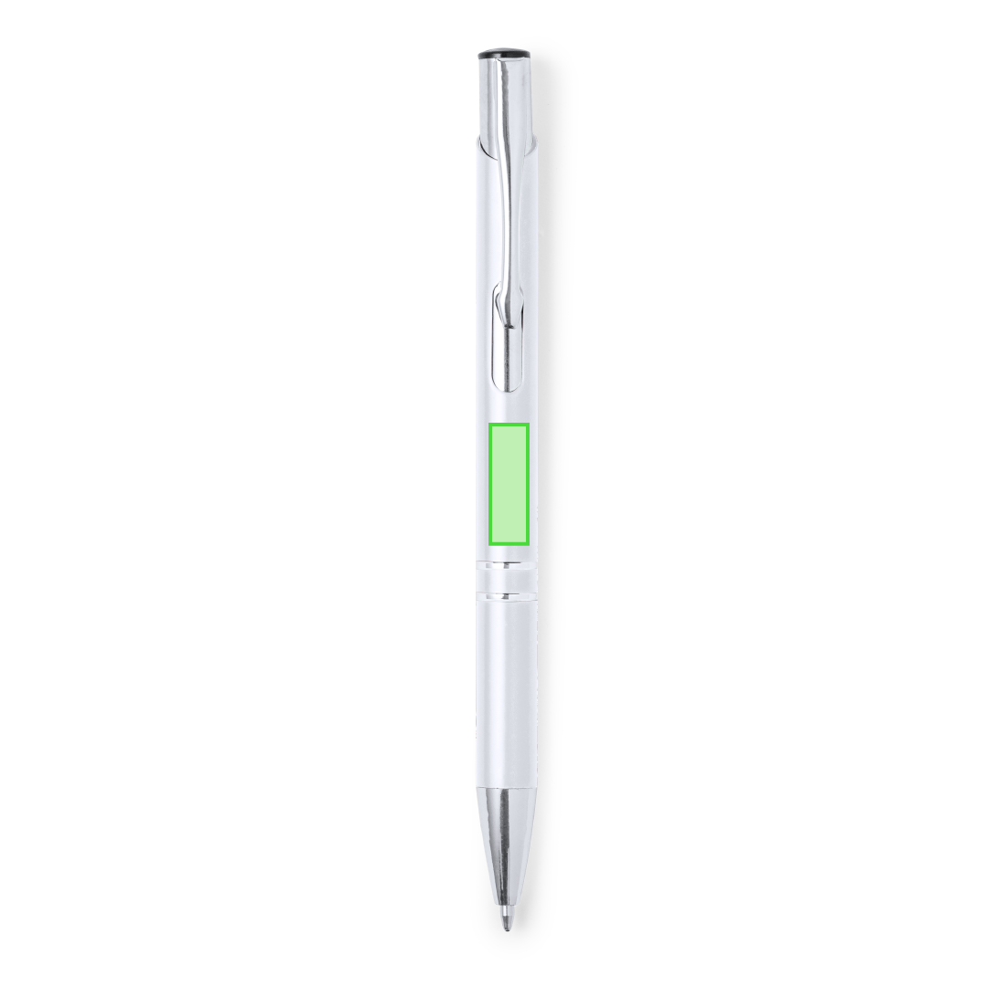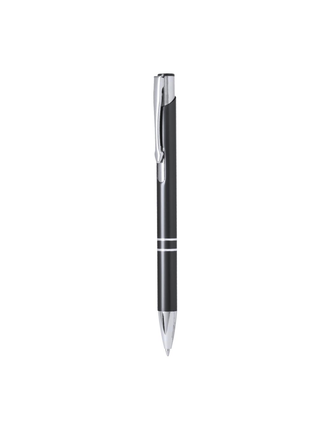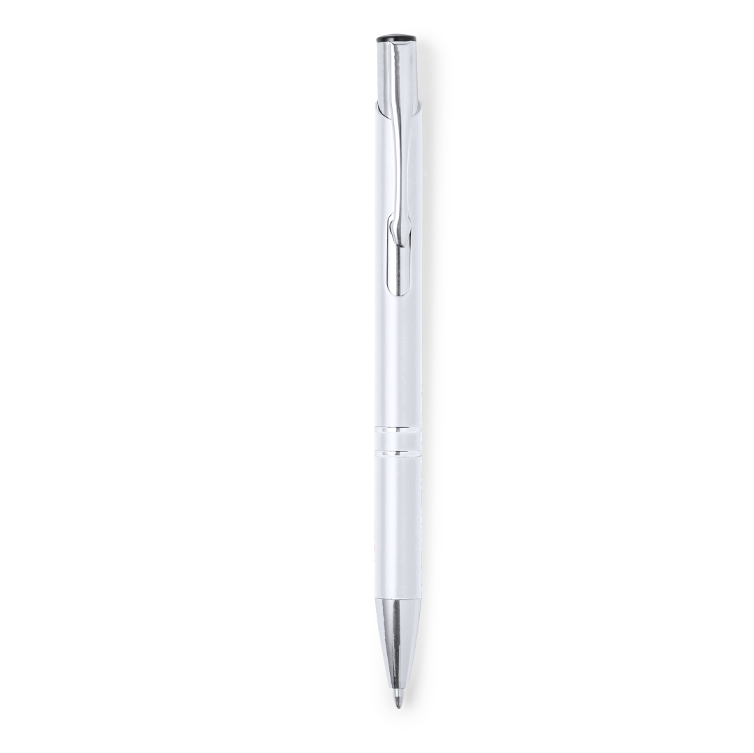 Bolígrafo de mecanismo pulsador fabricado en aluminio. Incluye accesorios plateados y clip, pulsador y punta a juego.En tinta negra.