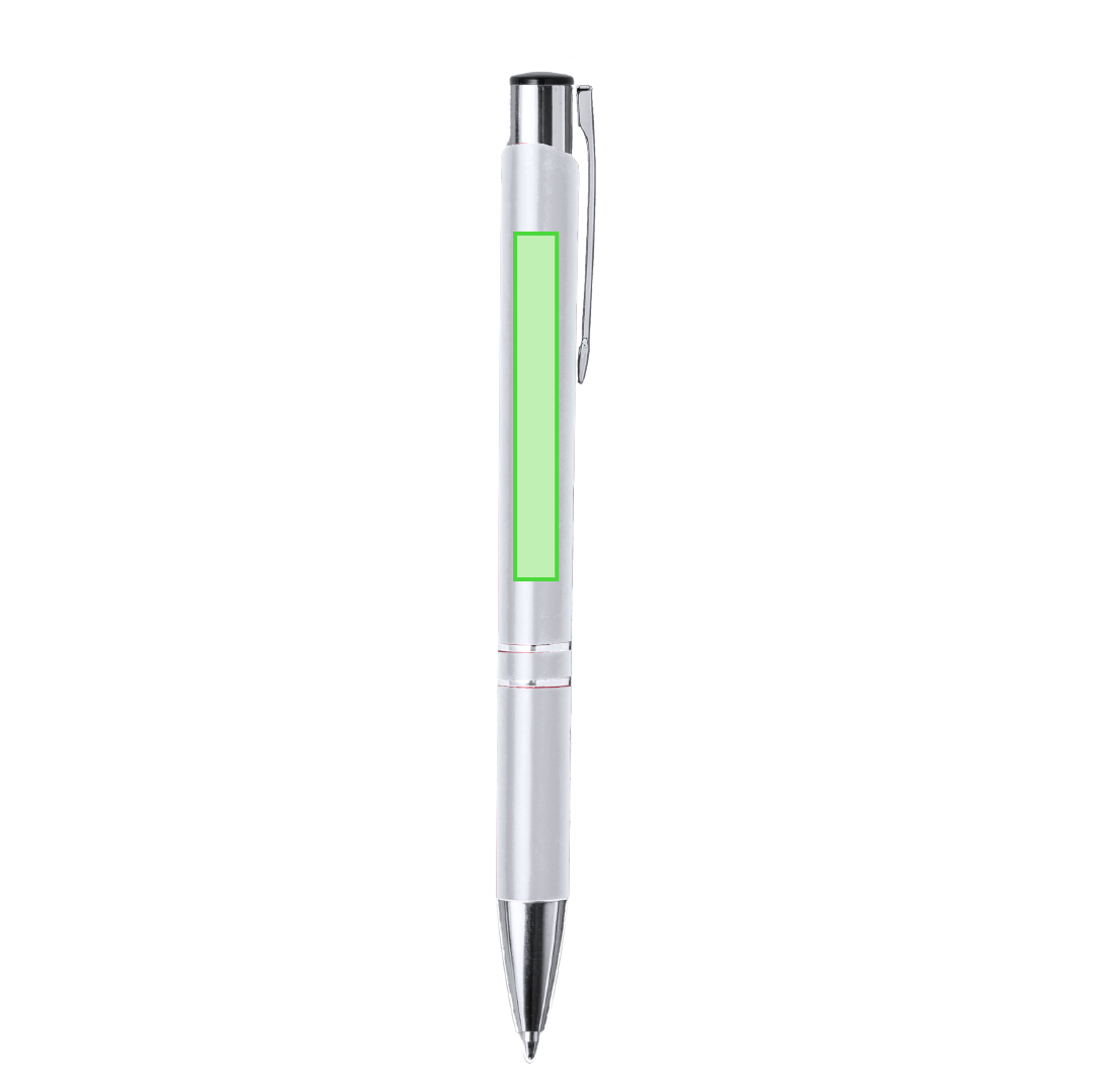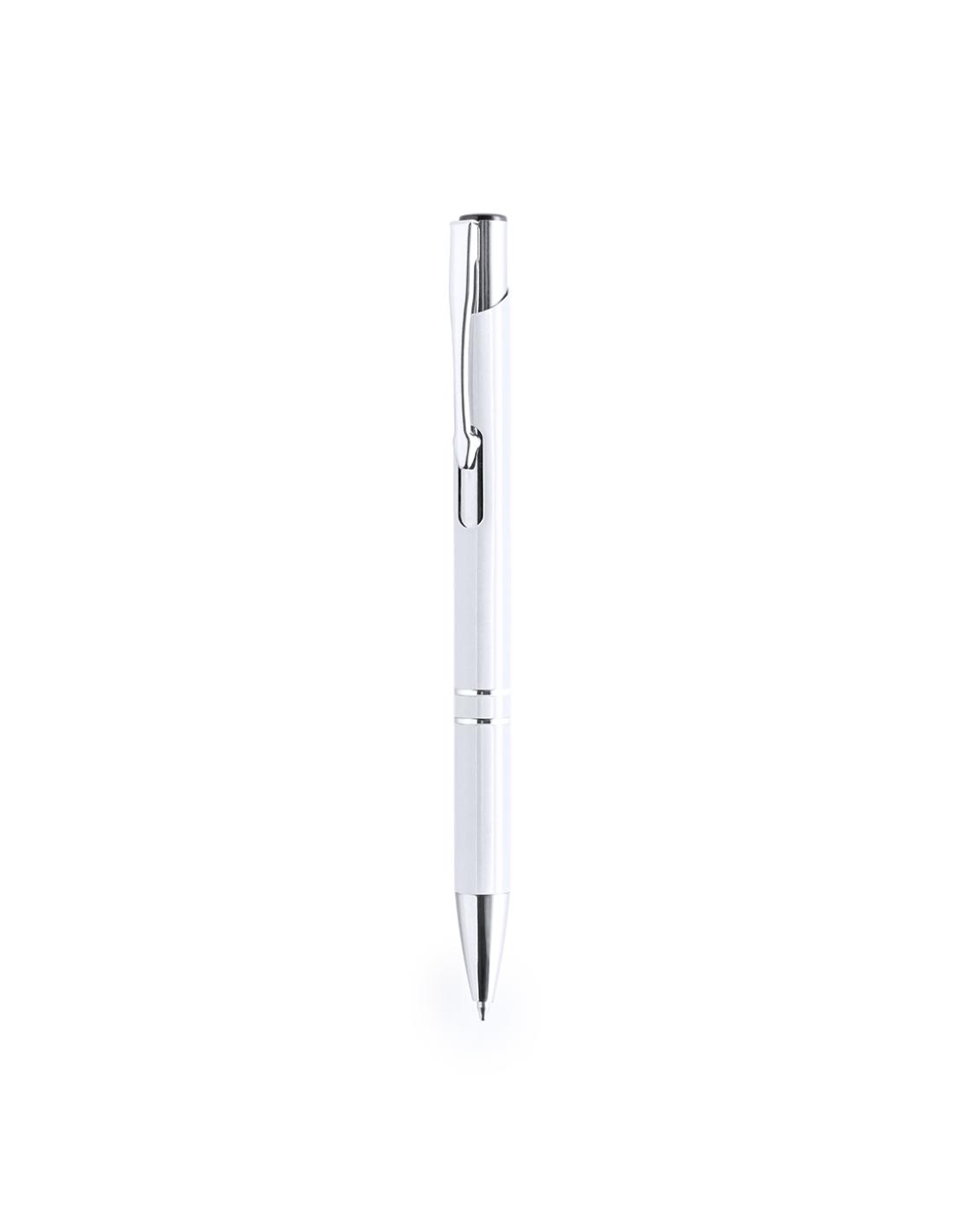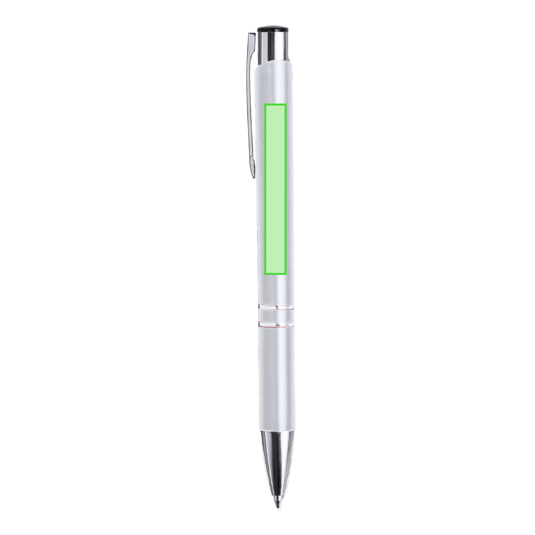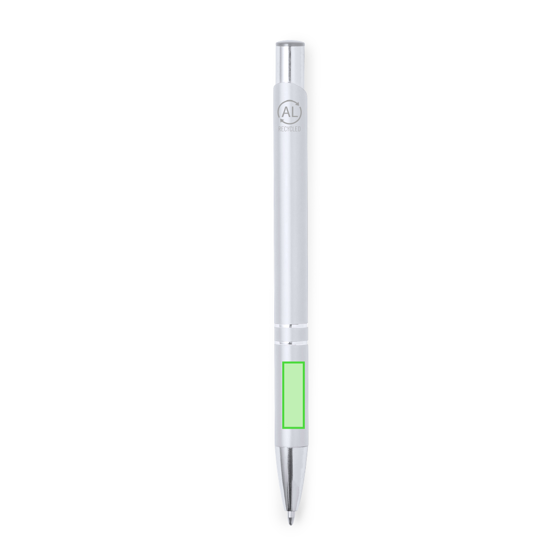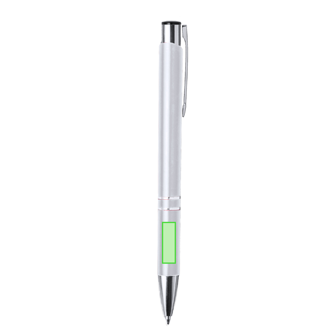 Bolígrafo de mecanismo pulsador fabricado en aluminio. Incluye accesorios plateados y clip, pulsador y punta a juego.En tinta negra.