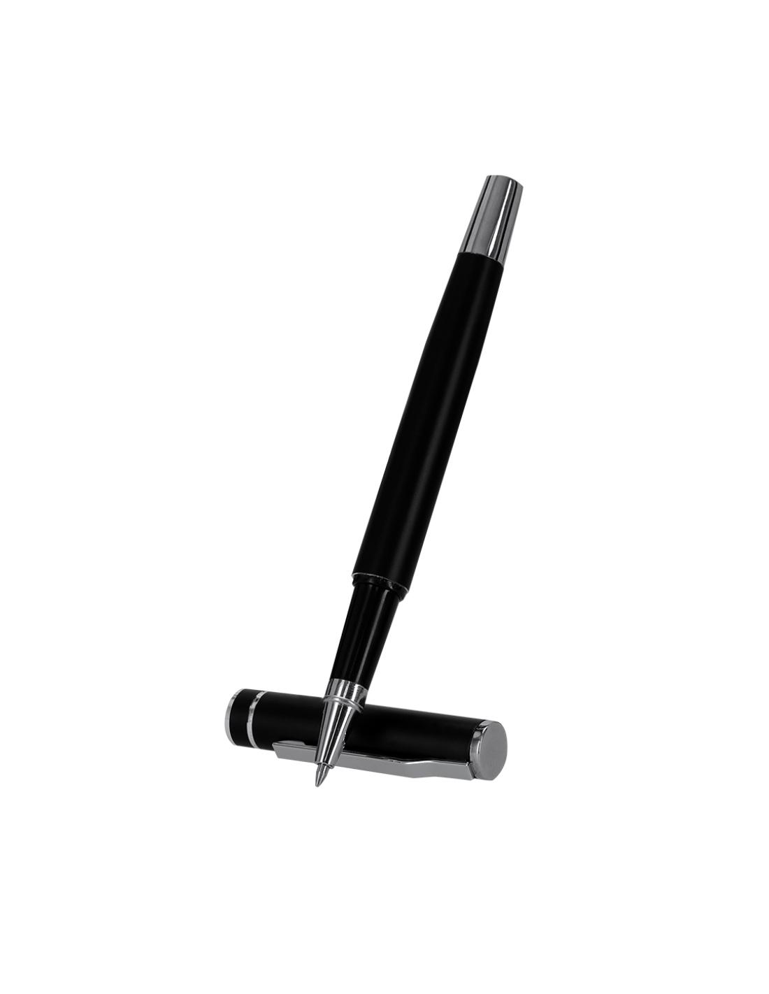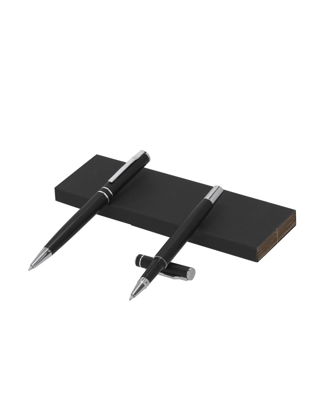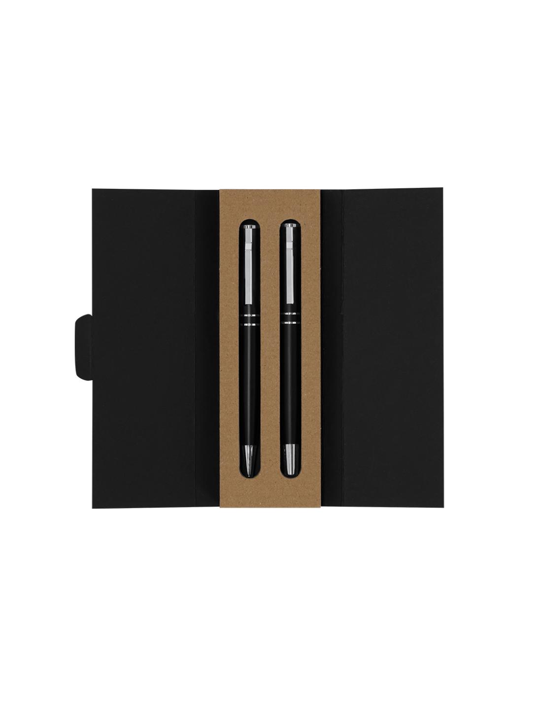 Set de bolígrafo y roller fabricados en Aluminio Reciclado, en elegante diseño negro mate con distinguidos accesorios en acabado plateado. Bolígrafo de mecanismo pulsador y roller con capucha, ambos con clip metálico. En tinta azul y logotipo de Aluminio Reciclado. Presentación en elegante estuche negro.