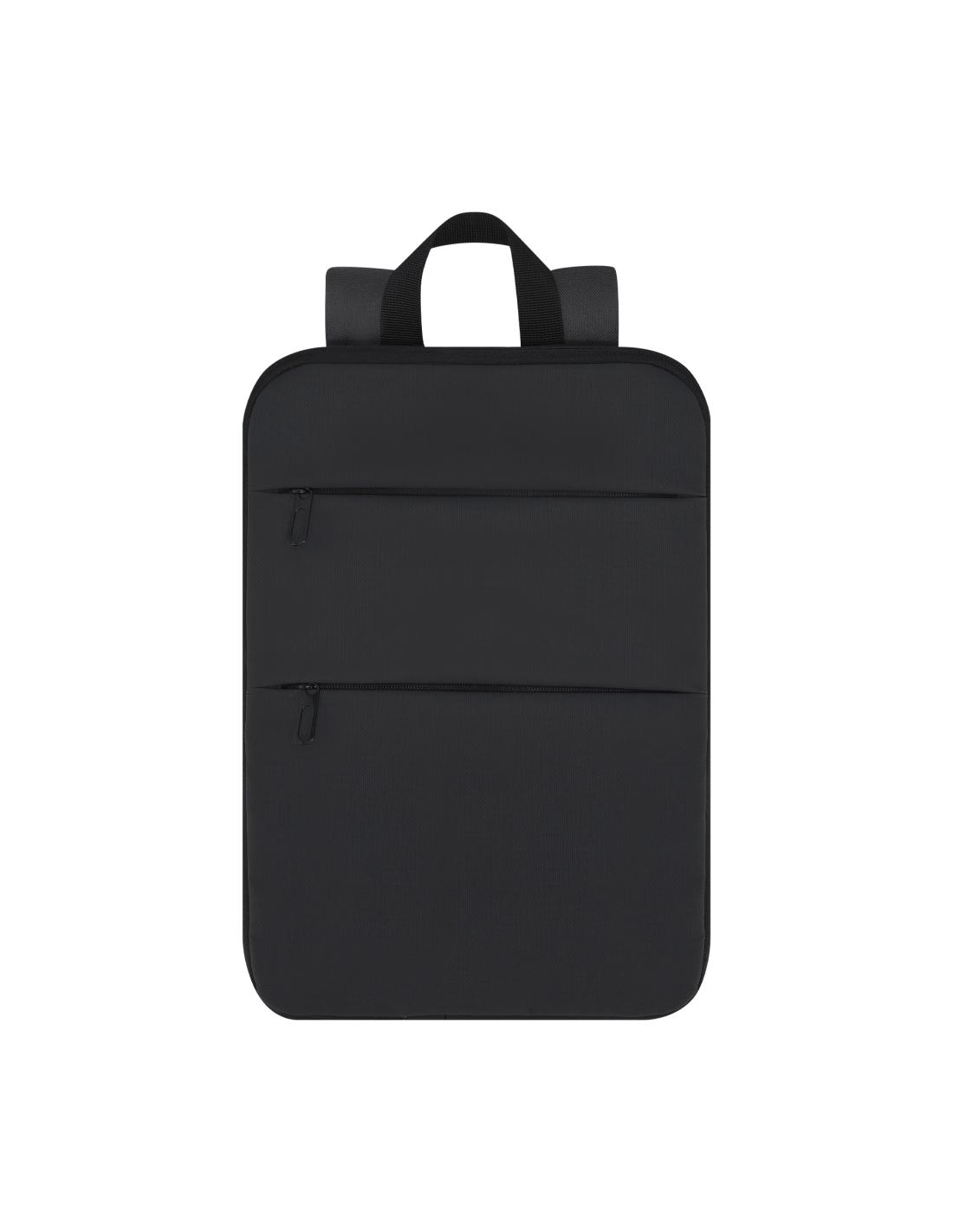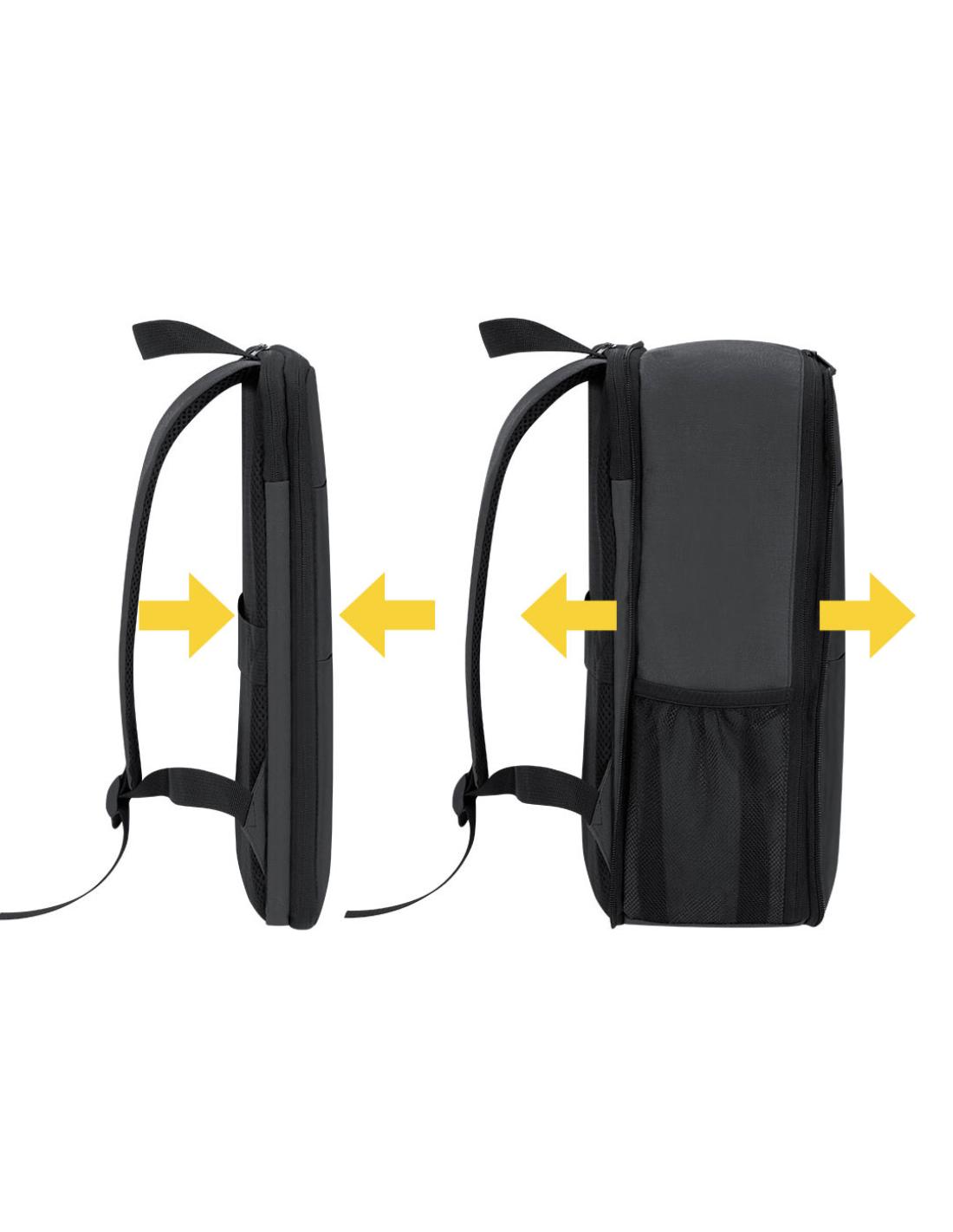 Mochila extensible confeccionada en resistente PU/ poliéster 600D. Equipada con cierre de cremallera de doble tirador, con posibilidad para ampliar la capacidad. Con dos compartimentos frontales y compartimento interior acolchado para portátil de hasta 15 pulgadas. Bolsillo lateral. Cómodas cintas de hombros acolchadas, transpirables y ajustables. Incluye cinta para fijarla en trolley y maletas.