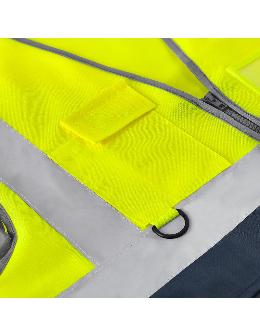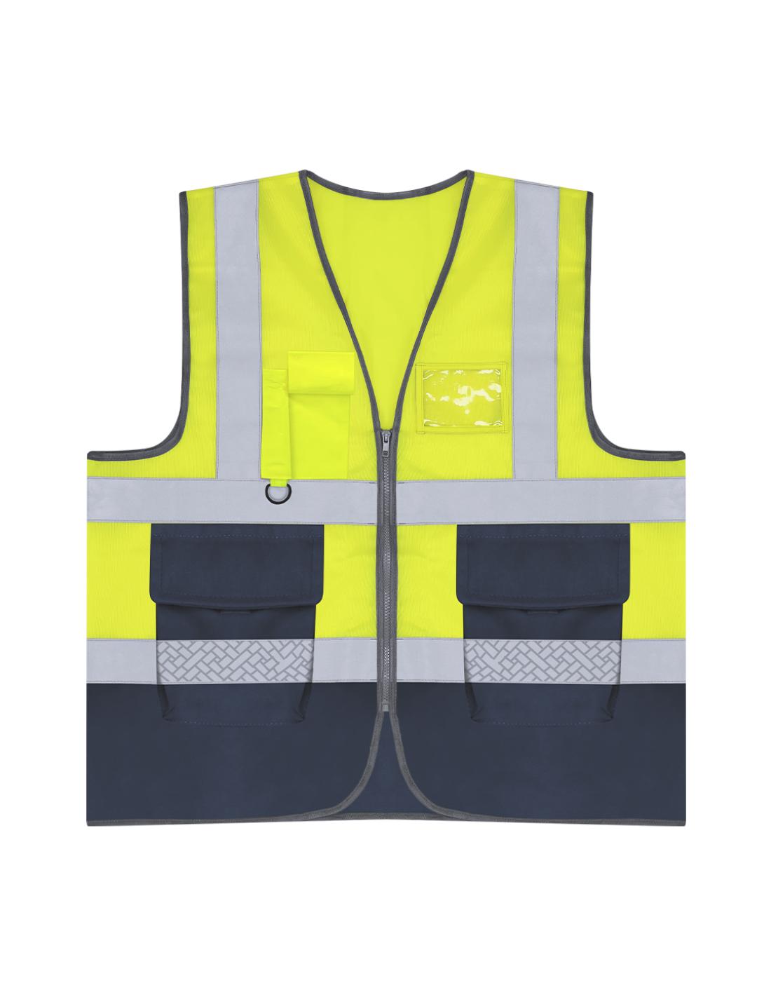 Chaleco de alta visibilidad con diseño bicolor. Incorpora dos bandas reflectantes horizontales en el cuerpo y dos adicionales en los hombros, mejorando la visibilidad en condiciones de baja luminosidad.Cuenta con cierre frontal de cremallera y varios bolsillos funcionales:- Dos bolsillos frontales laterales (16 x 18,5 cm)- Bolsillo superior derecho con cierre de velcro (6,5 x 15 cm)- Compartimento para tarjeta identificativa (10,5 x 8 cm)-Anilla plástica en el bolsillo superior, ideal para enganchar llaves o accesorios