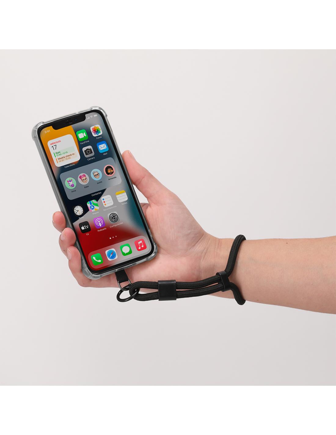 Pulsera soporte fabricada en suave poliéster. Accesorio de transporte para situar entre la funda y el smartphone, con accesorio plástico para ajuste en muñeca.