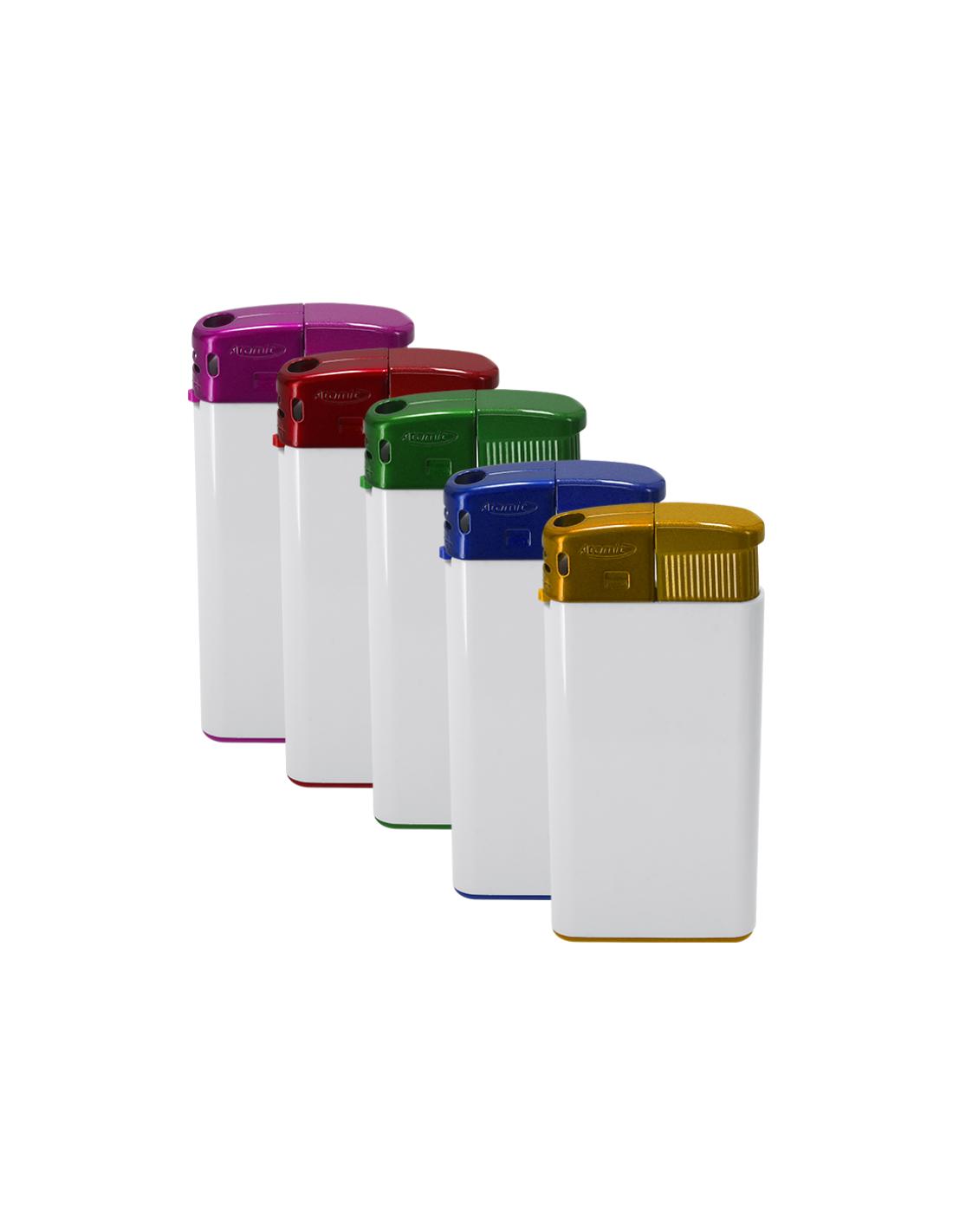 Encendedor a gas de mecanismo eléctrico fabricado en ABS. Con protección infantil, recargable, regulador de llama y disponible en variada gama de colores de acabado sólido, cuerpo en acabado blanco brillante. Servidos en cajas de 25 unidades de 5 colores.